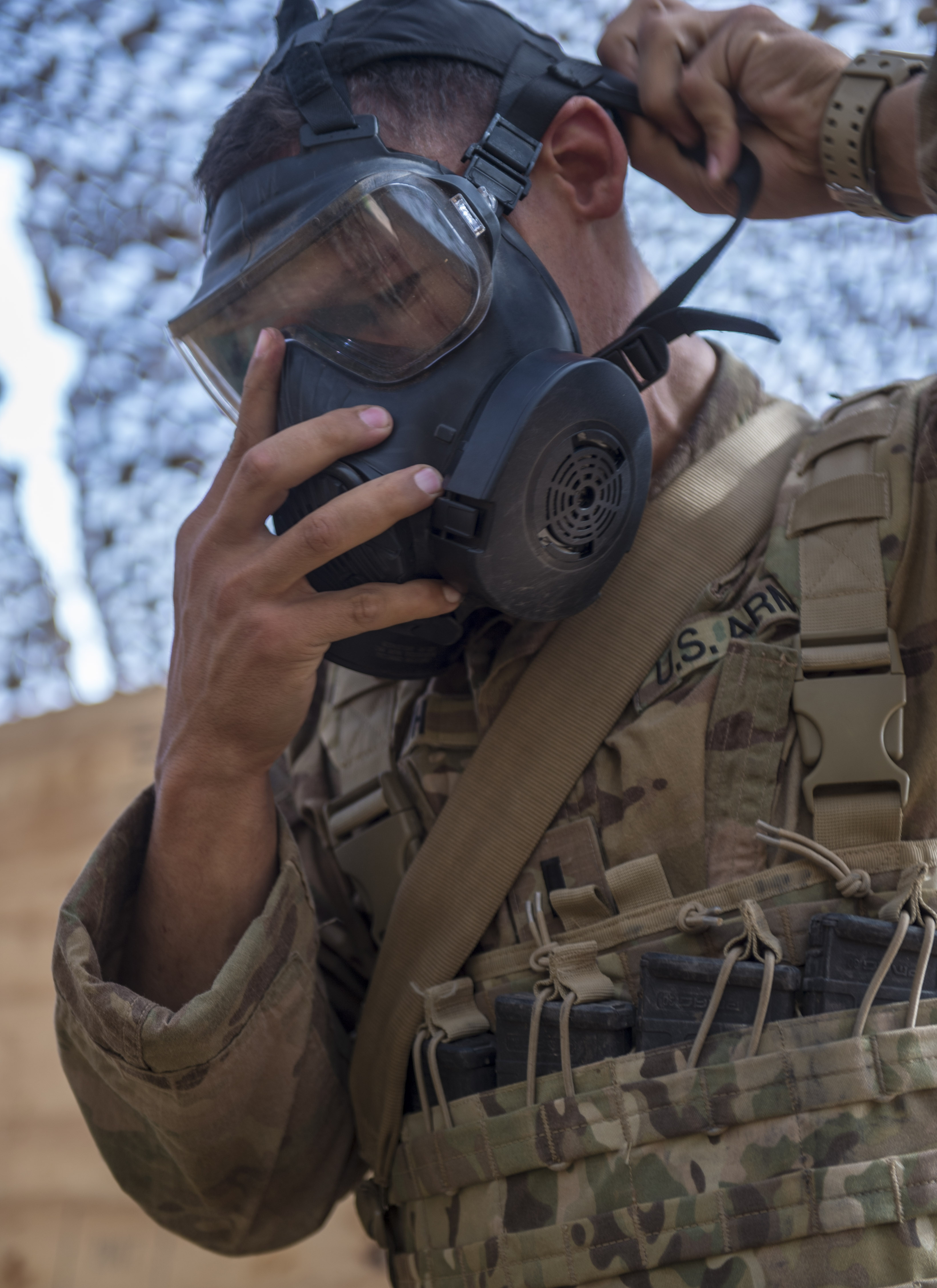 A U.S. Army Soldier assigned to Combined Joint Task Force - Horn of Africa puts on a gas mask during training in preparation for an Expert Infantryman Badge evaluation at Camp Lemonnier, Djibouti, Jan. 24, 2018. After two weeks of training and five days of testing, 50 Soldiers completed the process to earn the coveted special skills badge that requires Soldiers to perform an Army Physical Fitness Test, day and night land navigation, a 12-mile forced march, and 30 individual tasks covering weapons, medical, and security patrol skills. (U.S. Air Force photo by Staff Sgt. Timothy Moore)