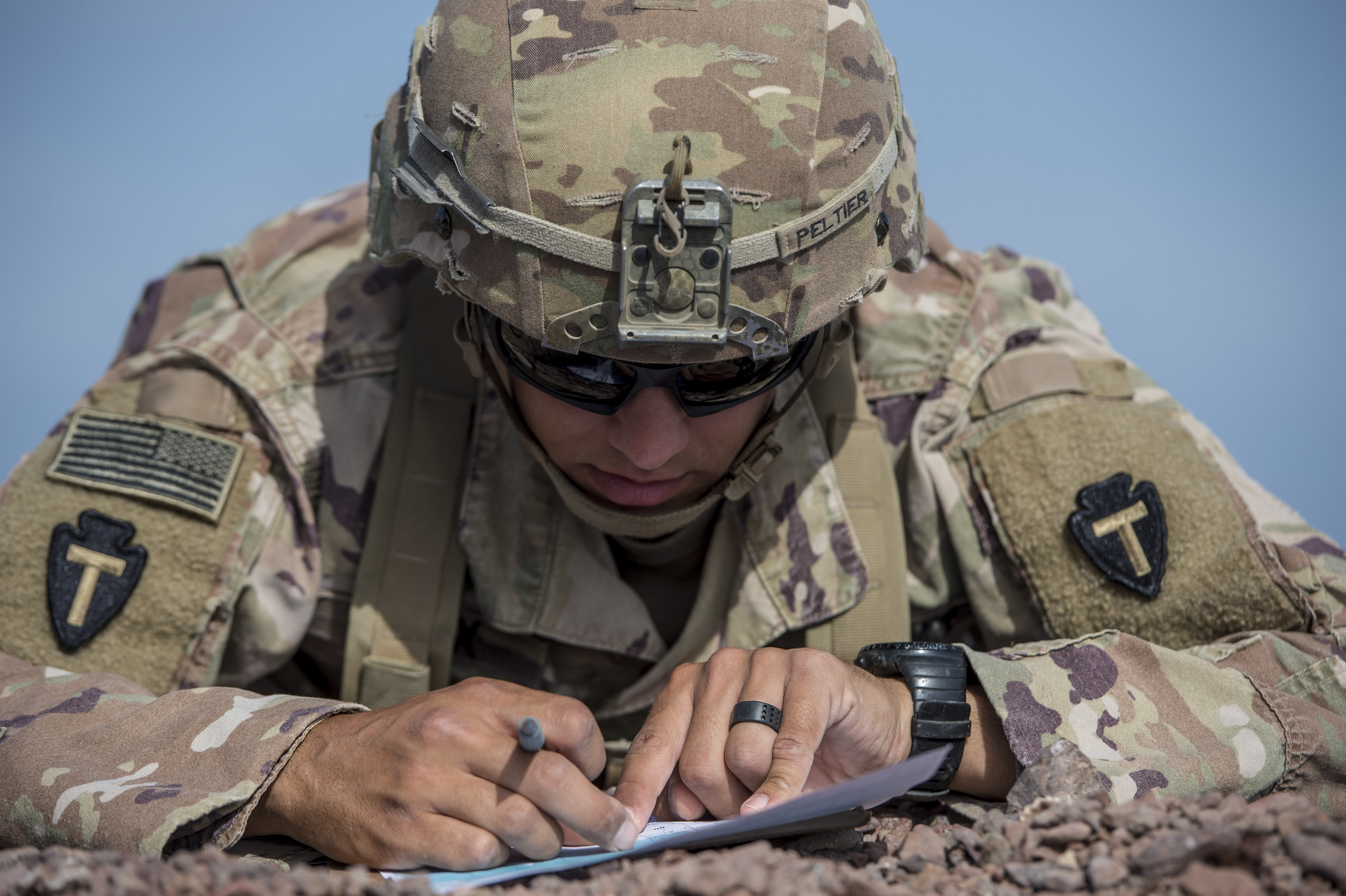 A U.S. Army Soldier assigned to Combined Joint Task Force - Horn of Africa plots a grid point during land navigation training in preparation for an Expert Infantryman Badge evaluation at Arta Range, Djibouti, Jan. 25, 2018. After two weeks of training and five days of testing, 50 Soldiers completed the process to earn the coveted special skills badge that requires Soldiers to perform an Army Physical Fitness Test, day and night land navigation, a 12-mile forced march, and 30 individual tasks covering weapons, medical, and security patrol skills. (U.S. Air Force photo by Staff Sgt. Timothy Moore)