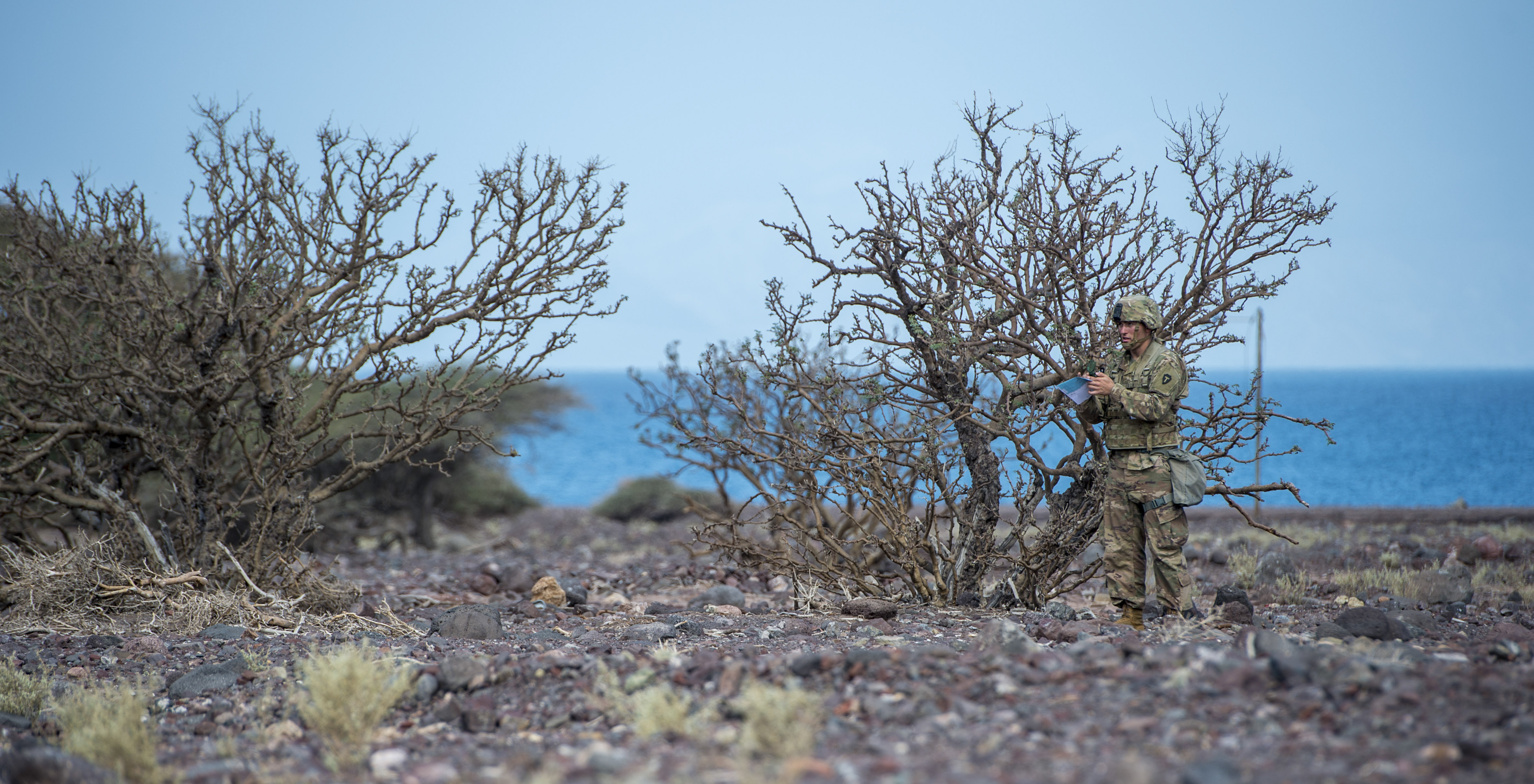 A U.S. Army Soldier assigned to Combined Joint Task Force - Horn of Africa uses a compass to locate a grid point during land navigation training in preparation for an Expert Infantryman Badge evaluation at Arta Range, Djibouti, Jan. 25, 2018. After two weeks of training and five days of testing, 50 Soldiers completed the process to earn the coveted special skills badge that requires Soldiers to perform an Army Physical Fitness Test, day and night land navigation, a 12-mile forced march, and 30 individual tasks covering weapons, medical, and security patrol skills. (U.S. Air Force photo by Staff Sgt. Timothy Moore)