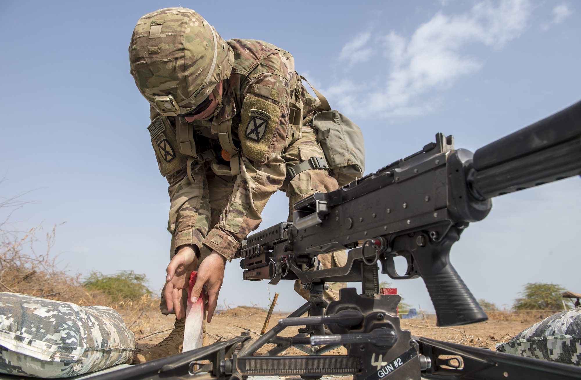 A U.S. Army Soldier assigned to Combined Joint Task Force - Horn of Africa puts a firing stake in the ground for a mounted M240B machine gun during training for an Expert Infantryman Badge evaluation at Camp Lemonnier, Djibouti, Jan. 24, 2018. The stake is used as a reference point for the firing zone as he prepares to set up a defensive position. After two weeks of training and five days of testing, 50 Soldiers completed the process to earn the coveted special skills badge that requires Soldiers to perform an Army Physical Fitness Test, day and night land navigation, a 12-mile forced march, and 30 individual tasks covering weapons, medical, and security patrol skills. (U.S. Air Force photo by Staff Sgt. Timothy Moore)