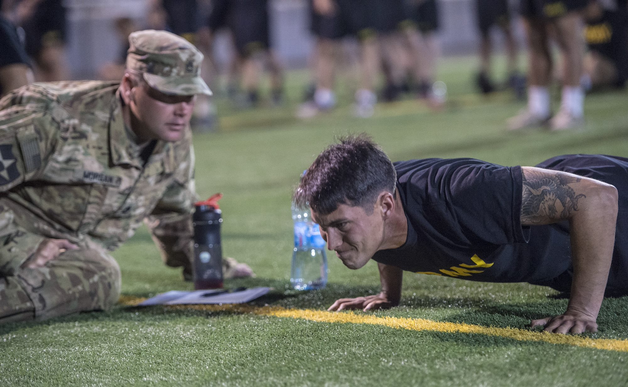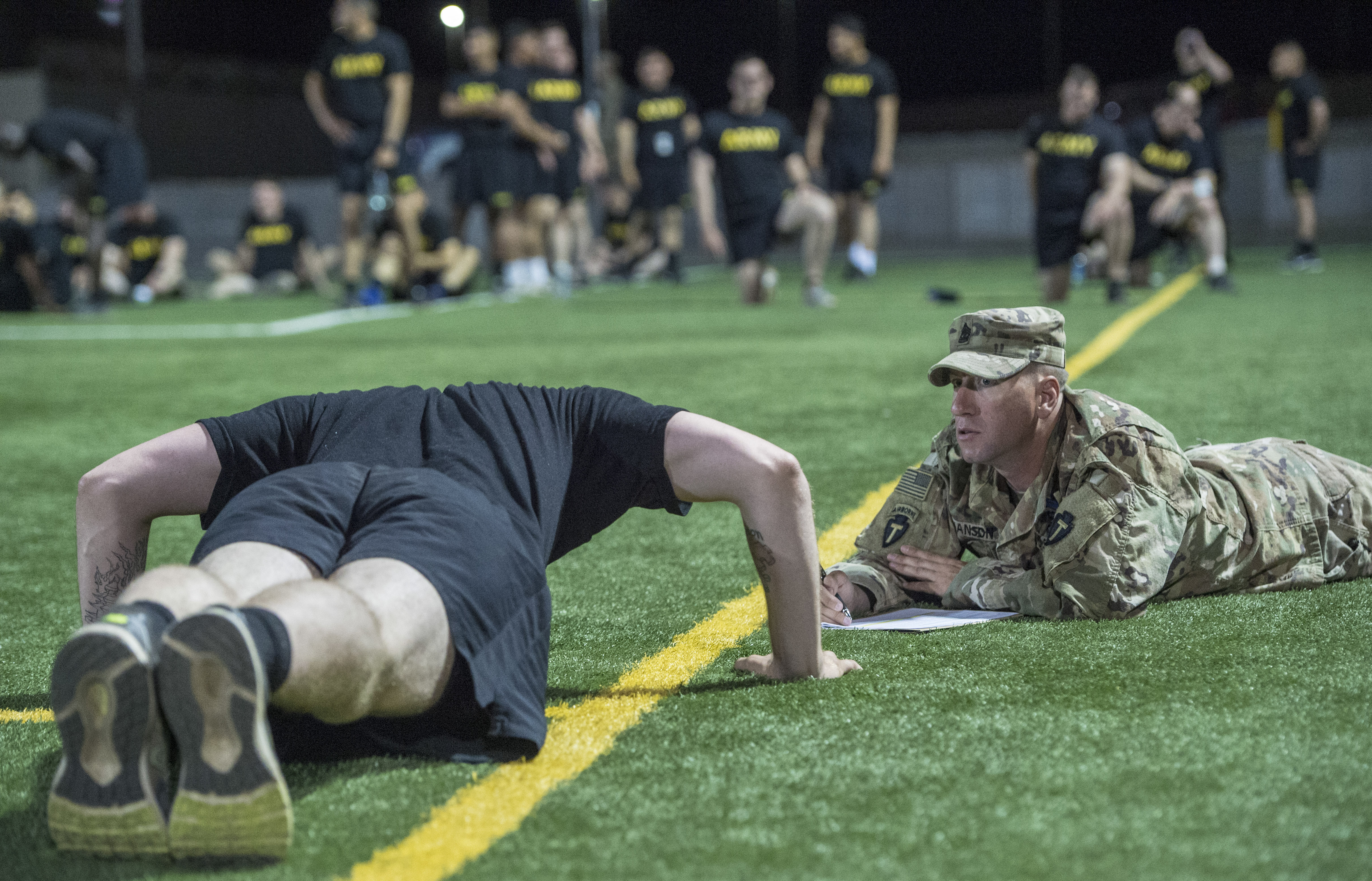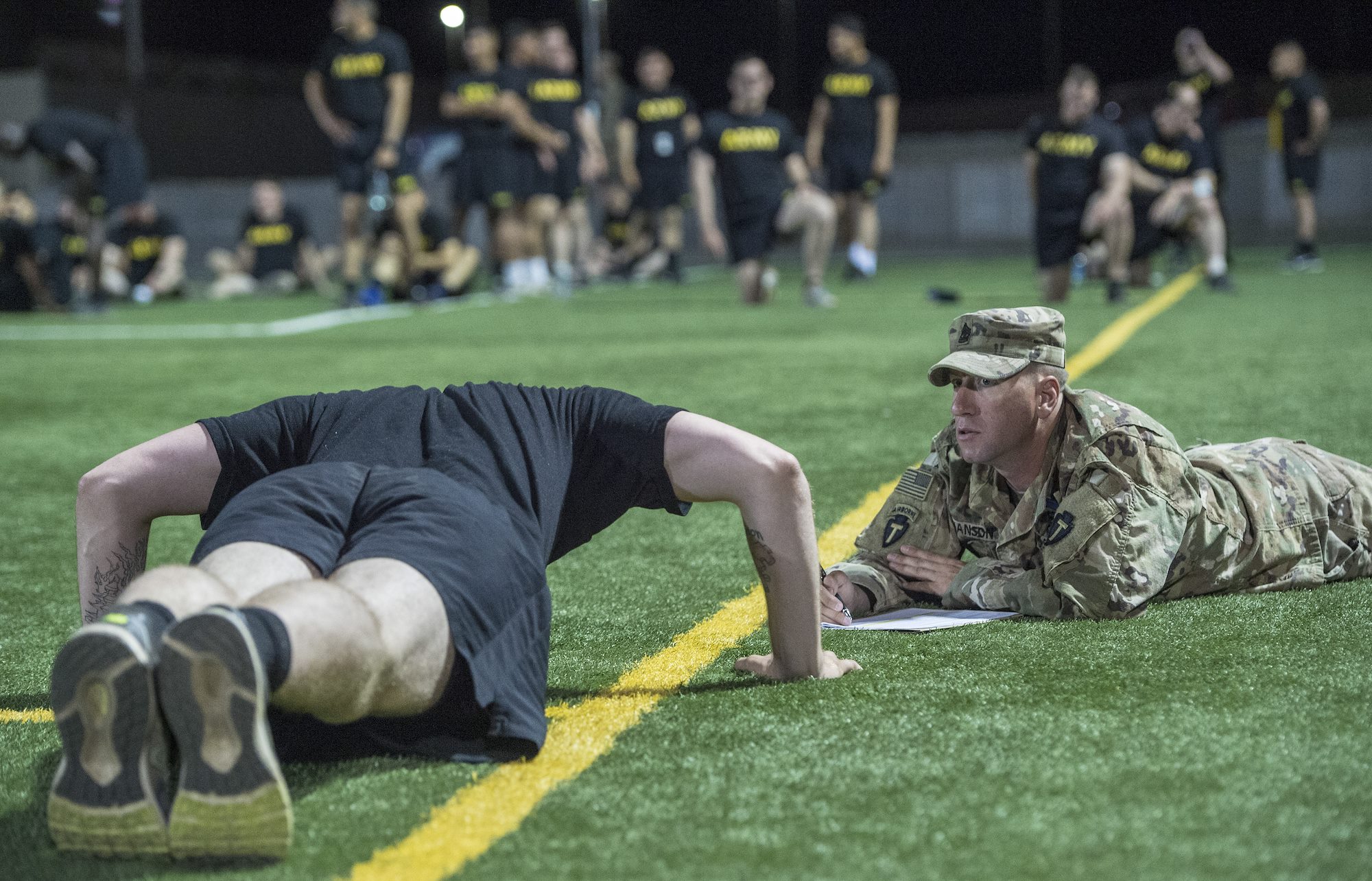 U.S. Army Soldiers assigned to Combined Joint Task Force - Horn of Africa perform pushups during the Army Physical Fitness Test portion of an Expert Infantryman Badge evaluation at Camp Lemonnier, Djibouti, Jan. 29, 2018. After two weeks of training and five days of testing, 50 Soldiers completed the process to earn the coveted special skills badge that requires Soldiers to perform an Army Physical Fitness Test, day and night land navigation, a 12-mile forced march, and 30 individual tasks covering weapons, medical, and security patrol skills. (U.S. Air Force photo by Staff Sgt. Timothy Moore)