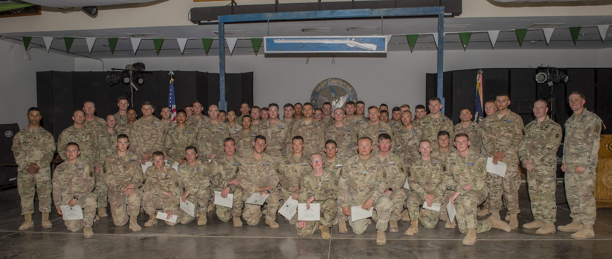 U.S. Army Soldiers assigned to Combined Joint Task Force - Horn of Africa pose for a photo after receiving their Expert Infantryman Badge during a ceremony at Camp Lemonnier, Djibouti, Feb. 2, 2018. After two weeks of training and five days of testing, 50 Soldiers completed the process to earn the coveted special skills badge that requires Soldiers to perform an Army Physical Fitness Test, day and night land navigation, a 12-mile forced march, and 30 individual tasks covering weapons, medical, and security patrol skills. (U.S. Air Force photo by Staff Sgt. Timothy Moore)