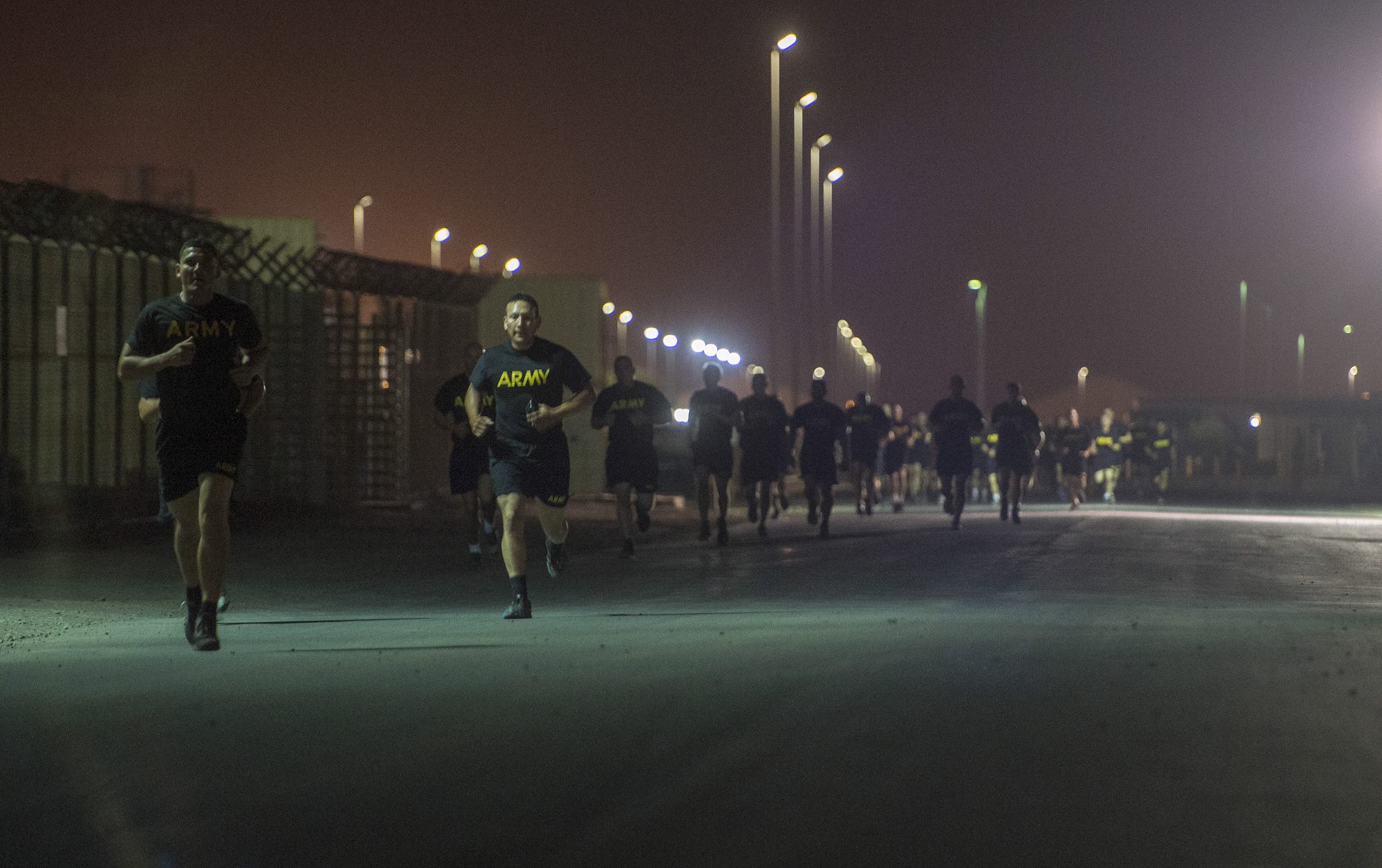 U.S. Army Soldiers assigned to Combined Joint Task Force - Horn of Africa run during the Army Physical Fitness Test portion of an Expert Infantryman Badge evaluation at Camp Lemonnier, Djibouti, Jan. 29, 2018. After two weeks of training and five days of testing, 50 Soldiers completed the process to earn the coveted special skills badge that requires Soldiers to perform an Army Physical Fitness Test, day and night land navigation, a 12-mile forced march, and 30 individual tasks covering weapons, medical, and security patrol skills. (U.S. Air Force photo by Staff Sgt. Timothy Moore)