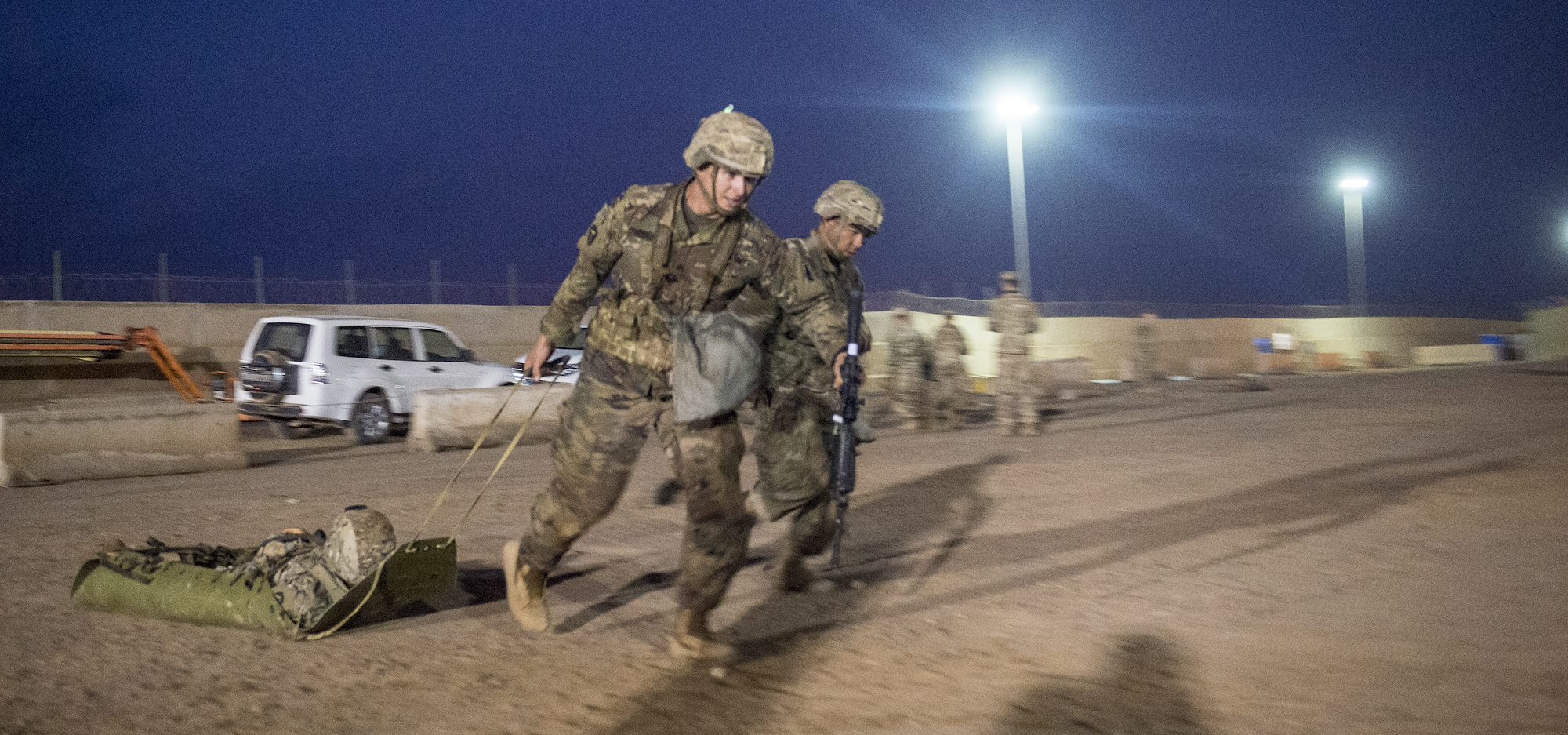 A U.S. Army Soldier assigned to Combined Joint Task Force - Horn of Africa pulls a simulated casualty during a task that requires the evacuation and treatment of a casualty, part of an Expert Infantryman Badge evaluation at Camp Lemonnier, Djibouti, Feb. 2, 2018. After two weeks of training and five days of testing, 50 Soldiers completed the process to earn the coveted special skills badge that requires Soldiers to perform an Army Physical Fitness Test, day and night land navigation, a 12-mile forced march, and 30 individual tasks covering weapons, medical, and security patrol skills. (U.S. Air Force photo by Staff Sgt. Timothy Moore)