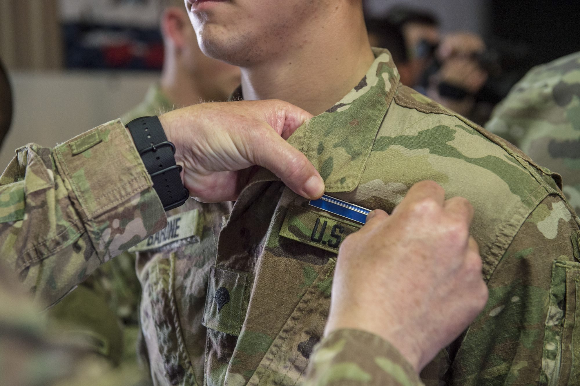 A U.S. Army Soldier assigned to Combined Joint Task Force – Horn of Africa receives his Expert Infantryman Badge during the badge ceremony at Camp Lemonnier, Djibouti, Feb. 2, 2018. After two weeks of training and five days of testing, 50 Soldiers completed the process to earn the coveted special skills badge that requires Soldiers to perform an Army Physical Fitness Test, day and night land navigation, a 12-mile forced march, and 30 individual tasks covering weapons, medical, and security patrol skills. (U.S. Air Force photo by Staff Sgt. Timothy Moore)