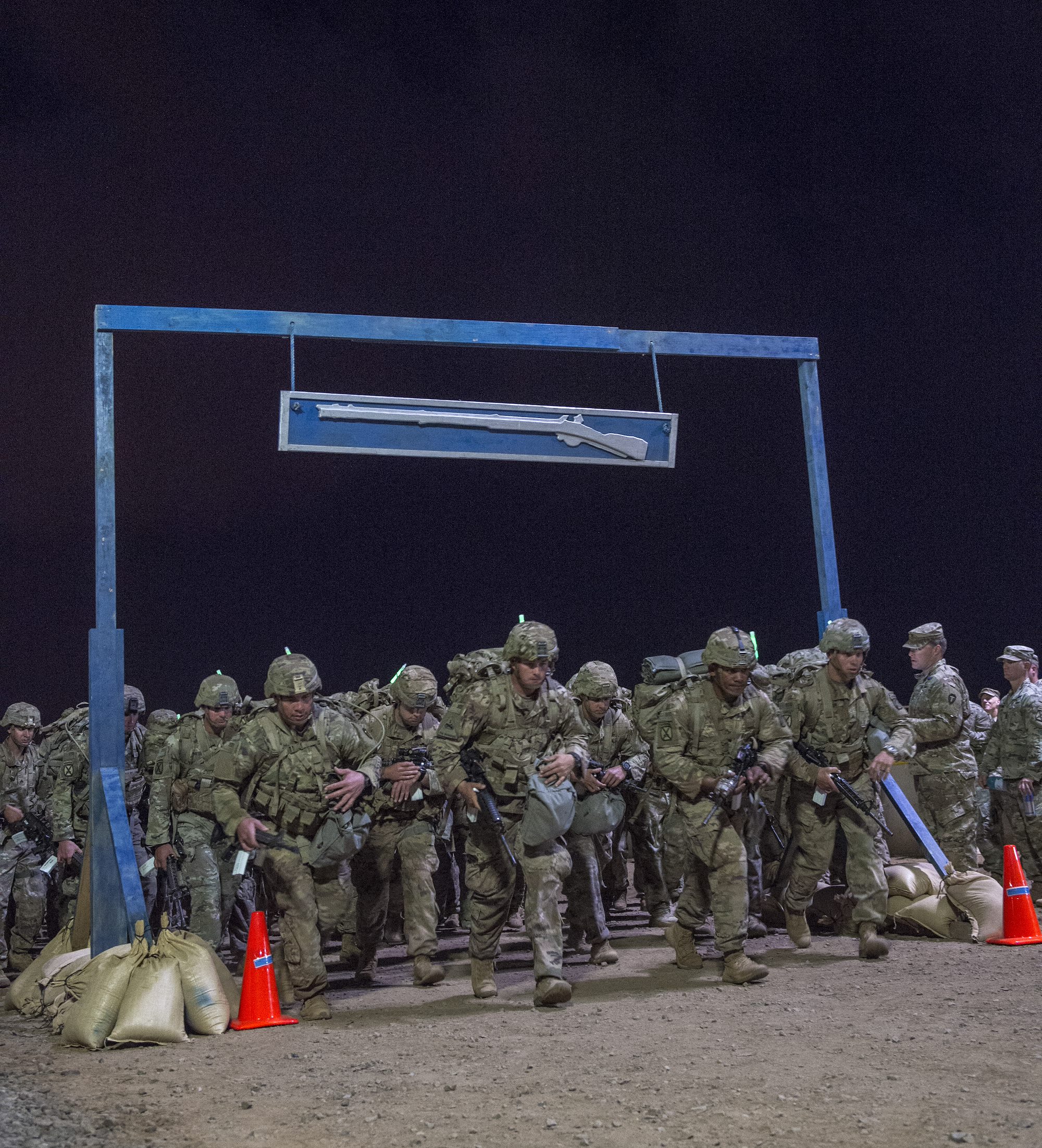 U.S. Army Soldiers assigned to Combined Joint Task Force - Horn of Africa begin the 12-mile march during an Expert Infantryman Badge evaluation at Camp Lemonnier, Djibouti, Feb. 2, 2018. After two weeks of training and five days of testing, 50 Soldiers completed the process to earn the coveted special skills badge that requires Soldiers to perform an Army Physical Fitness Test, day and night land navigation, a 12-mile forced march, and 30 individual tasks covering weapons, medical, and security patrol skills. (U.S. Air Force photo by Staff Sgt. Timothy Moore)