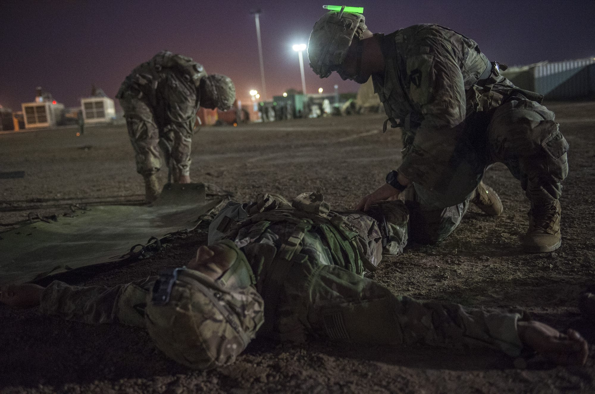 A U.S. Army Soldier assigned to Combined Joint Task Force - Horn of Africa applies a tourniquet to a simulated casualty during a task that requires the evacuation and treatment of a casualty, part of an Expert Infantryman Badge evaluation at Camp Lemonnier, Djibouti, Feb. 2, 2018. After two weeks of training and five days of testing, 50 Soldiers completed the process to earn the coveted special skills badge that requires Soldiers to perform an Army Physical Fitness Test, day and night land navigation, a 12-mile forced march, and 30 individual tasks covering weapons, medical, and security patrol skills. (U.S. Air Force photo by Staff Sgt. Timothy Moore)