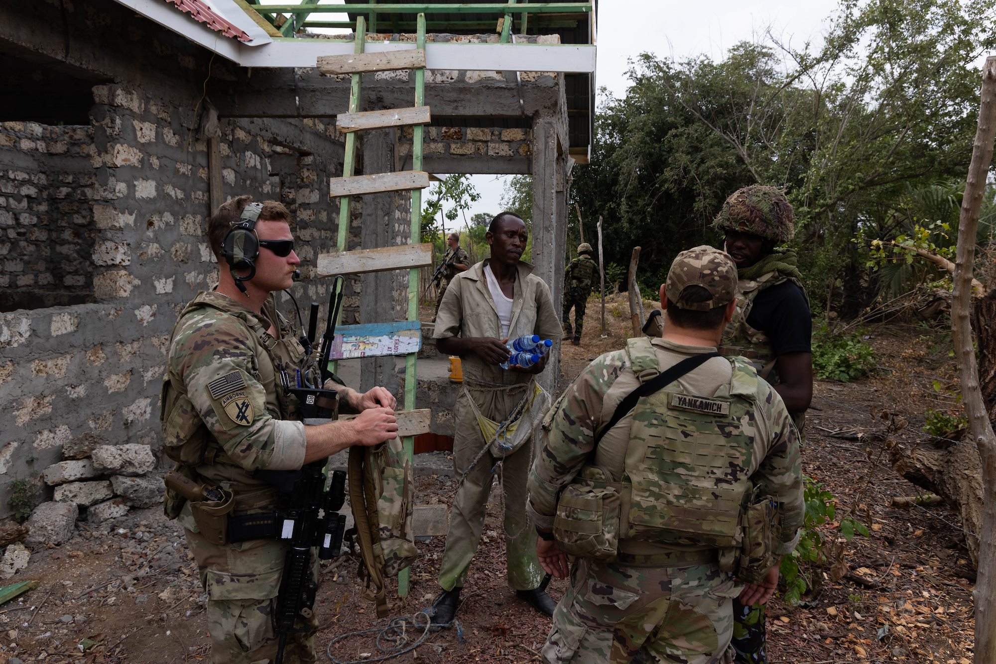 U.S. Army Soldiers assigned to Task Force Associator and Kenyan Marines conduct joint engagements with Kenyan locals during a patrol in Manda Bay, Kenya, March 2, 2025. TFAS routinely conducts knowledge exchanges and joint patrols to build capacity for partner nation independence with security. (U.S. Army photo by Cpl. Joey Ke)