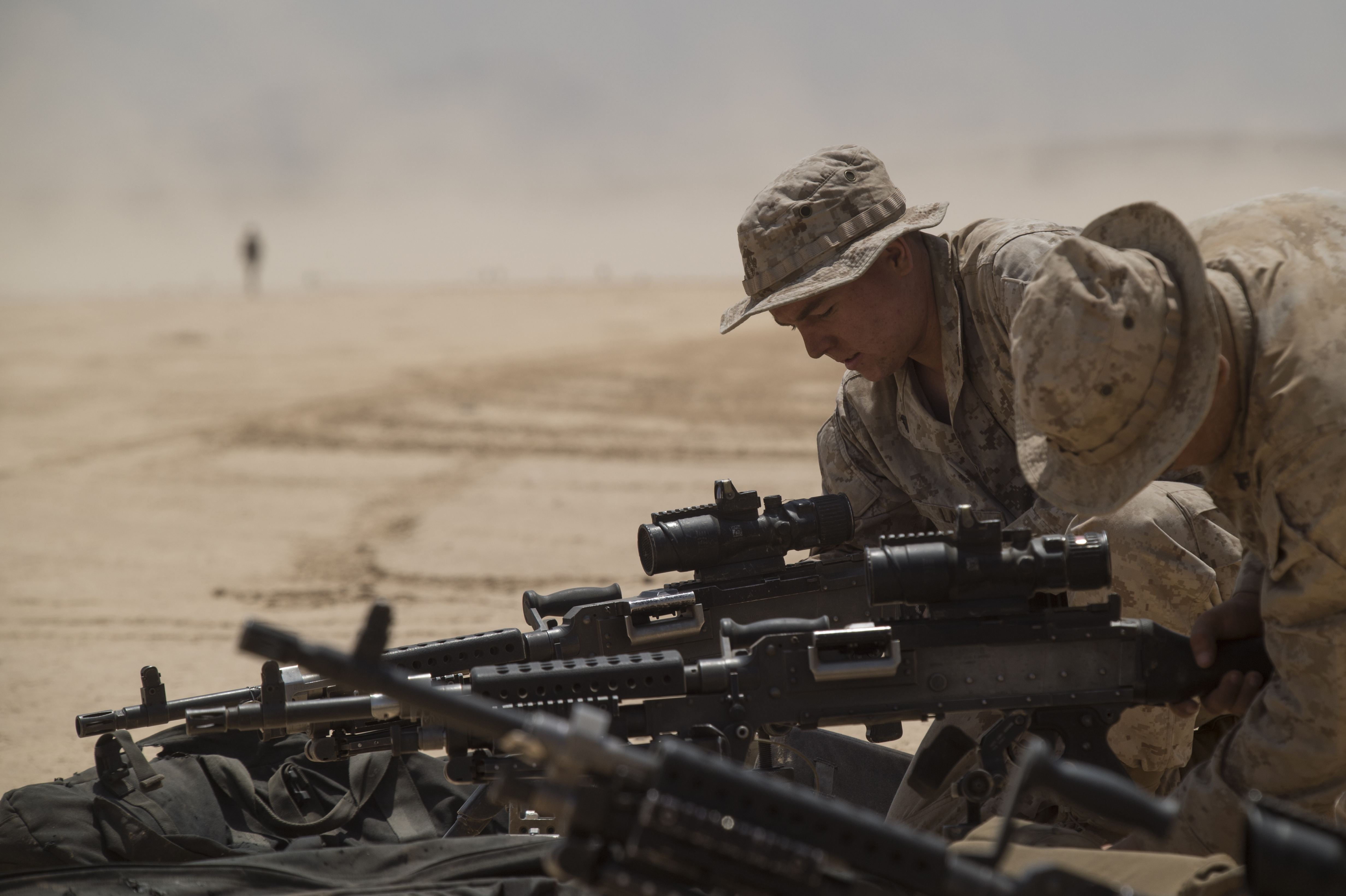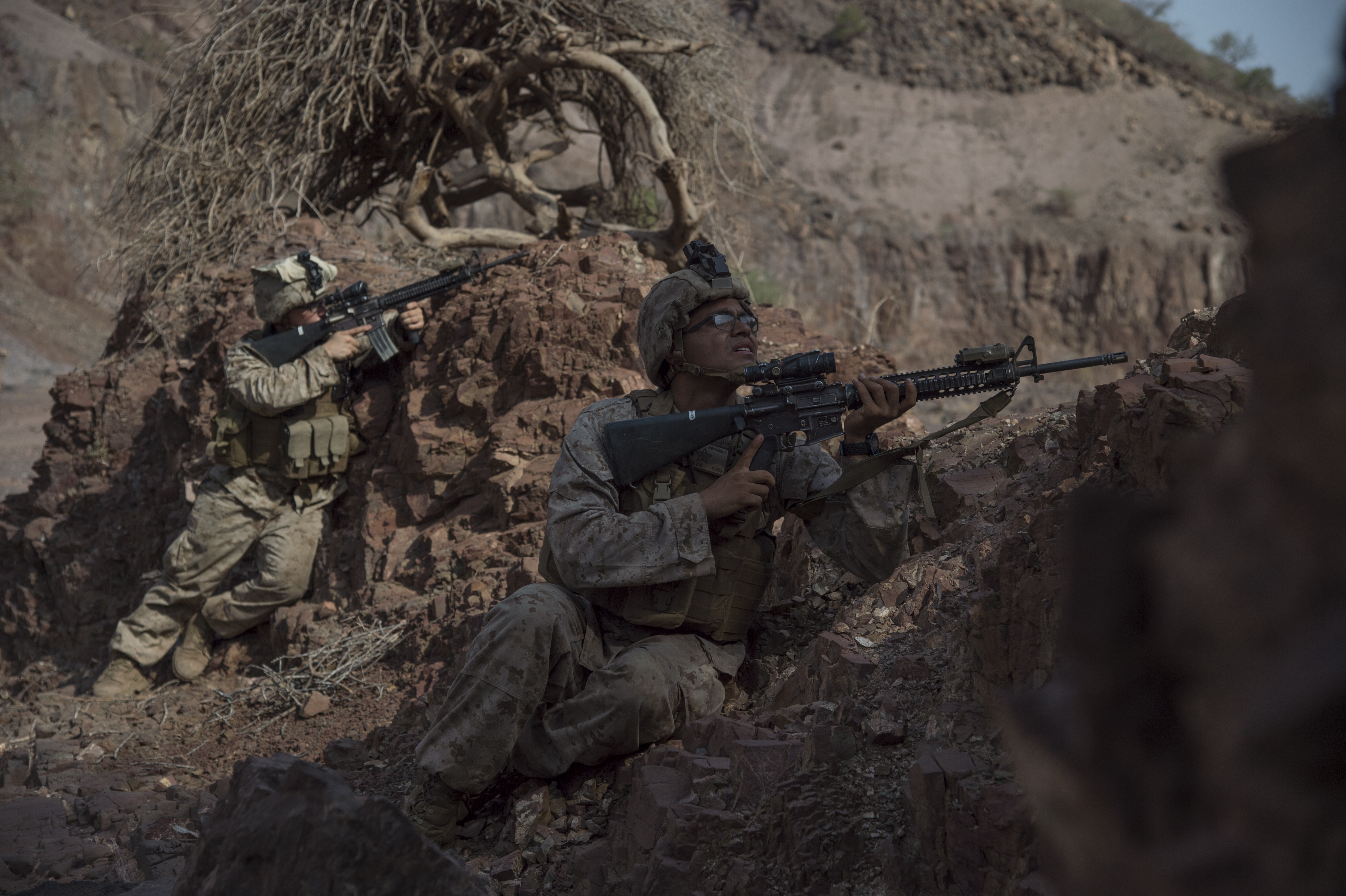 U.S. Marines from the 15th Marine Expeditionary Unit participate in Alligator Dagger, a two-week exercise that prepares incoming Naval Amphibious Forces and Task Force 51/5th Marine Expeditionary Unit's Amphibious Readiness Group/Marine Expeditionary Unit teams to integrate and synchronize warfighting capabilities for missions in the U.S. Central Command's area of operations. Through cooperation with U.S. Africa Command, Combined Joint Task Force - Horn of Africa, and the Djiboutian government, these Sailors and Marines made use of ranges near Camp Lemonnier, Djibouti, as well as used the camp's facilities and resources, to exercise amphibious assault capabilities and coordinate their efforts for successful joint operations. (U.S. Air National Guard photo by Tech. Sgt. Joe Harwood/Released)