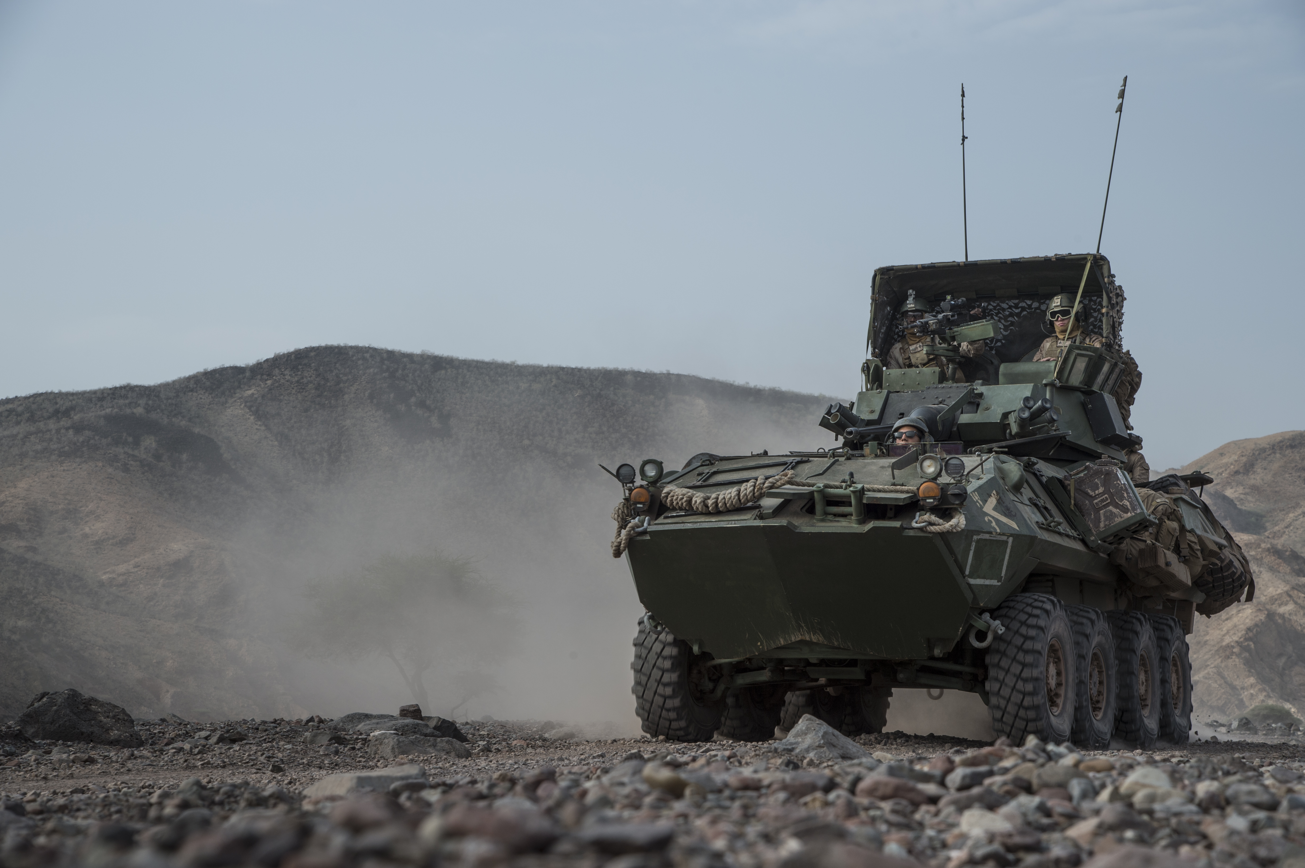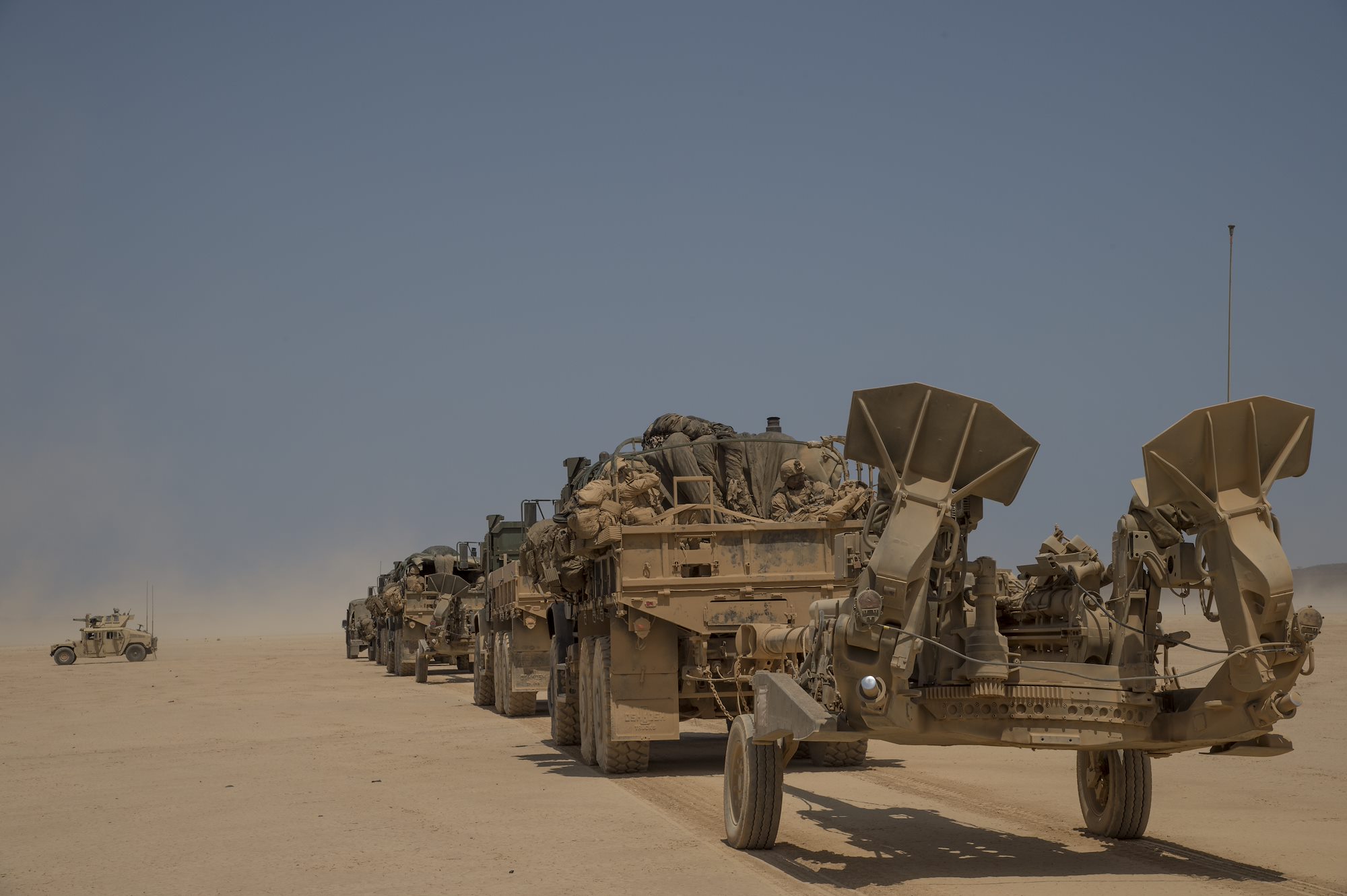 U.S. Marines from the 15th Marine Expeditionary Unit convoy troops and supplies during Alligator Dagger – a two-week exercise that prepares incoming Naval Amphibious Forces, Task Force 51/5th Marine Expeditionary Unit's Amphibious Ready Group/Marine Expeditionary Unit teams to integrate and synchronize warfighting capabilities in the U.S. Central Command's area of operations. Approximately 2,000 Sailors and Marines from the America-class amphibious assault ship USS America (LHA 6), the command ship for Amphibious Squadron (PHIBRON) 3; USS Pearl Harbor (LSD 52); USS San Diego (LPD 22); USS Lewis B. Puller (ESB 3); Battalion Landing Team 1/5; Aviation Combat Element VMM-161 (reinforced) and the Logistics Combat Element CLB-15 are participating in the third iteration of this exercise. (U.S. Air National Guard photo by Tech. Sgt. Joe Harwood/Released)