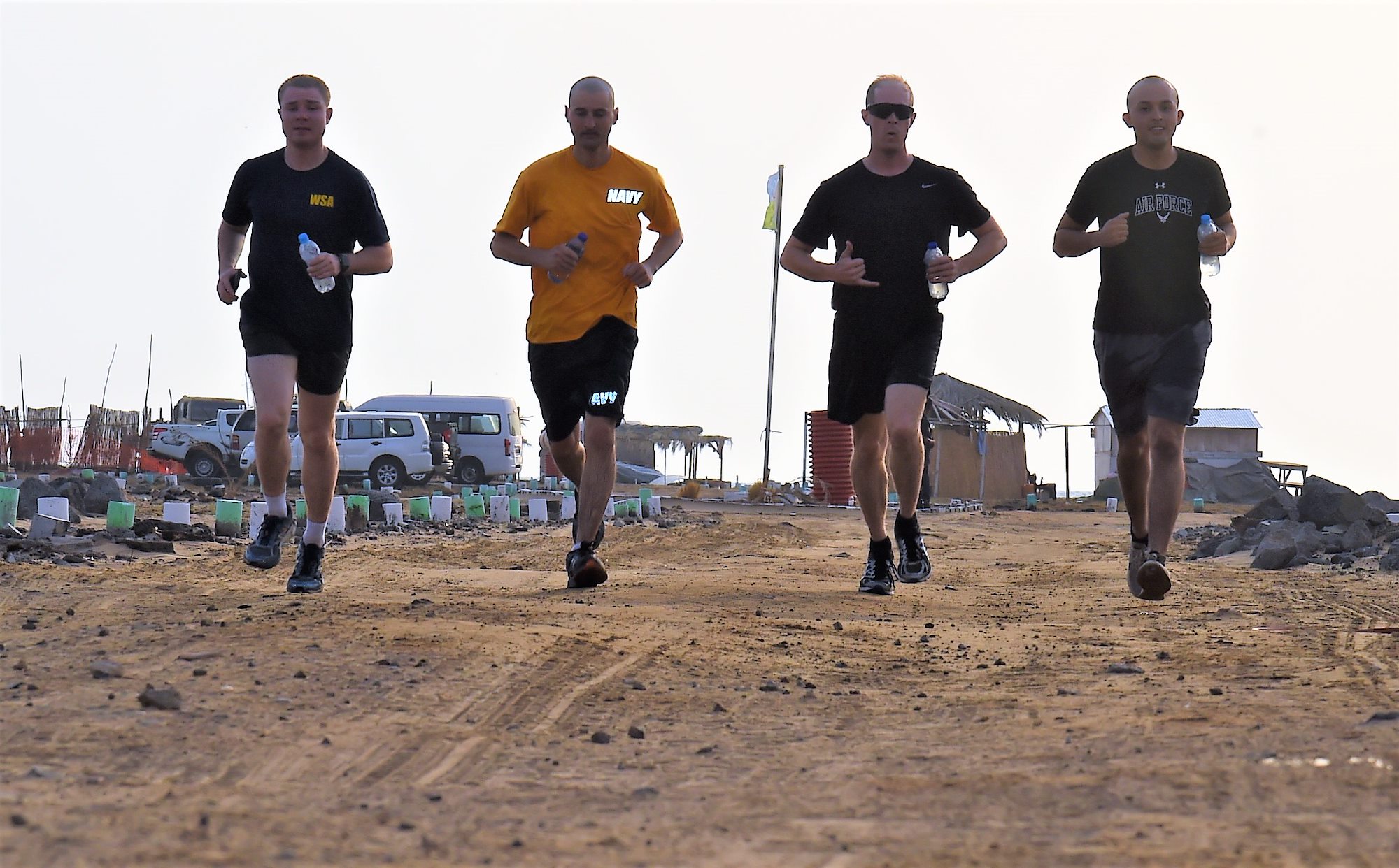 Service members of Combined Joint Task Force – Horn of Africa and Camp Lemonnier participate in the run portion of the Joint Warrior Competition Sep. 9, 2017. For this event, the primary sponsoring organization – CJTF-HOA – challenged teams to be composed of varied military branches to express the significance of the joint environment here. (U.S. Air National Guard photo by Tech. Sgt. Andria Allmond)
