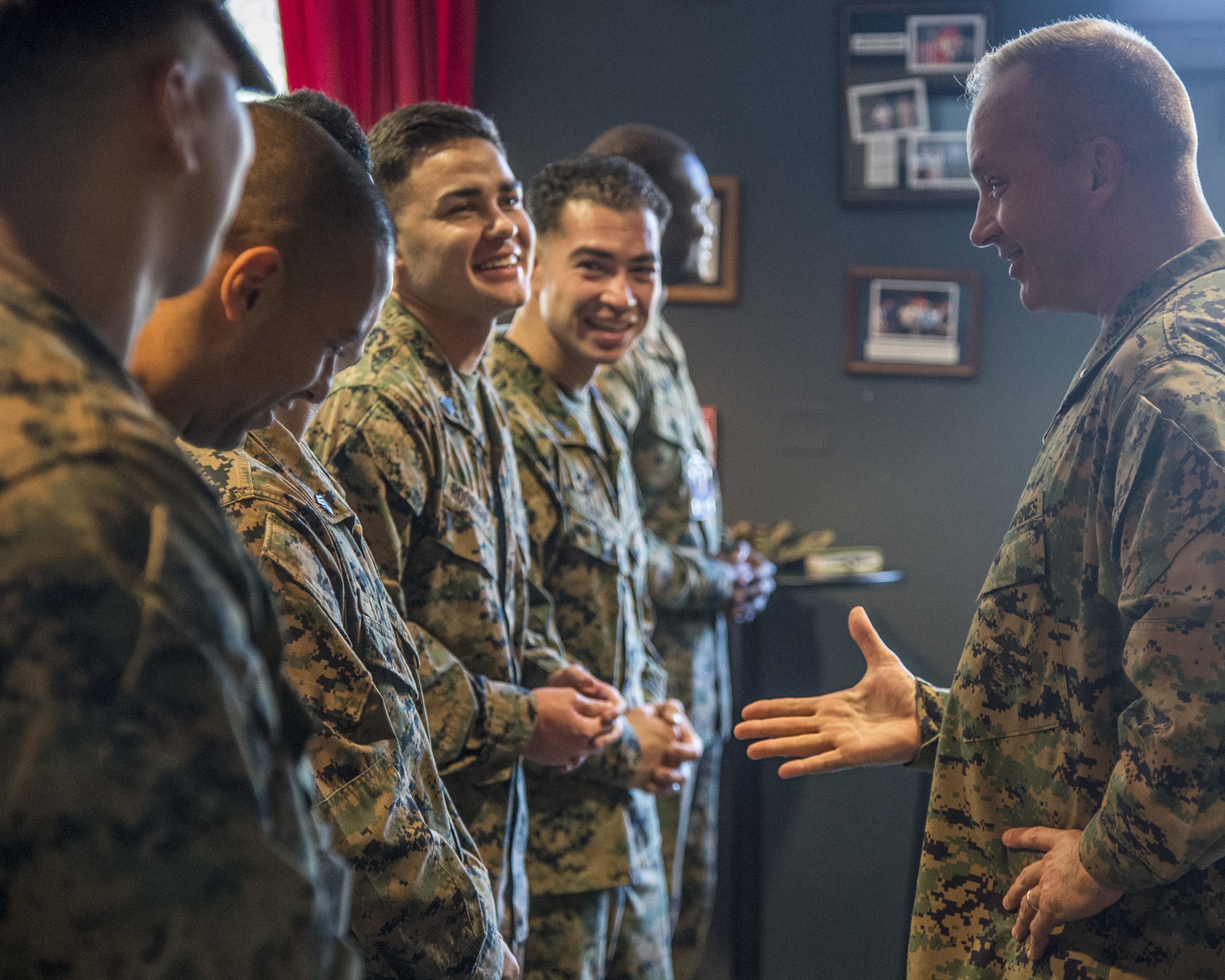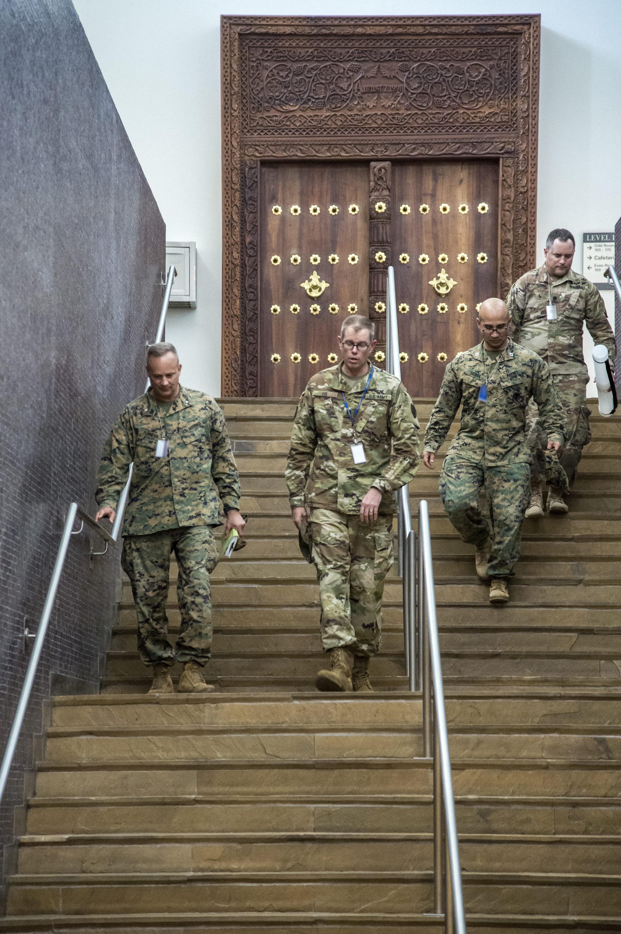 Combined Joint Task Force-Horn of Africa Commanding General, U.S. Marine Corps Brig. Gen. David Furness, visits Marines that secure the U.S. Embassy in Tanzania, Sept. 27, 2017. During the visit, Furness specifically recognized U.S. Marine Sgt. Jessica Valdez, Assistant Detachment Commander Section Chief and U.S. Marine Sgt. Jun Choi, Staff Section of Supply and Vehicle Noncommissioned Officer, for good performance. Furness met with Chargé d’Affaires Inmi Patterson and other embassy officials to discuss military partnership opportunities that enhance security and stability in Tanzania and the East Africa region. (U.S. Air National Guard photo by Tech. Sgt. Joe Harwood)