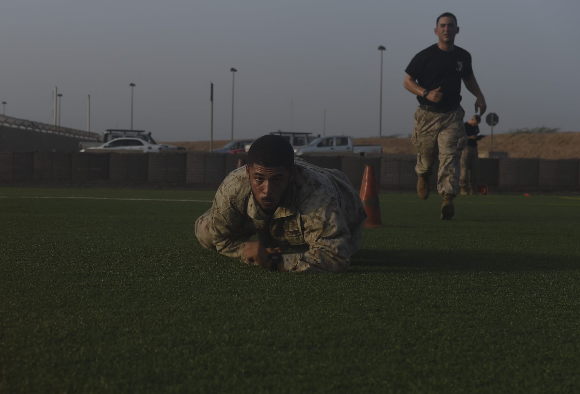 U.S. Marine Corps Cpl. Cameron Smith, assigned to Combined Joint Task Force-Horn of Africa, low-crawls while completing a combat fitness test during the Corporal’s Course at Camp Lemonnier, Djibouti, May 31, 2017. During the Corporal’s Course, the students received more than 120 hours of instruction over the course of 16 days with a curriculum that consisted of various subjects to include; customs and traditions, land navigation, communications, social media interaction, leadership, and combat fitness. (U.S. Air Force photo by Staff Sgt. Eboni Prince)