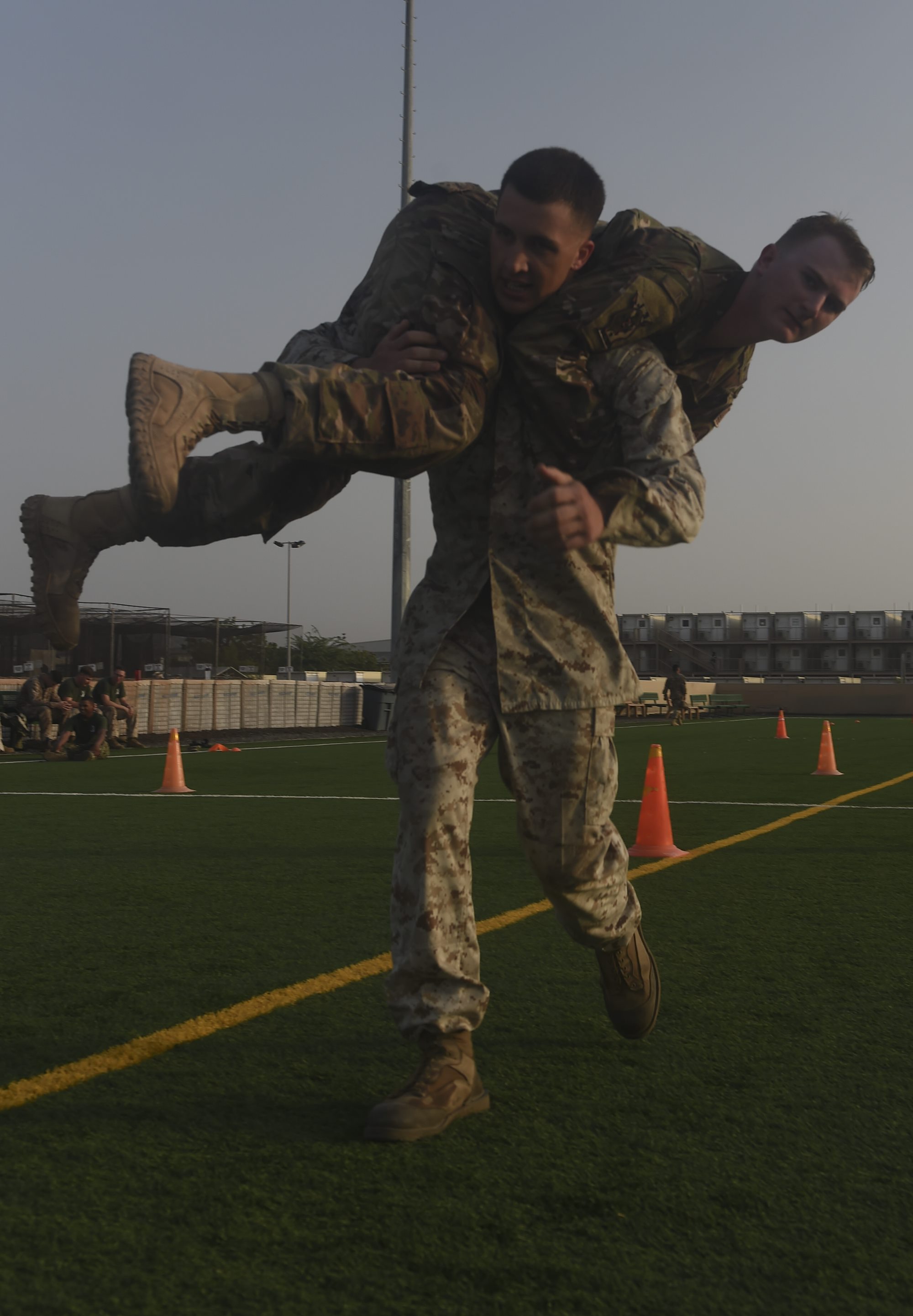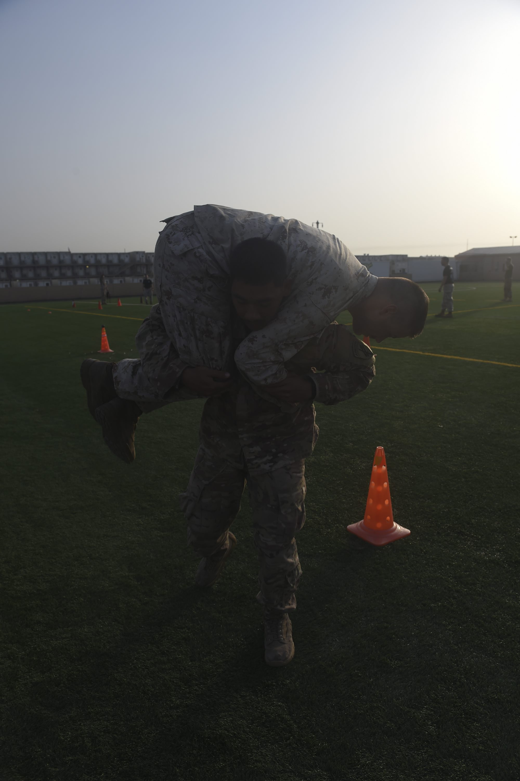 U.S. Army Spc. Kim-Sean Mam executes a fireman’s carry with U.S. Marine Corps Cpl. Brandon Ogle, both assigned to Combined Joint Task Force-Horn of Africa, during the Corporal’s Course at Camp Lemonnier, Djibouti, May 31, 2017. The course is a requirement for Marines in the enlisted grade of E-4, but here, all U.S. service members in the ranks of corporal, specialist, senior airman or petty officer third class were allowed to participate. (U.S. Air Force photo by Staff Sgt. Eboni Prince)