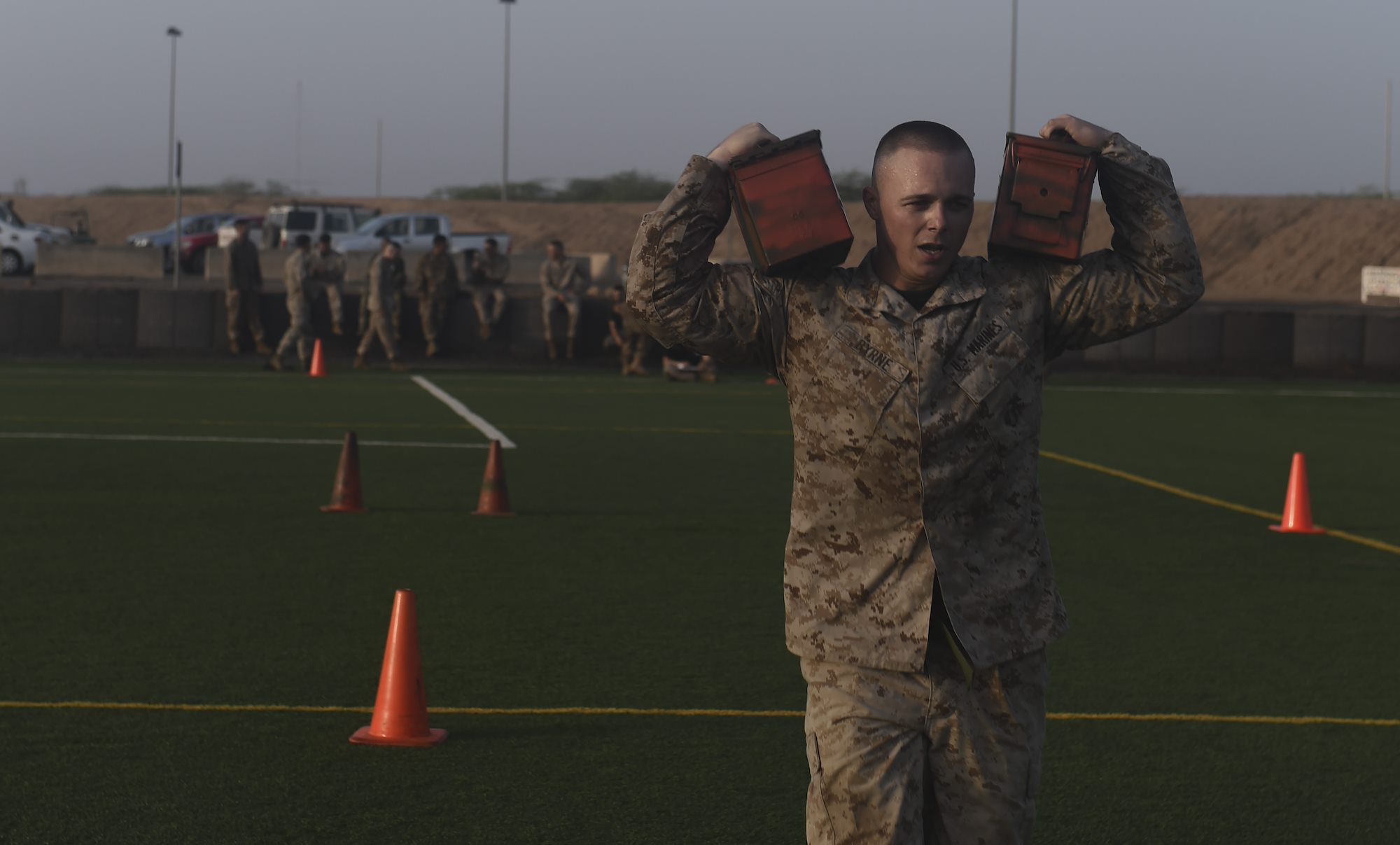U.S. Marine Corps Cpl Richard Byrne, assigned to Combined Joint Task Force-Horn of Africa, carries ammo cans during a combat fitness test during the Corporal’s Course at Camp Lemonnier, Djibouti, May 31, 2017. The course is a requirement for Marines in the enlisted grade of E-4, but here, all U.S. service members in the ranks of corporal, specialist, senior airman or petty officer third class were allowed to participate. (U.S. Air Force photo by Staff Sgt. Eboni Prince)