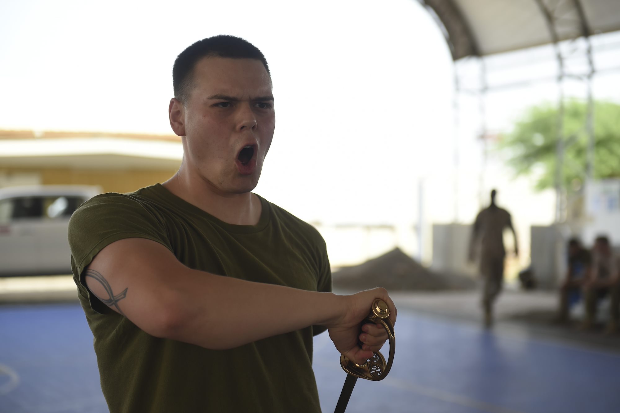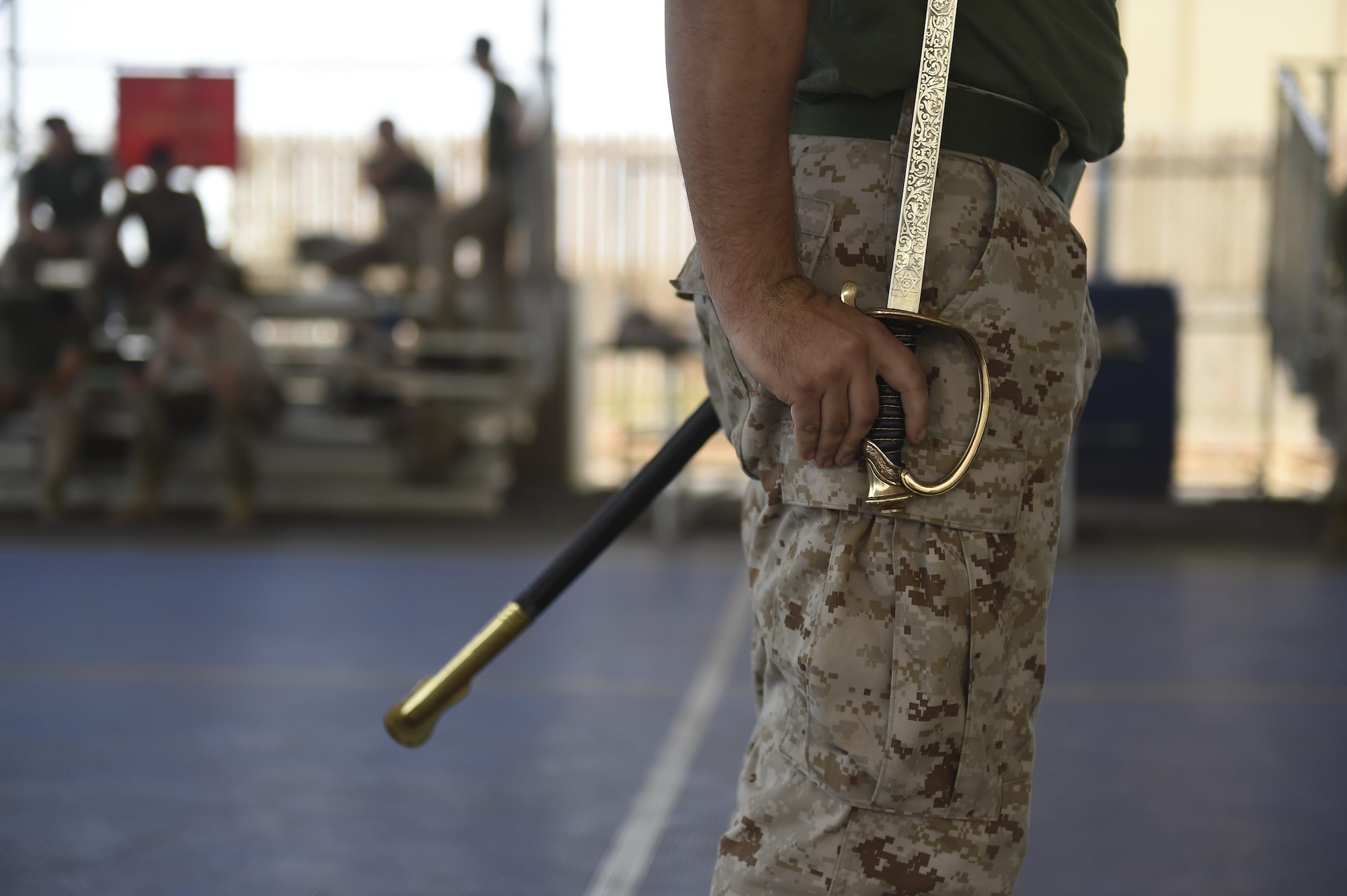 U.S. Marine Corps Cpl. Brandon Ogle, assigned to Combined Joint Task Force-Horn of Africa, prepares to complete a sword and guidon evaluation during the Corporal’s Course at Camp Lemonnier, Djibouti, May 24, 2017. As a dual effort of the Marine Corps Element and CJTF-HOA, the Corporals’ Leadership Development Course is a professional military education program traditionally for Marine Corps Corporals that places emphasis on basic leadership skills. (U.S. Air Force photo by Staff Sgt. Eboni Prince)