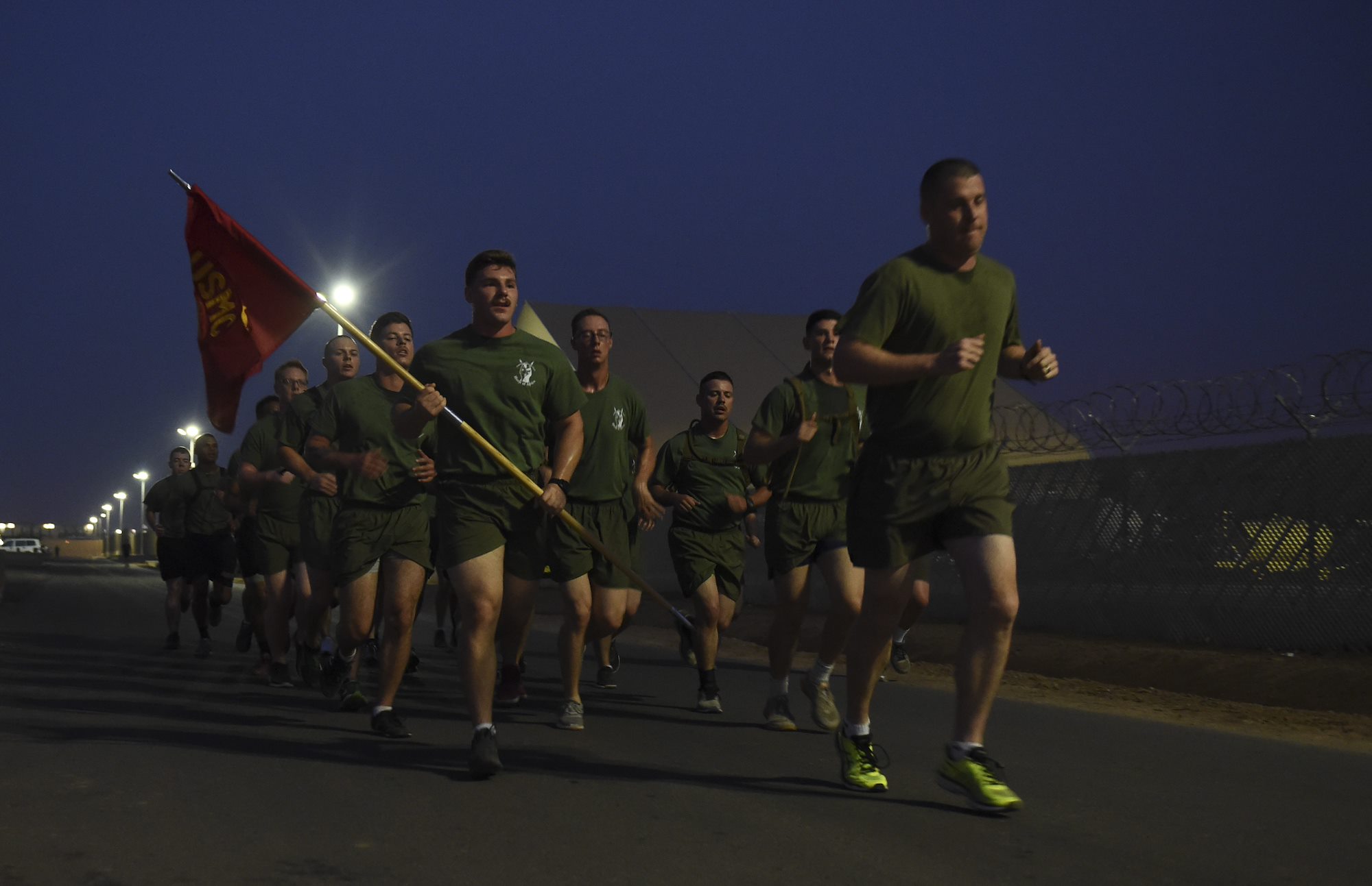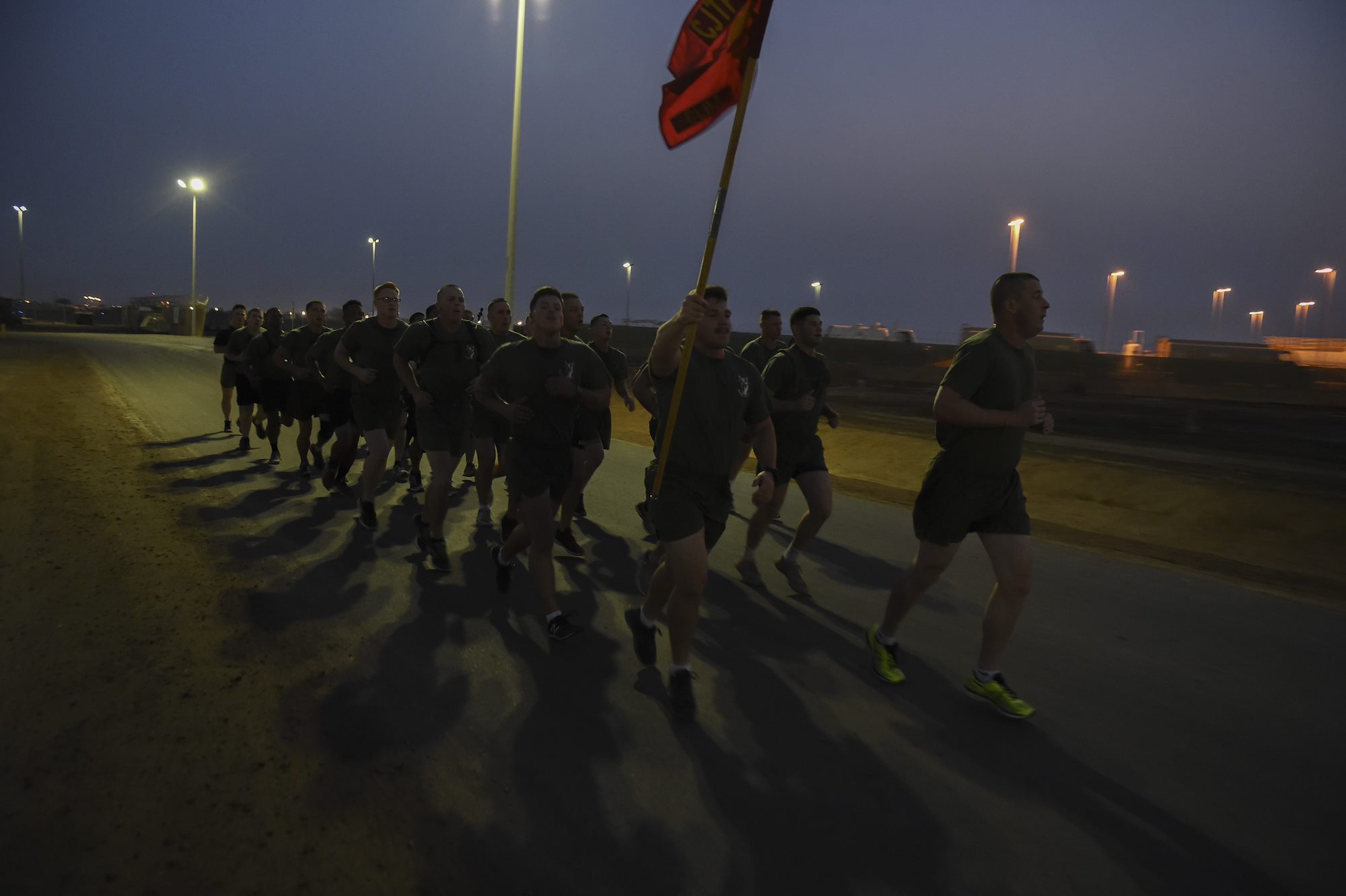 U.S. service members participate in a motivational run around Camp Lemonnier during the Corporal’s Course at Camp Lemonnier, Djibouti, June 2, 2017. The course is a requirement for Marines in the enlisted grade of E-4, but here, all U.S. service members in the ranks of corporal, specialist, senior airman or petty officer third class were allowed to participate. (U.S. Air Force photo by Staff Sgt. Eboni Prince)