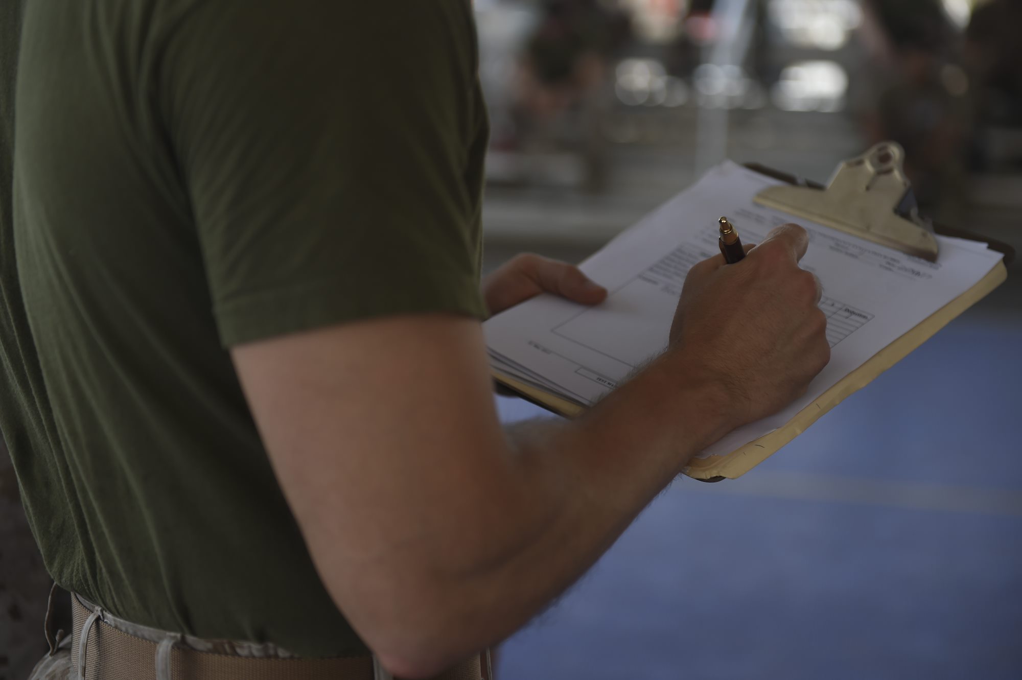U.S. Marine Corps Sgt. Matthew White, assigned to Combined Joint Task Force-Horn of Africa, marks an evaluation score for a student during the Corporal’s Course at Camp Lemonnier, Djibouti, May 24, 2017. A partnered effort between the Marine Corps Element and CJTF-HOA, the Corporals’ Leadership Development Course is a professional military education program traditionally for Marine Corps Corporals that places emphasis on basic leadership skills. (U.S. Air Force photo by Staff Sgt. Eboni Prince)