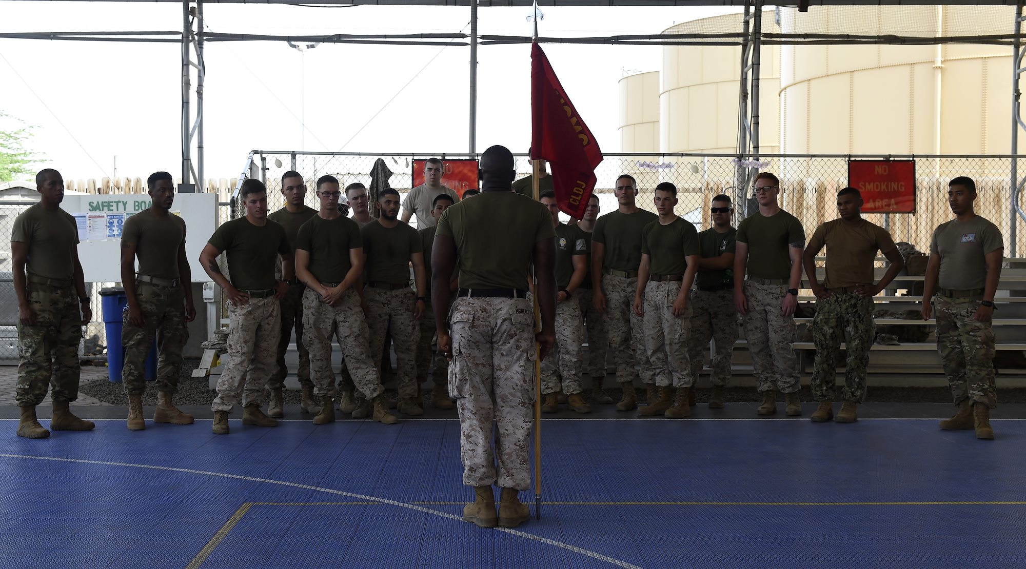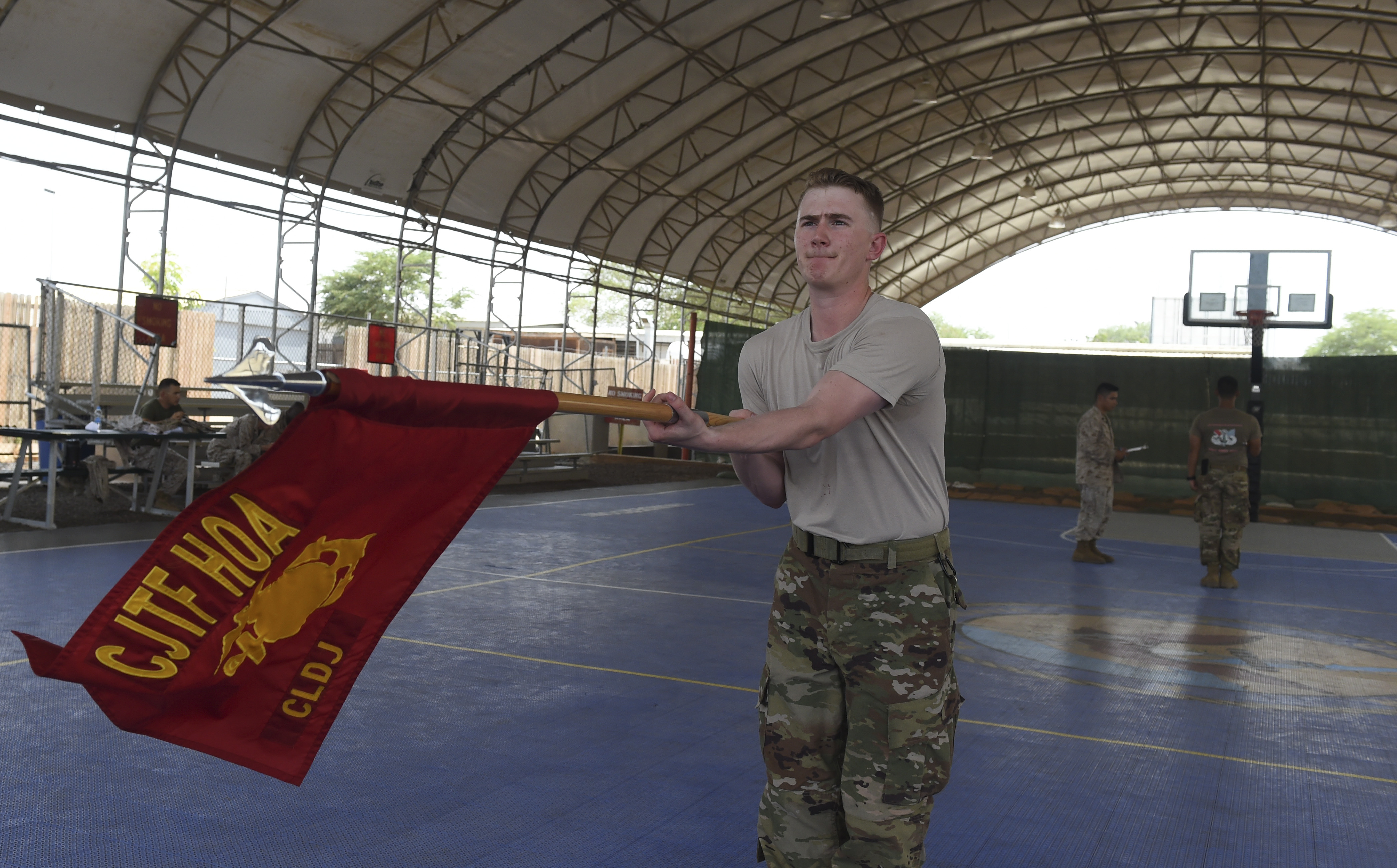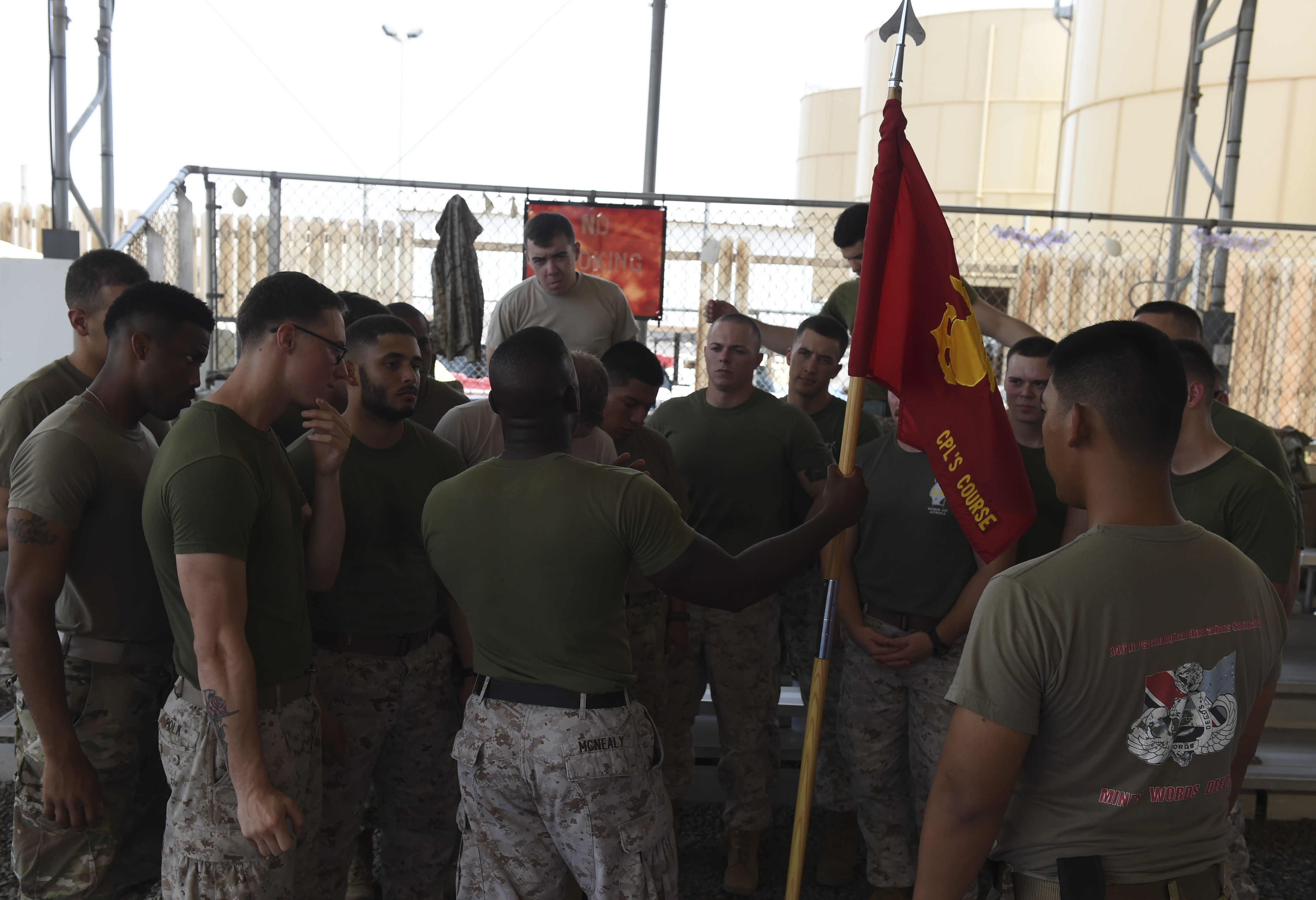 U.S. Marine Corps Sgt. Tyree McNealy, assigned to Combined Joint Task Force-Horn of Africa, demonstrates handling of the guidon during the Corporal’s Course at Camp Lemonnier, Djibouti, May 24, 2017. The intent of the course is to equip and prepare Marines to smartly transition from being subordinates to being small unit leaders. During this course, Corporals gain insight into key facets of their new grade and responsibilities and are thus prepared to take on future leadership challenges. (U.S. Air Force photo by Staff Sgt. Eboni Prince)