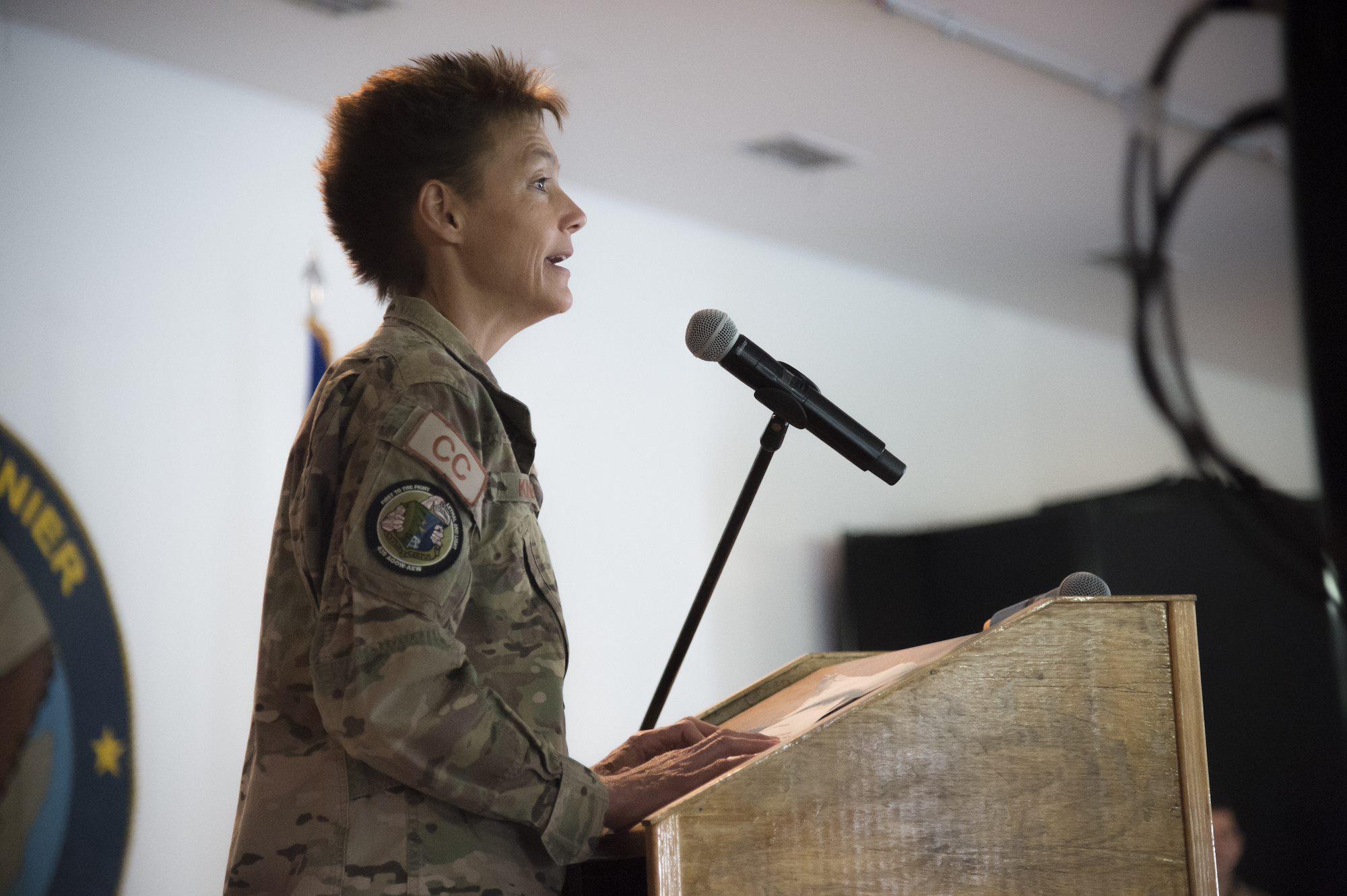 U.S. Air Force Col. Andra Kniep, 435th Air Expeditionary Wing commander, speaks to the crowd during the 449th AEG Change of Command ceremony June 9, 2017, at Camp Lemonnier, Djibouti. CJTF-HOA welcomes new 449th AEG commander U.S. Air Force Col. Shawn Cochran, 449th Air Expeditionary Group incoming commander, is relieving U.S. Air Force Col. Michael Bruzzini who has served as the 449th AEG Commander since June 6, 2016. The passing of the flag is a military tradition signifying the change of authority and responsibility of a unit from one commander to another. (U.S. Air National Guard Photo by Tech. Sgt. Joe Harwood)