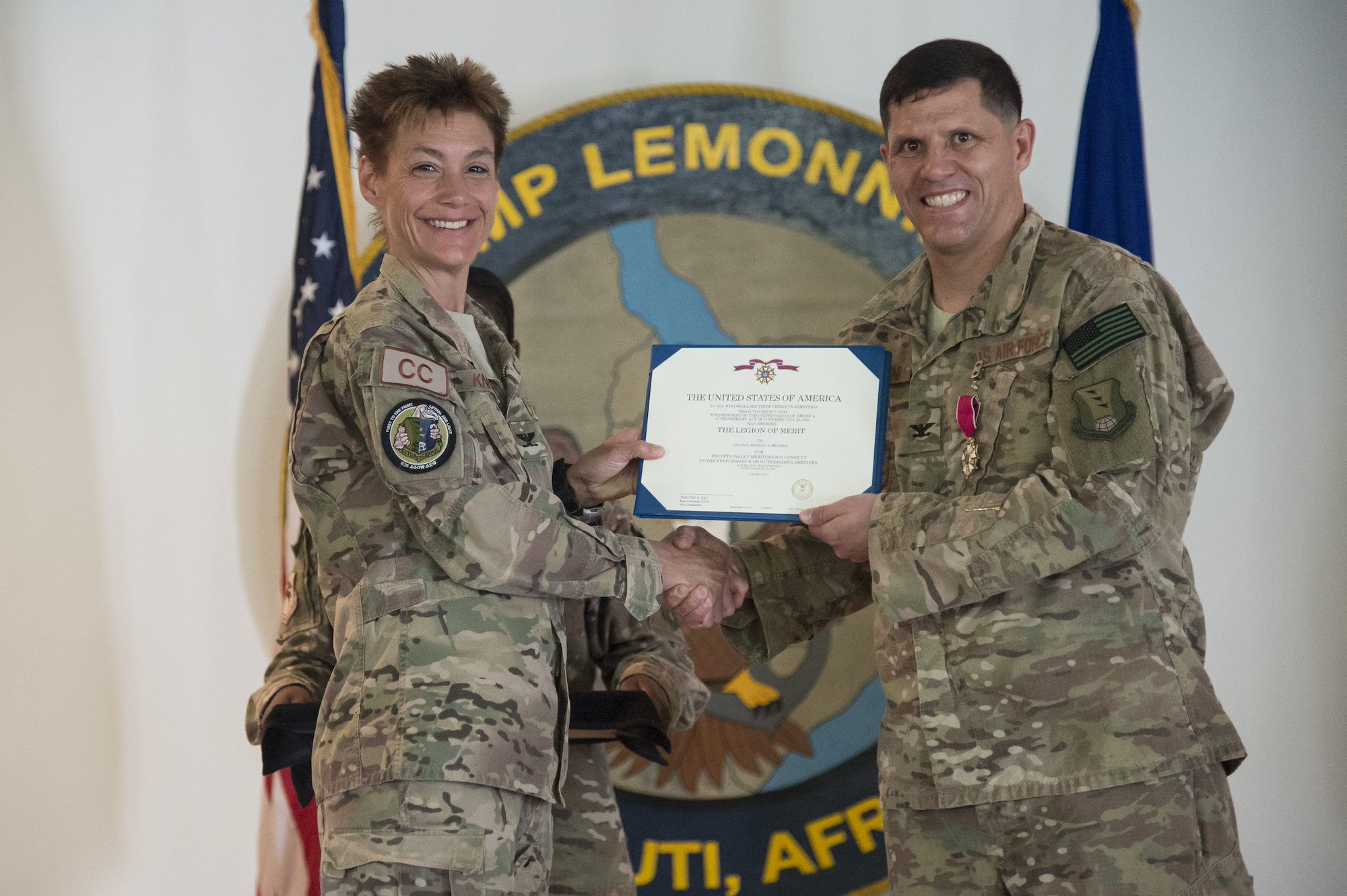 U.S. Air Force Col. Andra Kniep, 435th Air Expeditionary Wing commander, presents U.S. Air Force Col. Michael Bruzzini the Legion of Merit during the 449th AEG Change of Command ceremony June 9, 2017, at Camp Lemonnier, Djibouti. Cochran is relieving U.S. Air Force Col. Michael Bruzzini who has served as the 449th AEG Commander since June 6, 2016. The Legion of Merit is presented for exceptional meritorious conduct in the performance of outstanding services. (U.S. Air National Guard Photo by Tech. Sgt. Joe Harwood)