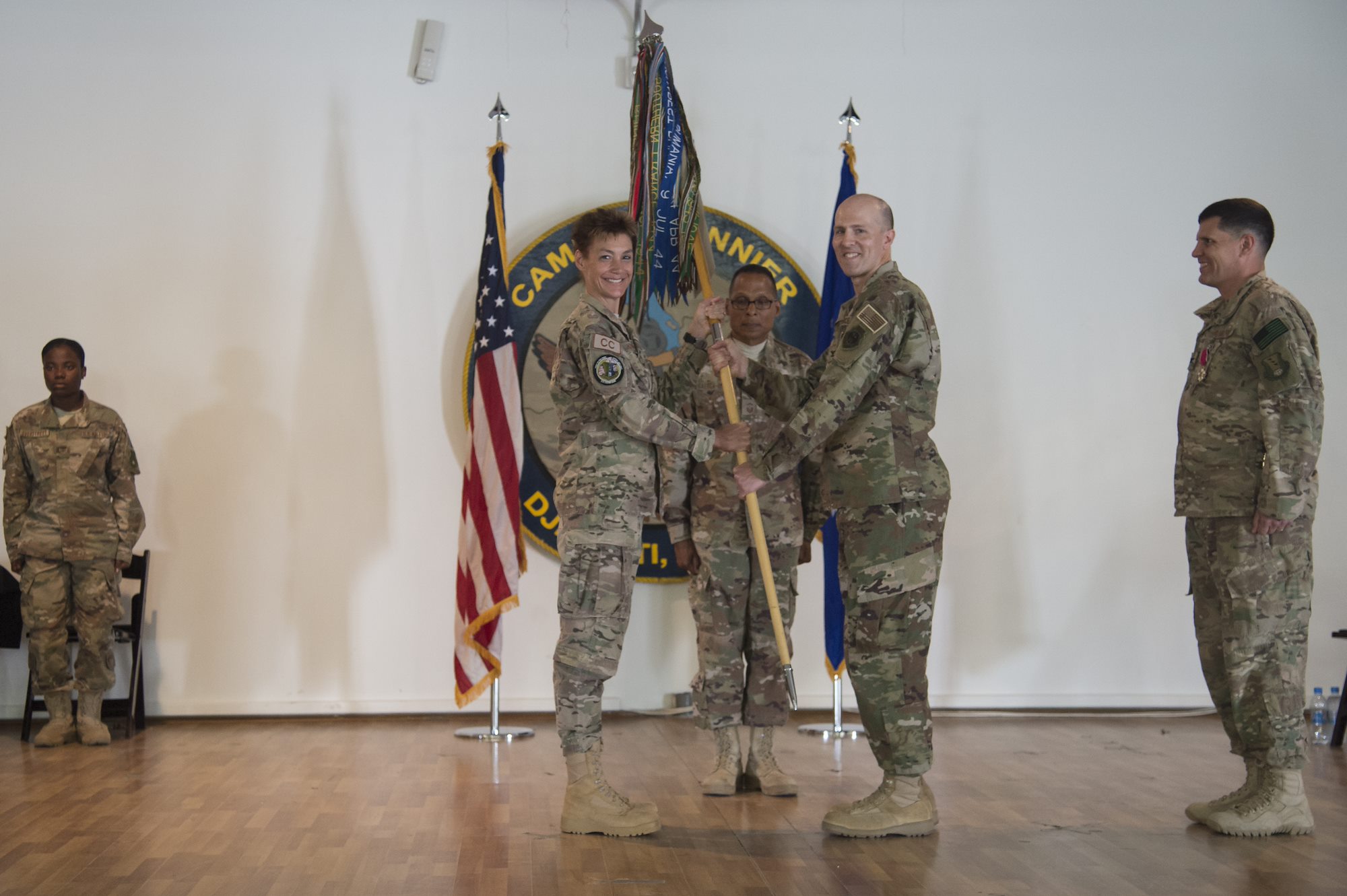 U.S. Air Force Col. Shawn Cochran, 449th Air Expeditionary Group incoming commander, receives the 449th AEG flag from U.S. Air Force Col. Andra Kniep, 435th Air Expeditionary Wing commander, during the 449th AEG Change of Command ceremony June 9, 2017, at Camp Lemonnier, Djibouti. Cochran is relieving U.S. Air Force Col. Michael Bruzzini who has served as the 449th AEG Commander since June 6, 2016. The passing of the flag is a military tradition signifying the change of authority and responsibility of a unit from one commander to another. (U.S. Air National Guard Photo by Tech. Sgt. Joe Harwood)