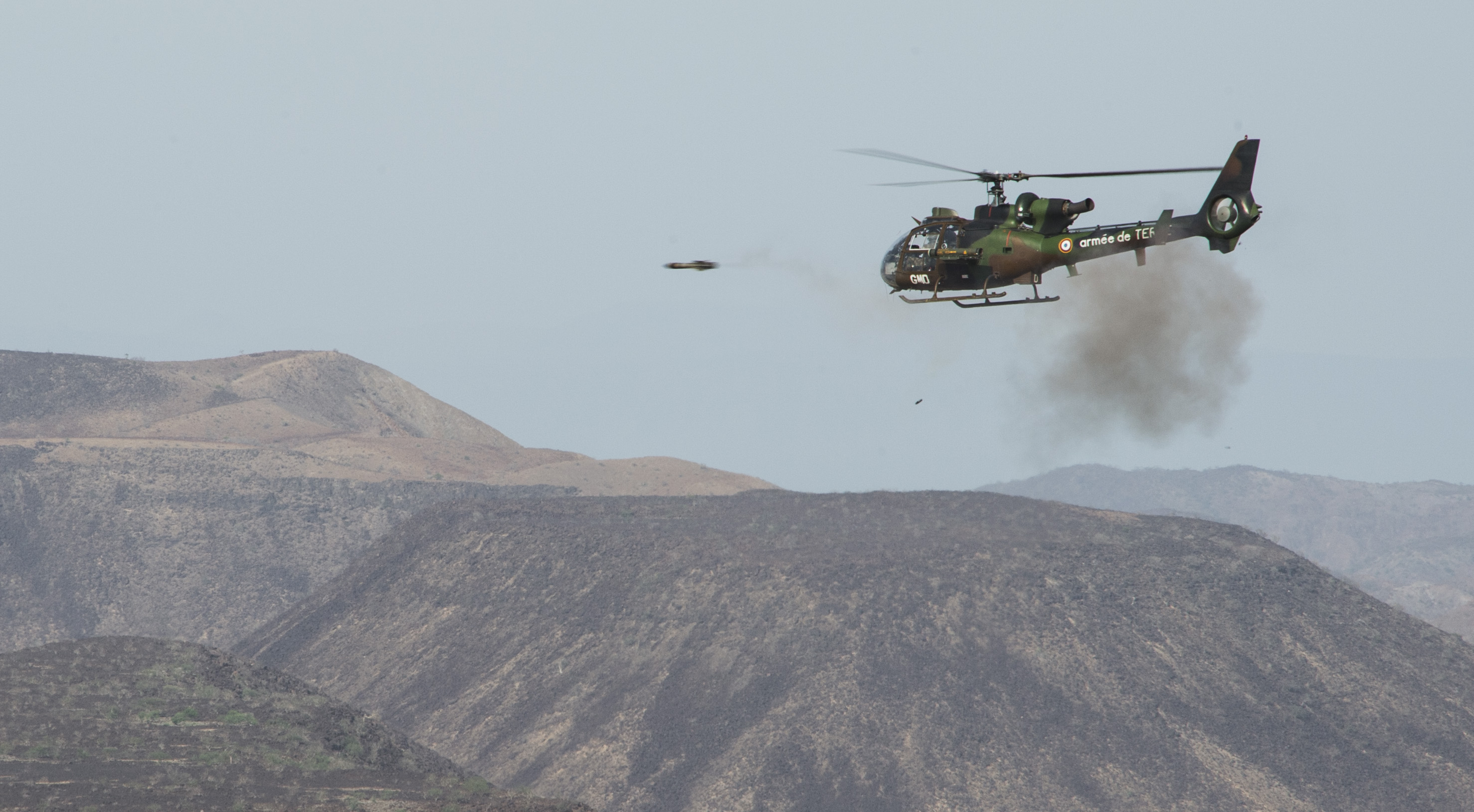 A French SA 342 Gazelle utility helicopter fires a live missile at simulated targets during the French live fire demonstration near Arta Plage, Djibouti, Jan. 14, 2017. The SA 342 Gazelle is a light, five-seat helicopter often used by various militaries for reconnaissance and light attack duties. (U.S. Air National Guard photo by: Staff Sgt. Christian Jadot)