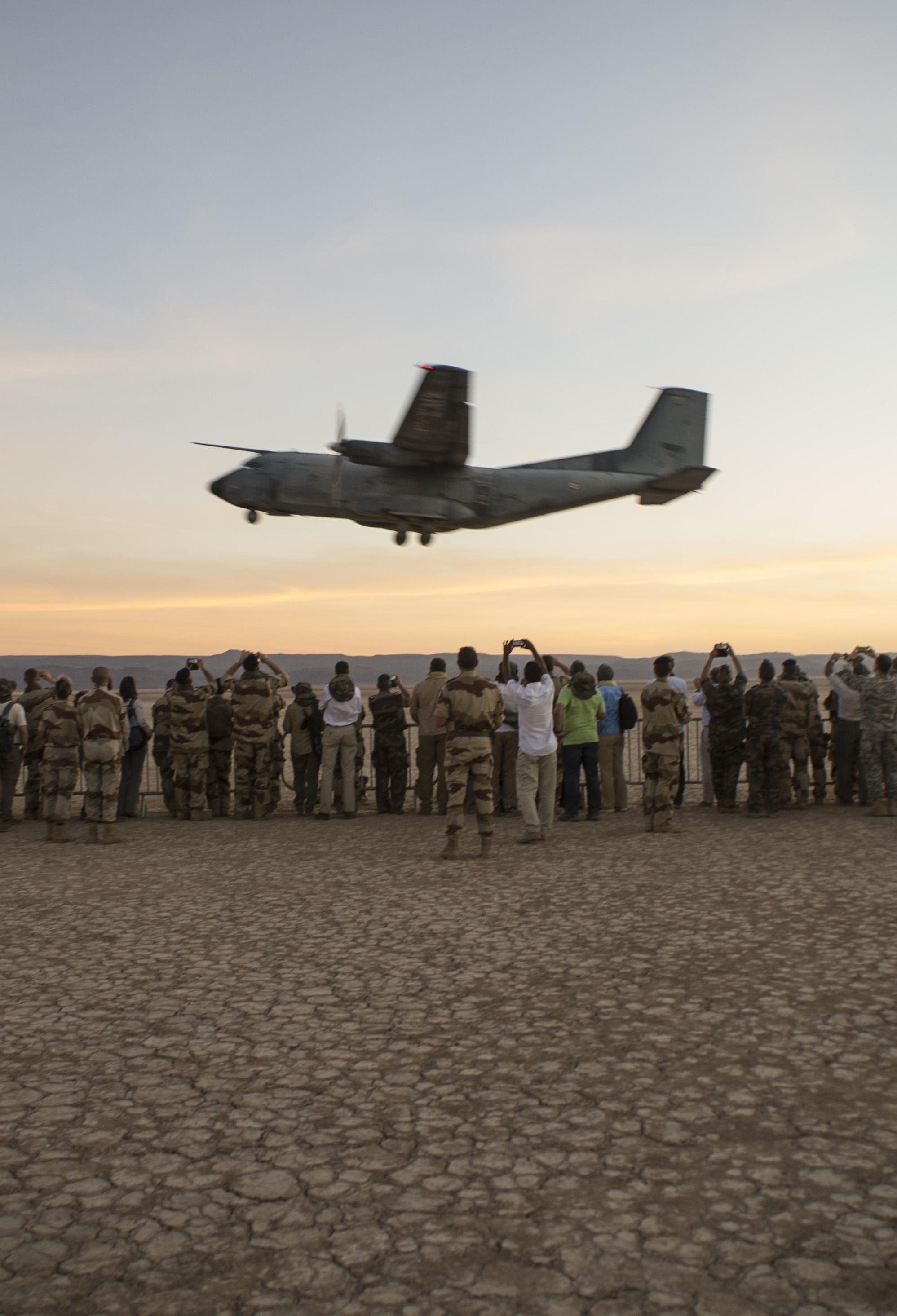 A French C-160 Transall transport aircraft takes off in front of a crowd of onlookers during the French live fire demonstration near Grand Bara, Djibouti, Jan. 14, 2017. The C-160 Transall is a tactical transport aircraft capable of carrying up to 93 troops with the ability to take off on an airstrip as short as 700 meters. (U.S. Air National Guard photo by: Staff Sgt. Christian Jadot)