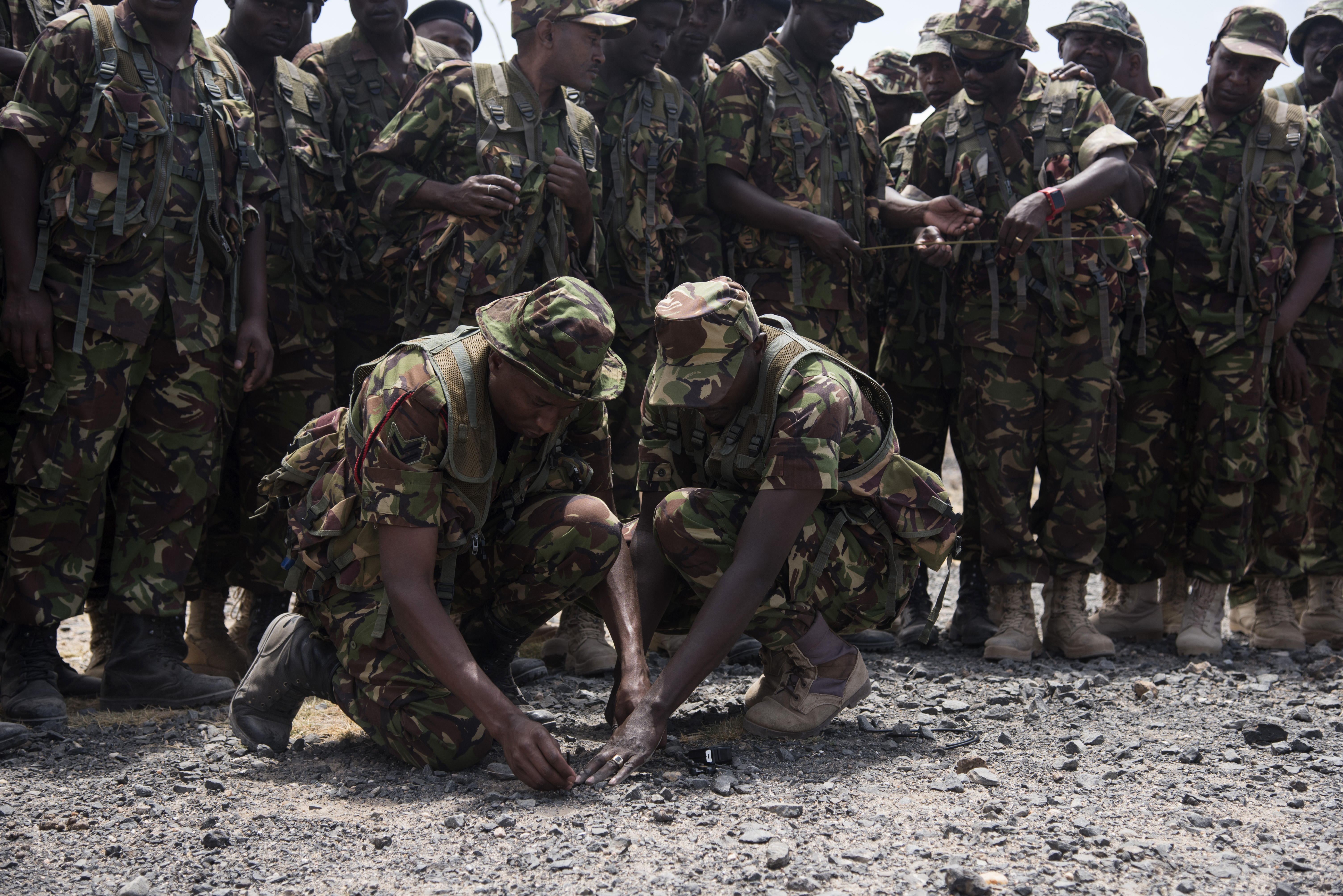 KENYA- U.S. Navy Sailors with Task Force Sparta teach Kenya Defense Forces combat engineers how set up their own non-electric demolition charges during Deliberate Kindle 2016, Sept. 19, at a training center in Kenya. Deliberate Kindle 2016 is taught by U.S. Navy explosive ordnance disposal technicians and a dive independent duty corpsman assigned to Combined Joint Task Force-Horn of Africa. It is a four-week counter-improvised explosive device course designed to provide training in countering improvised explosive devices and unexploded ordnance, medical, and train-the-trainer skills to approximately 53 KDF soldiers in preparation for future deployments with the African Union Mission in Somalia. (U.S. Air Force photo by Staff Sgt. Tiffany DeNault)