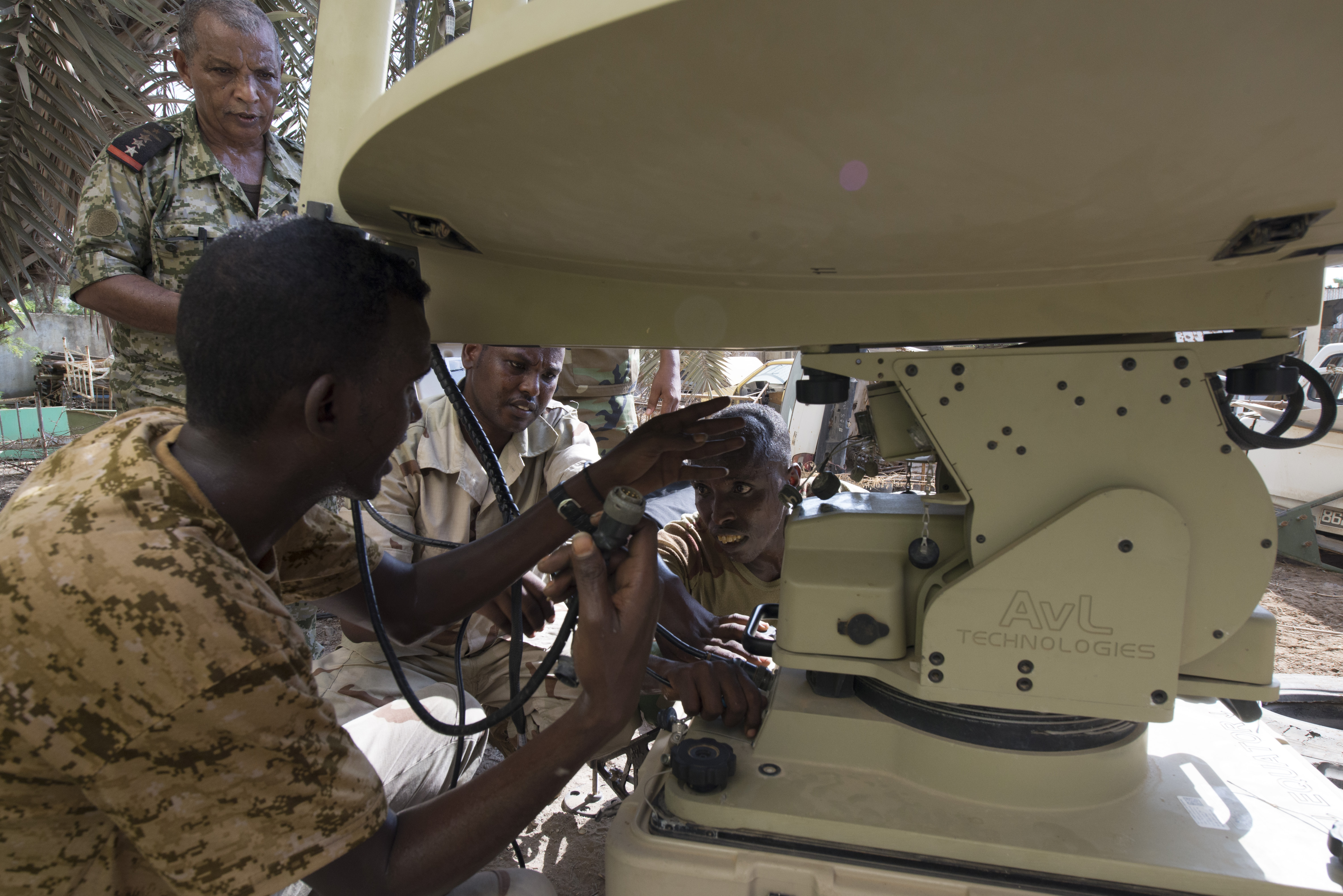 Djibouti Armed Forces (FAD) service members set up an Africa Data Sharing Network (ADSN) satellite during training validation Sept. 28, 2016, at FAD Headquarters in Djibouti. While conducting the best practices training, the U.S. Army, assigned to Combined Joint Task-Horn of Africa, also held an ADSN validation with the FAD soldiers to prepare them to deploy to Somalia. The ADSN provides network and Voice over Internet Protocol capabilities between the several African countries participating in the Africa Union Mission in Somalia. (U.S. Air Force photo by Staff Sgt. Eric Summers Jr.)