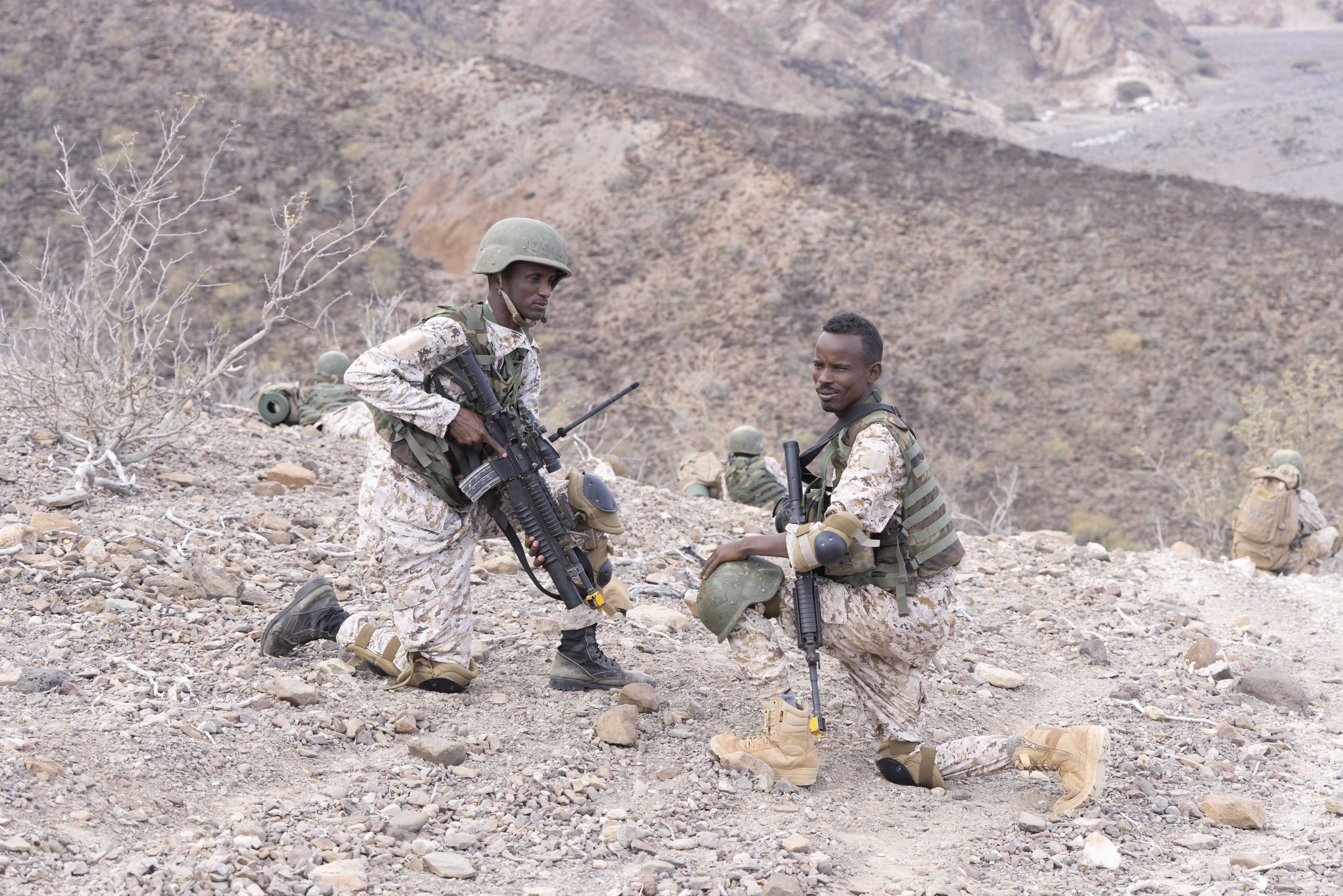 Djiboutian Battalion Intervention Rapide soldiers establish security during exercise Justified Accord 2025 at Arta Range Complex, Djibouti, Feb. 11, 2025. JA25 is the premier U.S. Africa Command (USAFRICOM) exercise in East Africa, designed to enhance multinational combat readiness, strengthen crisis response capabilities and empower allies and partners in the region. Led by U.S. Army Southern European Task Force, Africa (SETAF-AF) and hosted in Kenya, Djibouti and Tanzania, JA25 integrates high-intensity training scenarios that sharpen warfighting skills, increase operational reach and enhance the ability to execute complex joint and multinational operations. The exercise runs from Feb. 10–21, 2025. (U.S. Army photo by Cpl. Joey Ke)