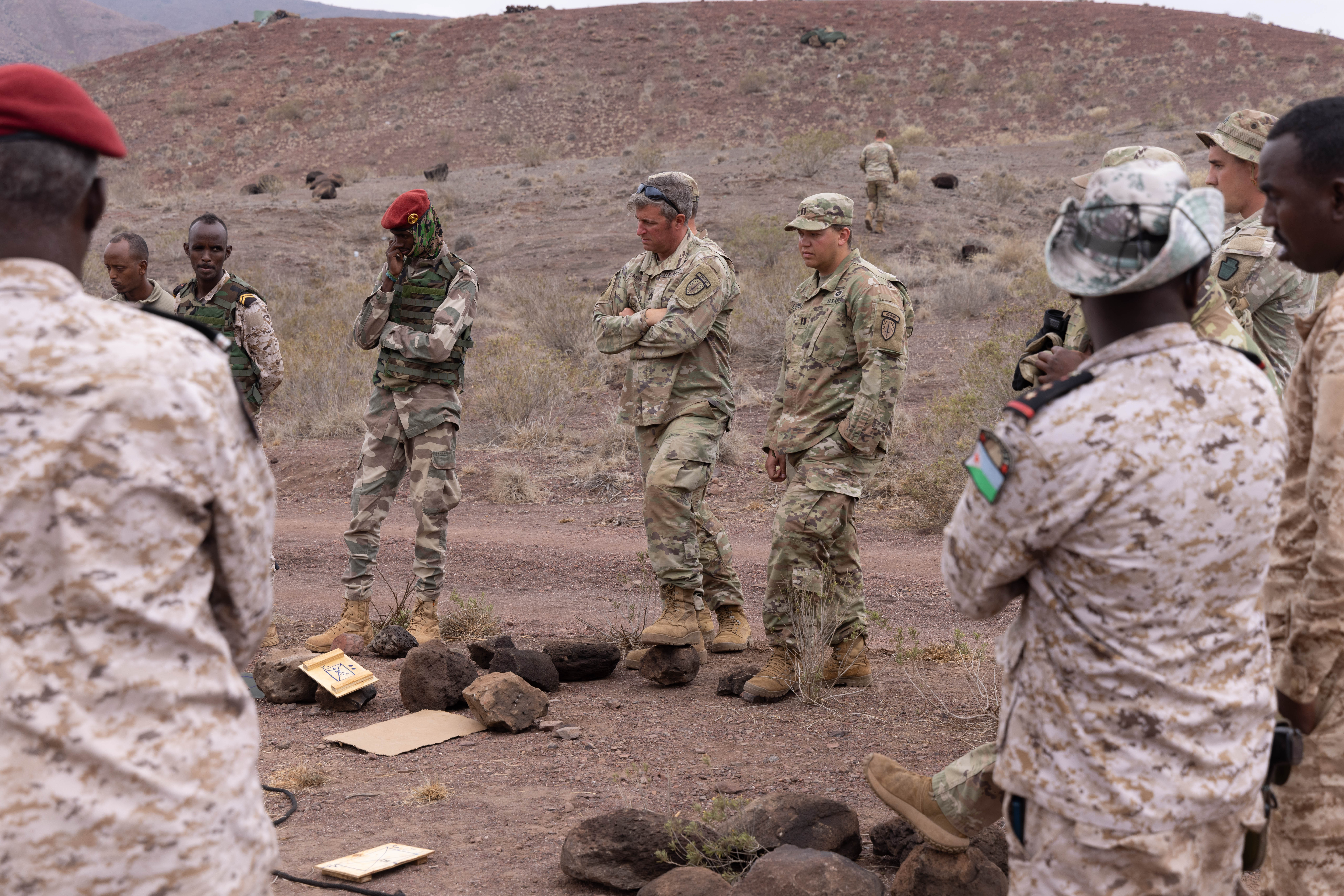 Djiboutian Battalion Intervention Rapide soldiers review a plan for a simulated objective during exercise Justified Accord 2025 at Arta Range Complex, Djibouti, Feb. 11, 2025. JA25 is the premier U.S. Africa Command (USAFRICOM) exercise in East Africa, designed to enhance multinational combat readiness, strengthen crisis response capabilities and empower allies and partners in the region. Led by U.S. Army Southern European Task Force, Africa (SETAF-AF) and hosted in Kenya, Djibouti and Tanzania, JA25 integrates high-intensity training scenarios that sharpen warfighting skills, increase operational reach and enhance the ability to execute complex joint and multinational operations. The exercise runs from Feb. 10–21, 2025. (U.S. Army photo by Cpl. Joey Ke)