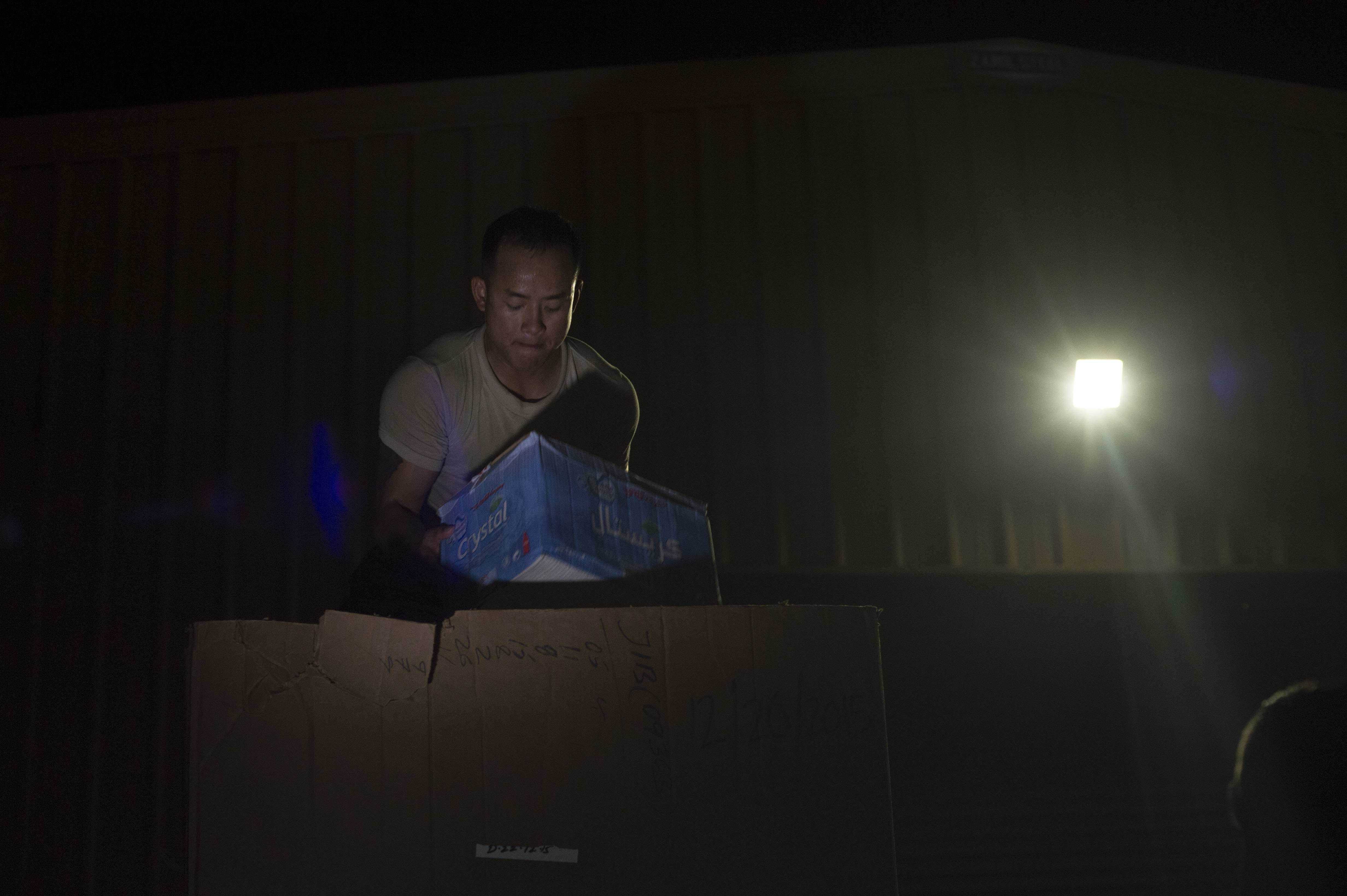 U.S. Army Spc. Tien Do, an East African Response Force member, packs cases of water to forward deploy during an EARF exercise May 27, 2016, at Camp Lemonnier, Djibouti. The EARF serves as a quick reaction force and is an asset to bring stability to the East Africa region. (U.S. Air Force photo by Staff Sgt. Eric Summers Jr.)