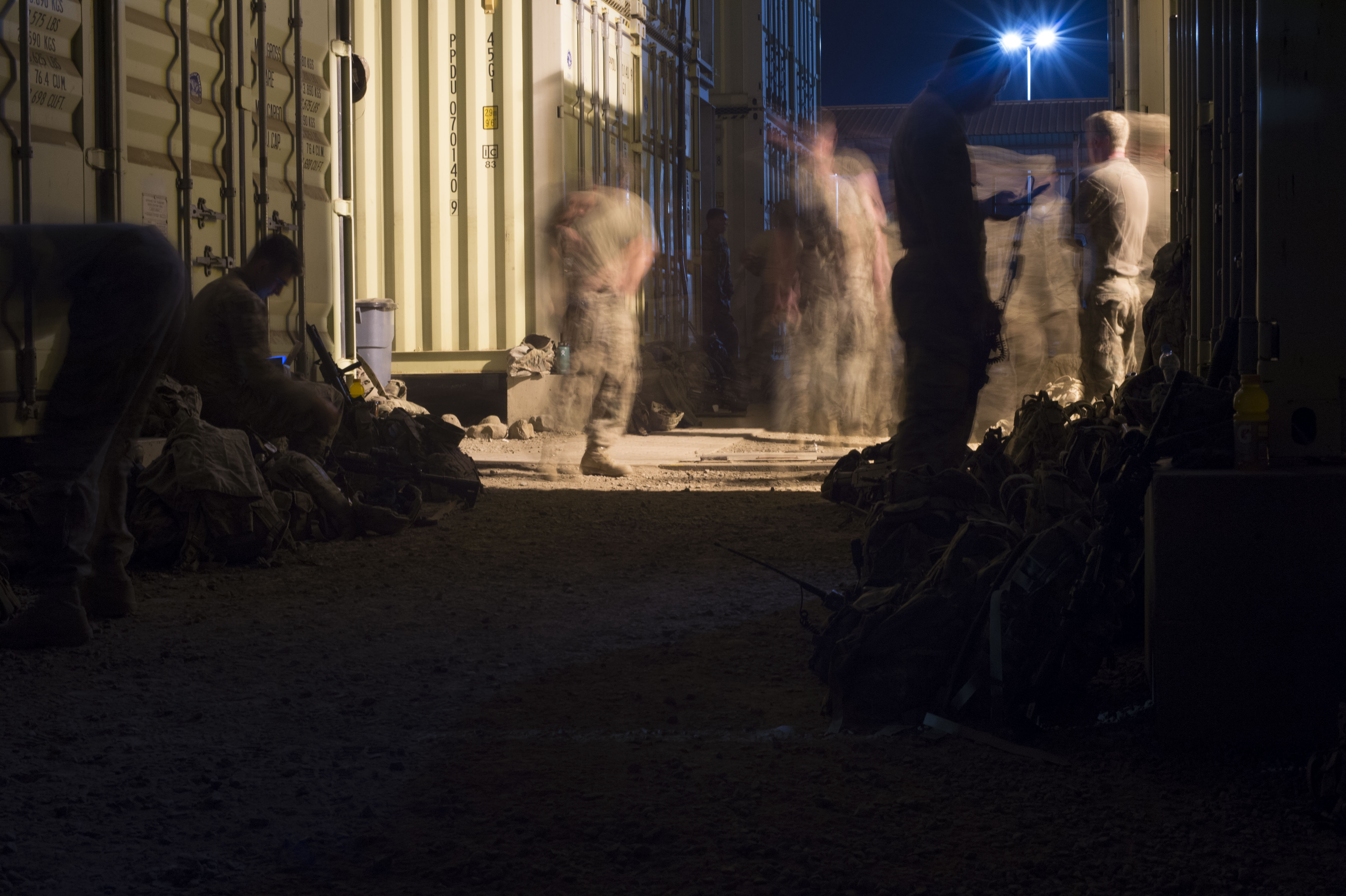 Members of the Combined Joint Task Force Horn of Africa’s East African Response Force check and pack gear before loading onto an aircraft during an EARF exercise May 27, 2016, at Camp Lemonnier, Djibouti. CJTF-HOA planned and executed the validation after 1st Battalion, 124th Infantry Regiment, or Task Force Hurricane, from Miami, Fla., assumed responsibility of the EARF mission from 2nd Battalion, 124th Infantry Regiment, or Task Force Seminole, who will return to Orlando, Fla. (U.S. Air Force photo by Staff Sgt. Eric Summers Jr.)