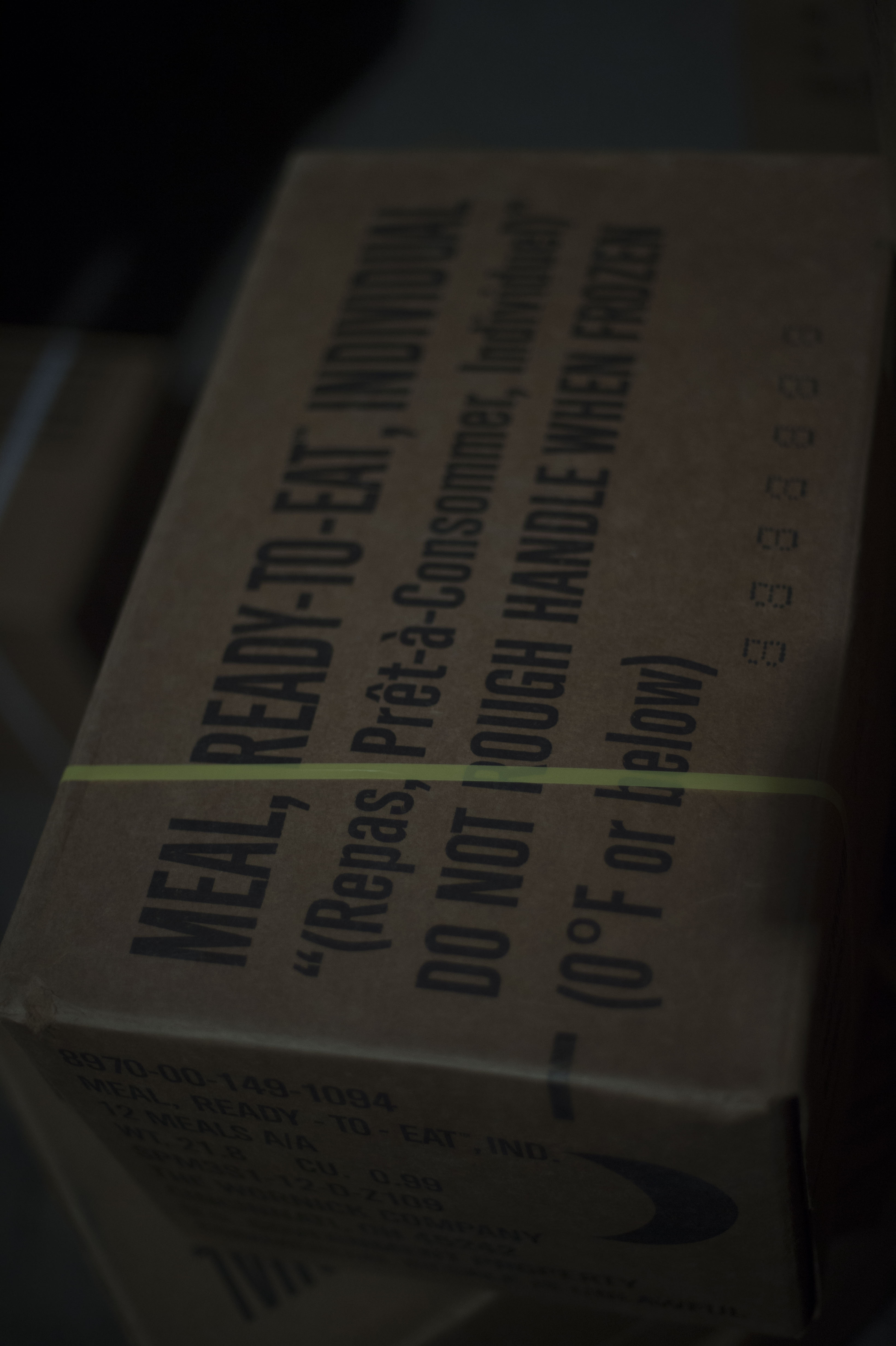 A case of meals ready-to-eat is packed onto a pallet in preparation to forward deploy during an East African Response Force exercise March 27, 2016, at Camp Lemonnier, Djibouti. Tons of MREs and water were packed and loaded onto a U.S. Air Force C-130J Hercules. (U.S. Air Force photo by Staff Sgt. Eric Summers Jr.)