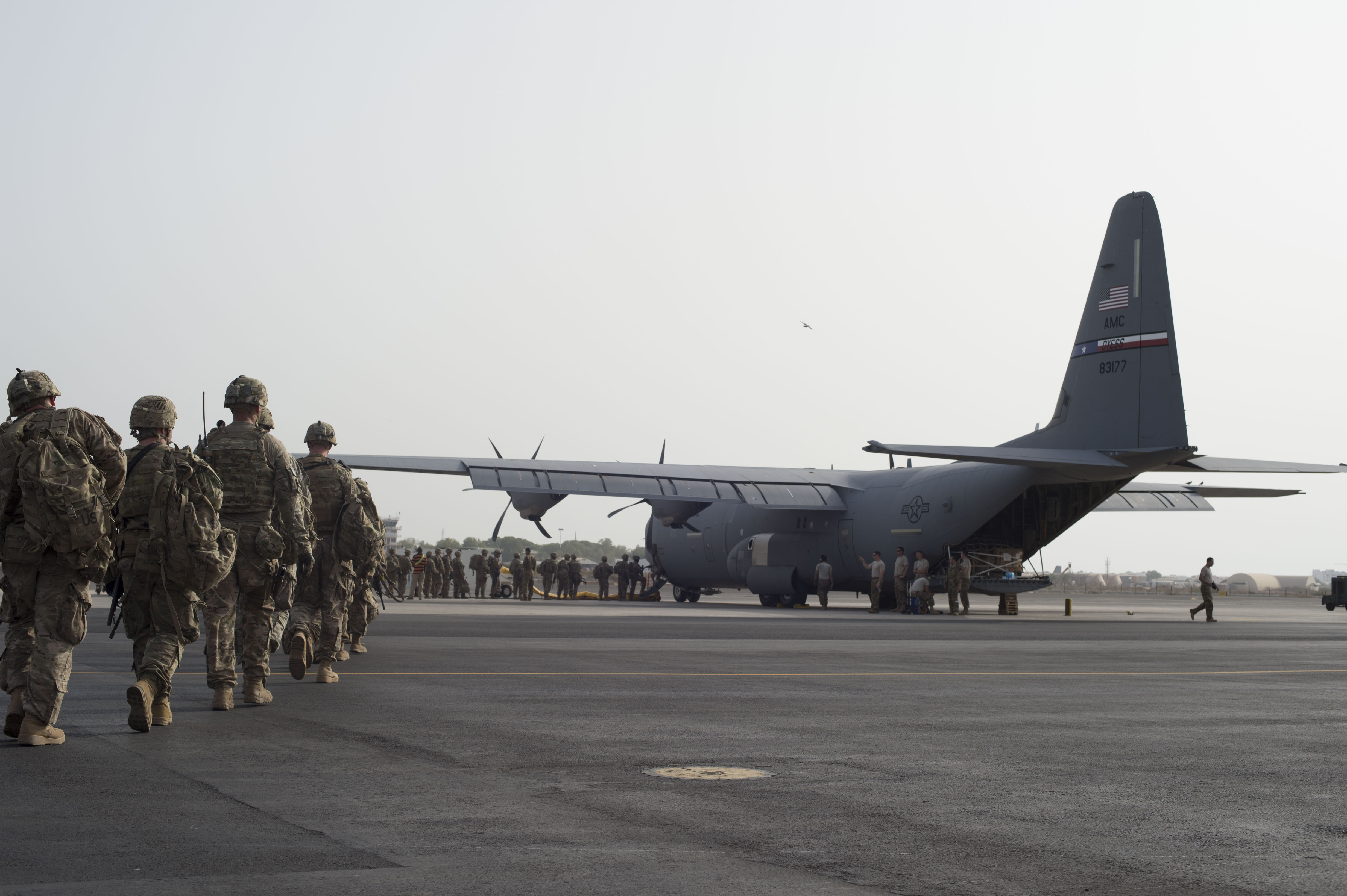 U.S. Army Sgt. 1st Class Raul Lopez, East African Response Force, takes accountability as Soldiers board a U.S. Air Force C-130J Hercules May 27, 2016, at Camp Lemonnier, Djibouti. Composed primarily of Soldiers, the EARF functions as a joint response unit, employing troops from across the services to accomplish the mission. (U.S. Air Force photo by Staff Sgt. Eric Summers Jr.)