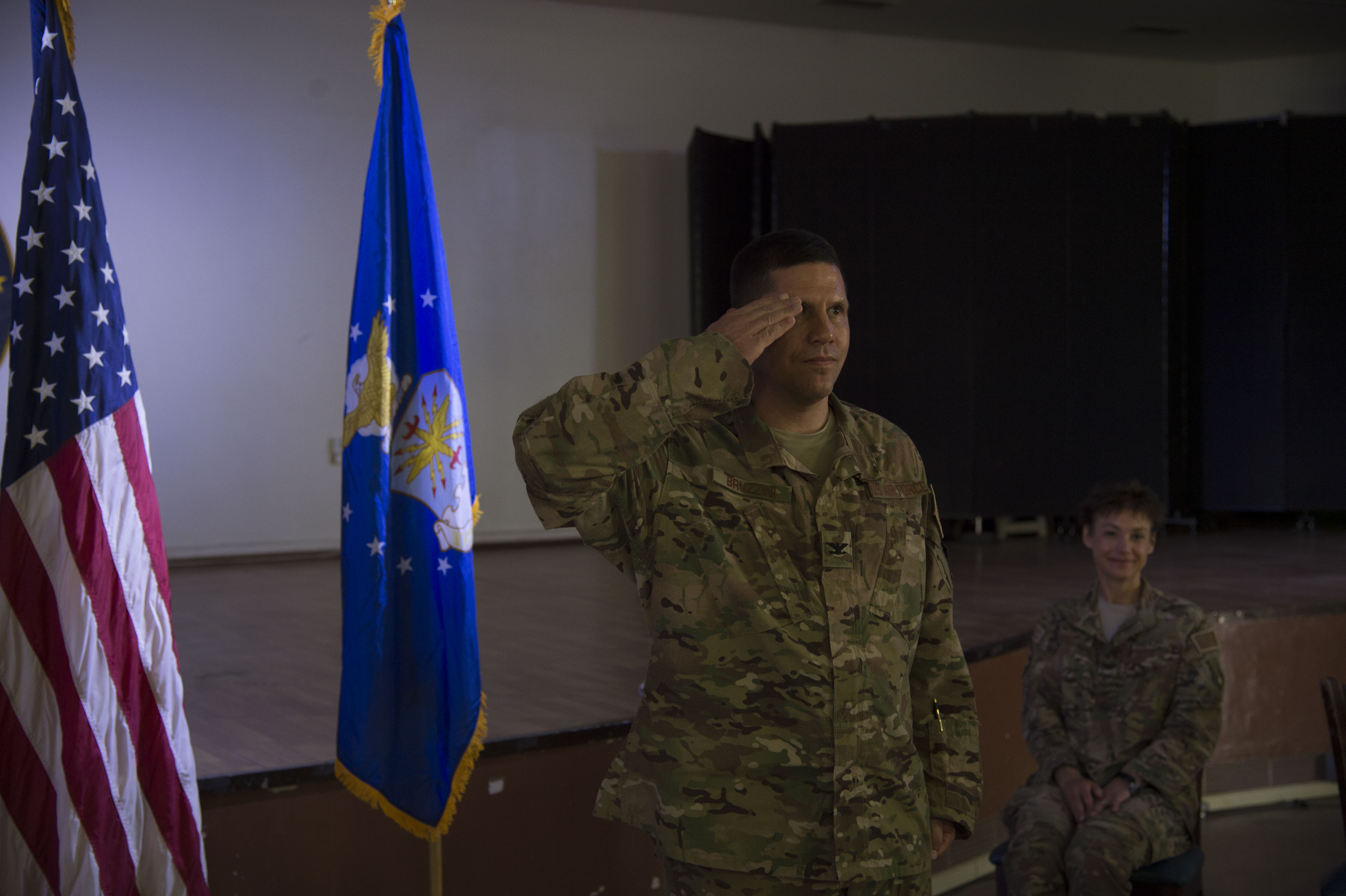 U.S. Air Force Col. Michael Bruzzini, 449th Air Expeditionary Group incoming commander, presents his first salute to the unit during the 449th AEG Change of Command ceremony June 6, 2016, at Camp Lemonnier, Djibouti. Bruzzini has experience in combat and combat support missions in Operations Allied Force, Southern Watch, Iraqi Freedom and Enduring Freedom, as well as experience in the Horn of Africa. (U.S. Air Force photo by Staff Sgt. Eric Summers Jr.)
