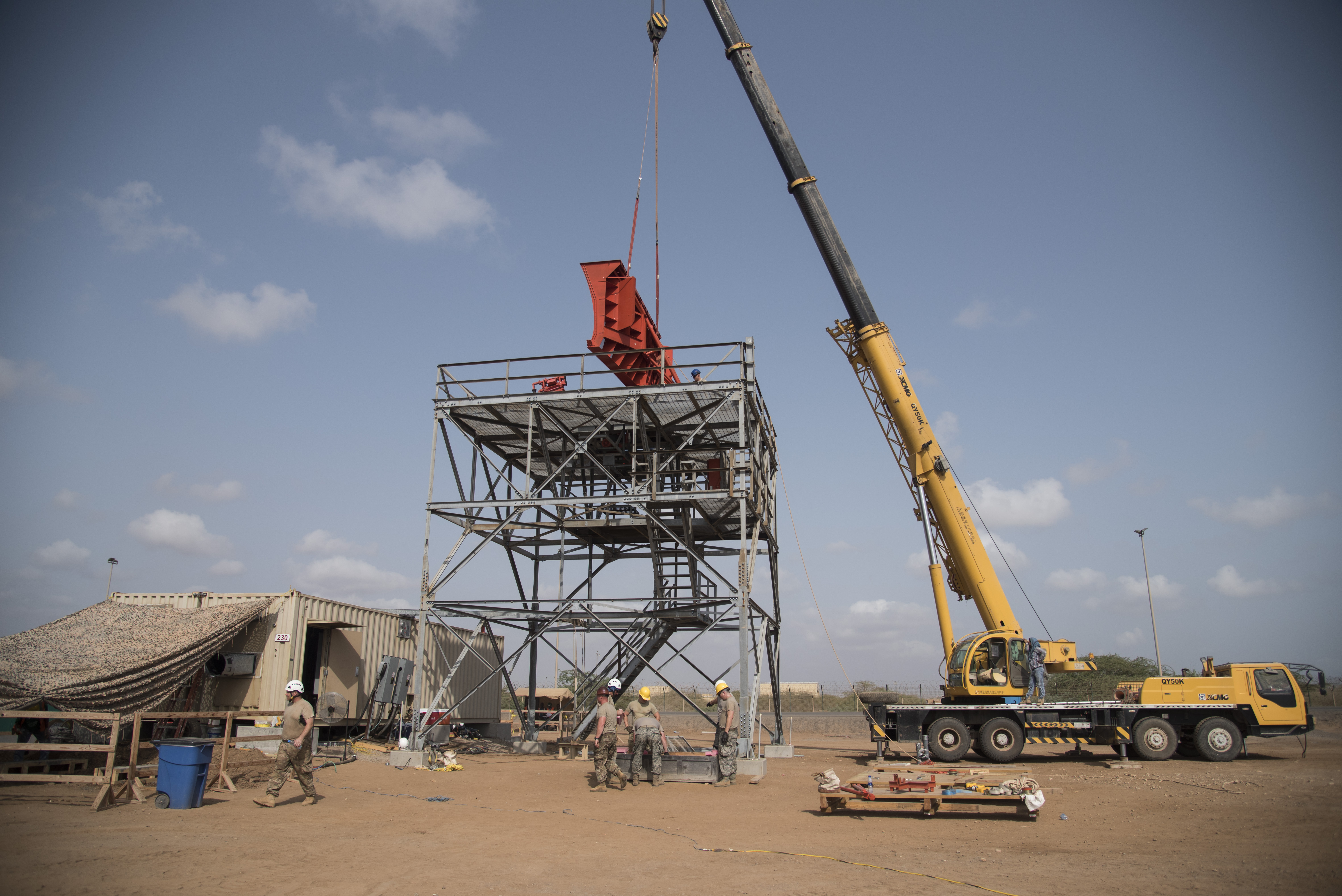 CAMP LEMONNIER, Djibouti- U.S. Air Force Airmen of the 205th Engineering Installation Squadron, out of Oklahoma City, line up pieces of the metal frame during construction of an AN/GPN-27 Airport Surveillance Radar System tower, May 26, 2016, at Camp Lemonnier, Djibouti. The new radar is a more permanent replacement for the short-term radar currently in operation. (U.S. Air Force photo by Staff Sgt. Tiffany DeNault)
