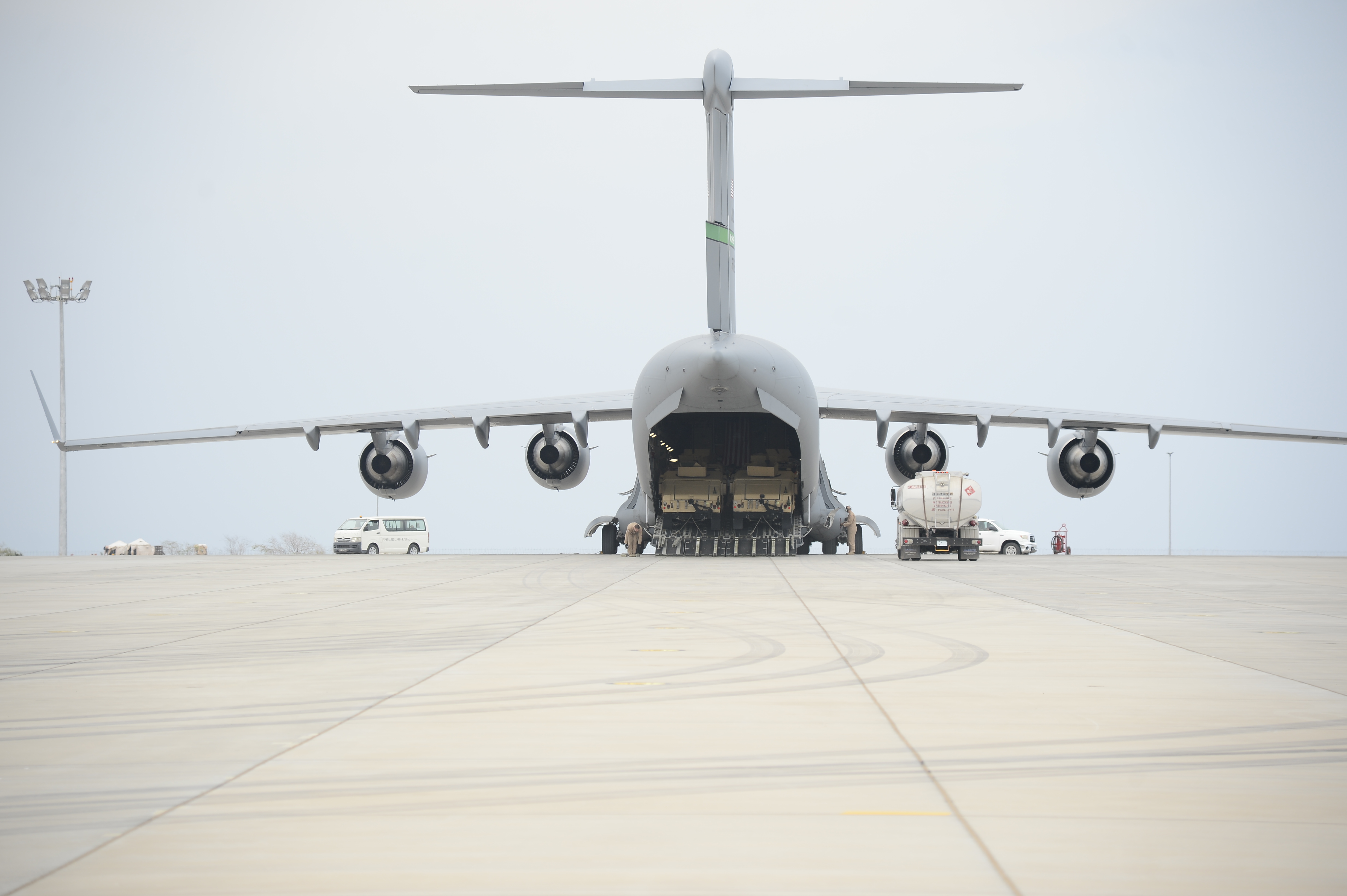 Humvees sit in a 62nd Airlift Wing C-17 at Camp Lemonnier waiting to be unloaded May 7, 2016. These eight Humvees, weighing 51 tons, are part of a larger shipment delivered to Task Force Seminole, who perform security forces duties throughout the area. (U.S. Air Force photo by Senior Master Sgt. Jill Lavoie)