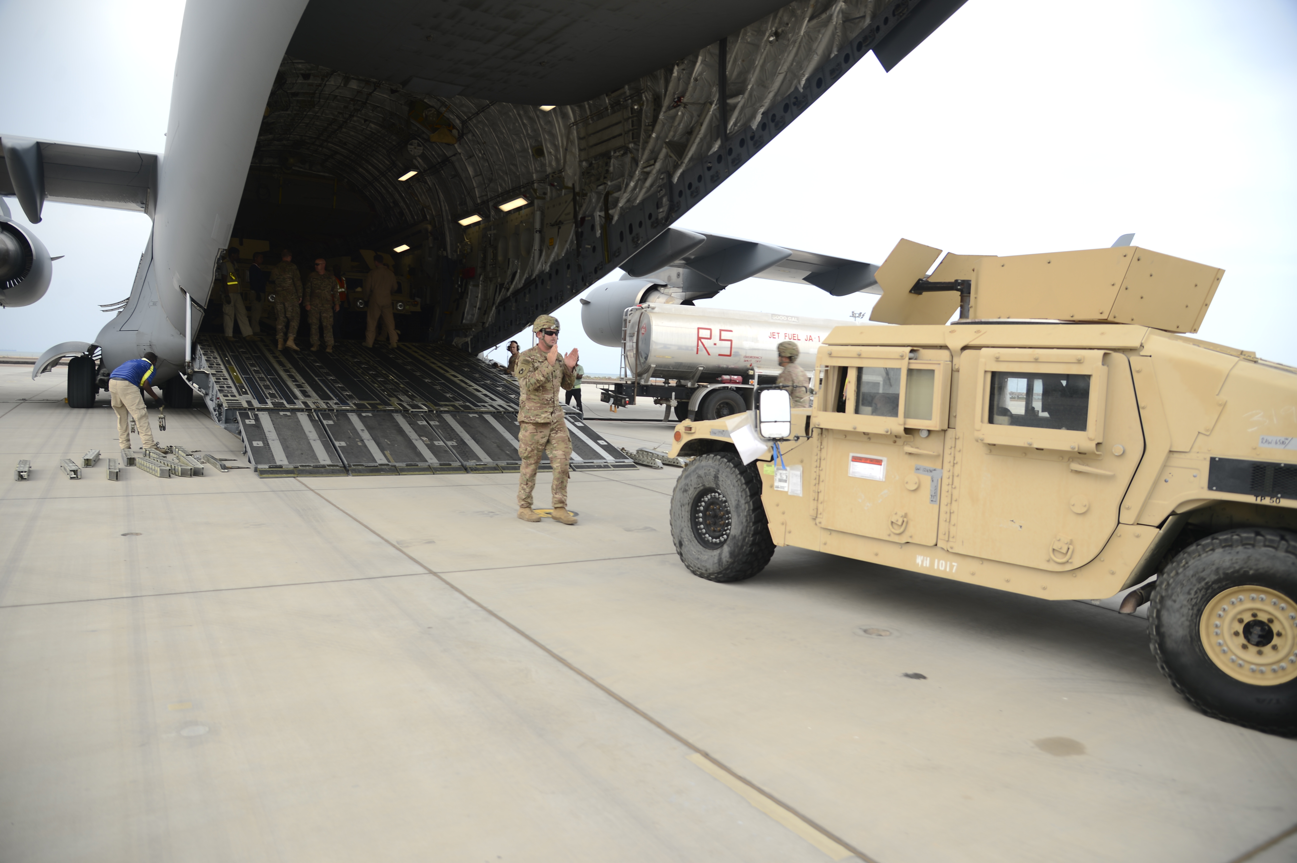 U.S. Army Spc. James Moss, 2nd Battalion, 124th Infantry Regiment, marshals the last of eight 1151 humvees that were transported via C-17 to Camp Lemonnier May 7, 2016. The up armored vehicles will increase the mission capable rate and therefore enhance security forces capabilities in the Combine Joint Task Force-Horn of Africa area of responsibility. (U.S. Air Force photo by Senior Master Sgt. Jill Lavoie/Released)
