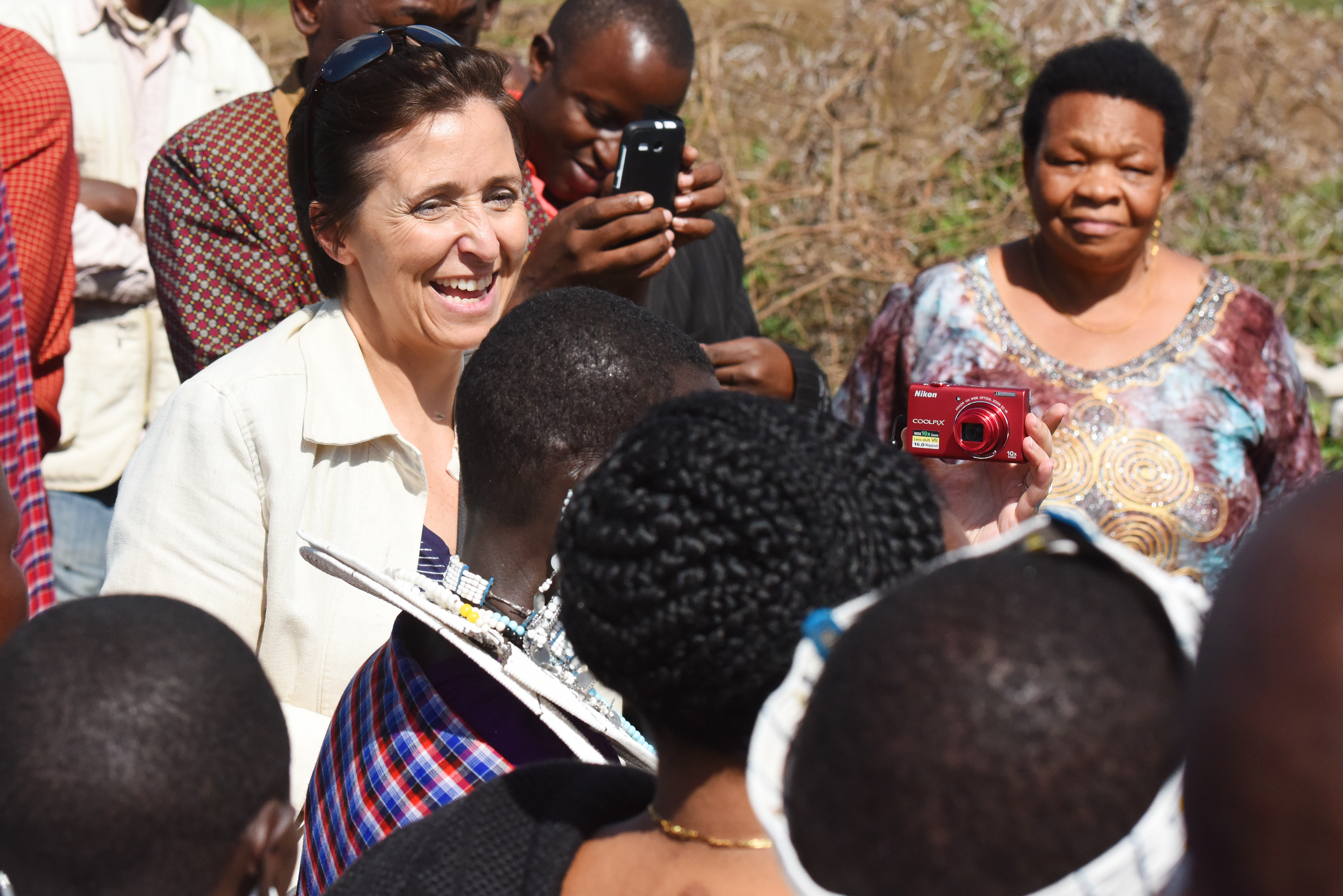 U.S. Navy Cmdr. Kimberly Walz, Combined Joint Task Force-Horn of Africa Theater Security Cooperation deputy director, interacts with Maasai Tribe members during the Gender Mainstreaming Seminar cultural day May 21, 2015 in Tanzania. The tribe welcomed their visitors with singing and dancing. (U.S. Air Force photo by Staff Sgt. Maria Bowman)