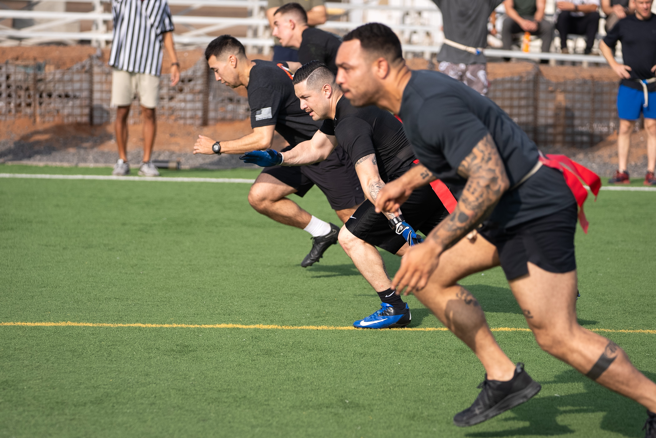 U.S Service members play against each other in a cross national football game at Camp Lemonnier, Djibouti Nov. 23, 2023. Langley visited troops stationed at Camp Lemonnier for a day of Thanksgiving festivities. (U.S. National Guard photo by Sgt. Jalen Miller)