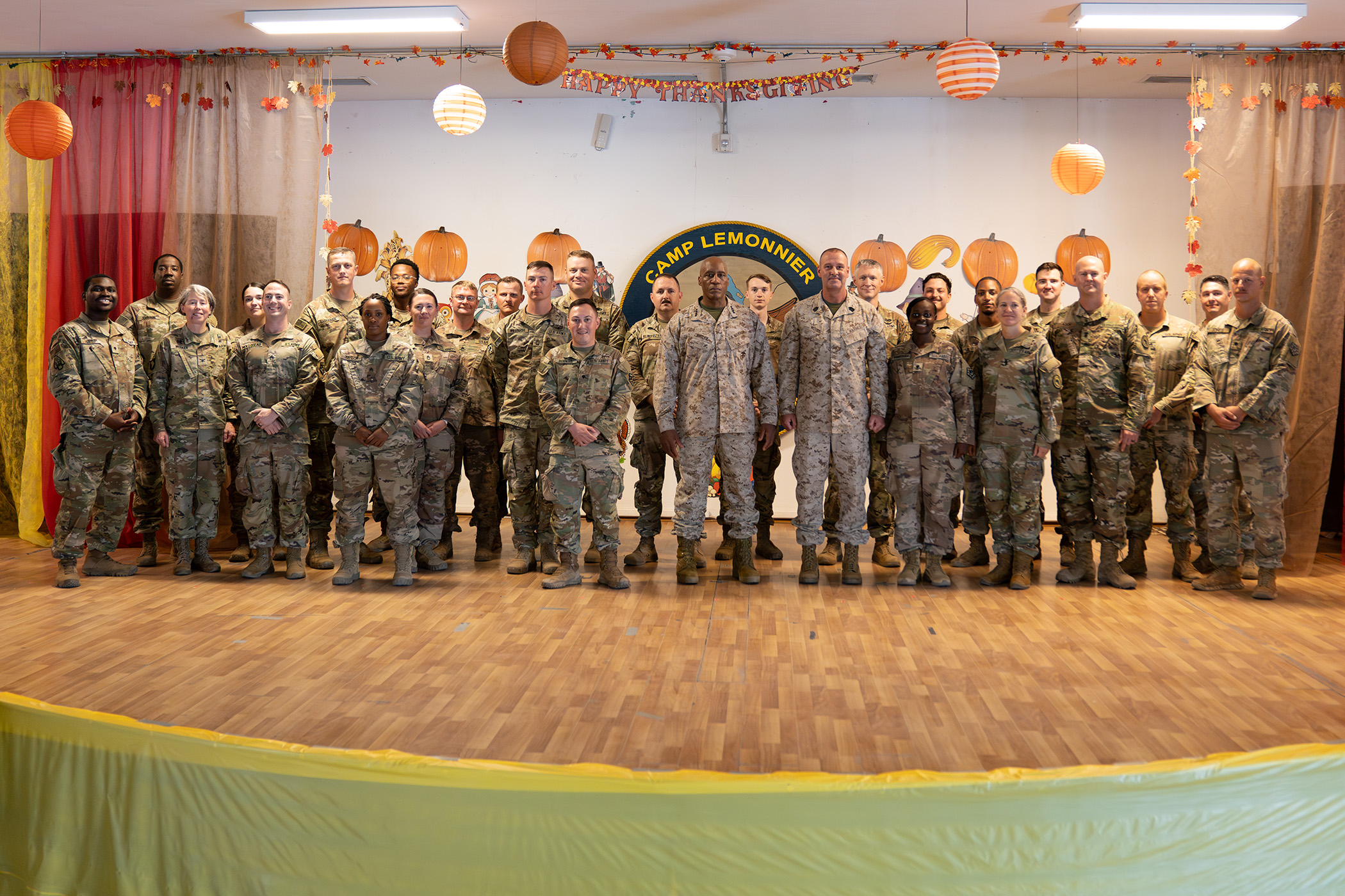 U.S. Africa Command leaders pose for a group photo with service members from the Combined Joint Task Force-Horn of Africa during a visit to Camp Lemonnier, Djibouti, Nov. 22, 2023. Langley spent part of his visit to the installation engaging with troops currently deployed to the Horn of Africa. (Department of Defense photo by U.S. Air Force Staff Sgt. Dylan Gentile)