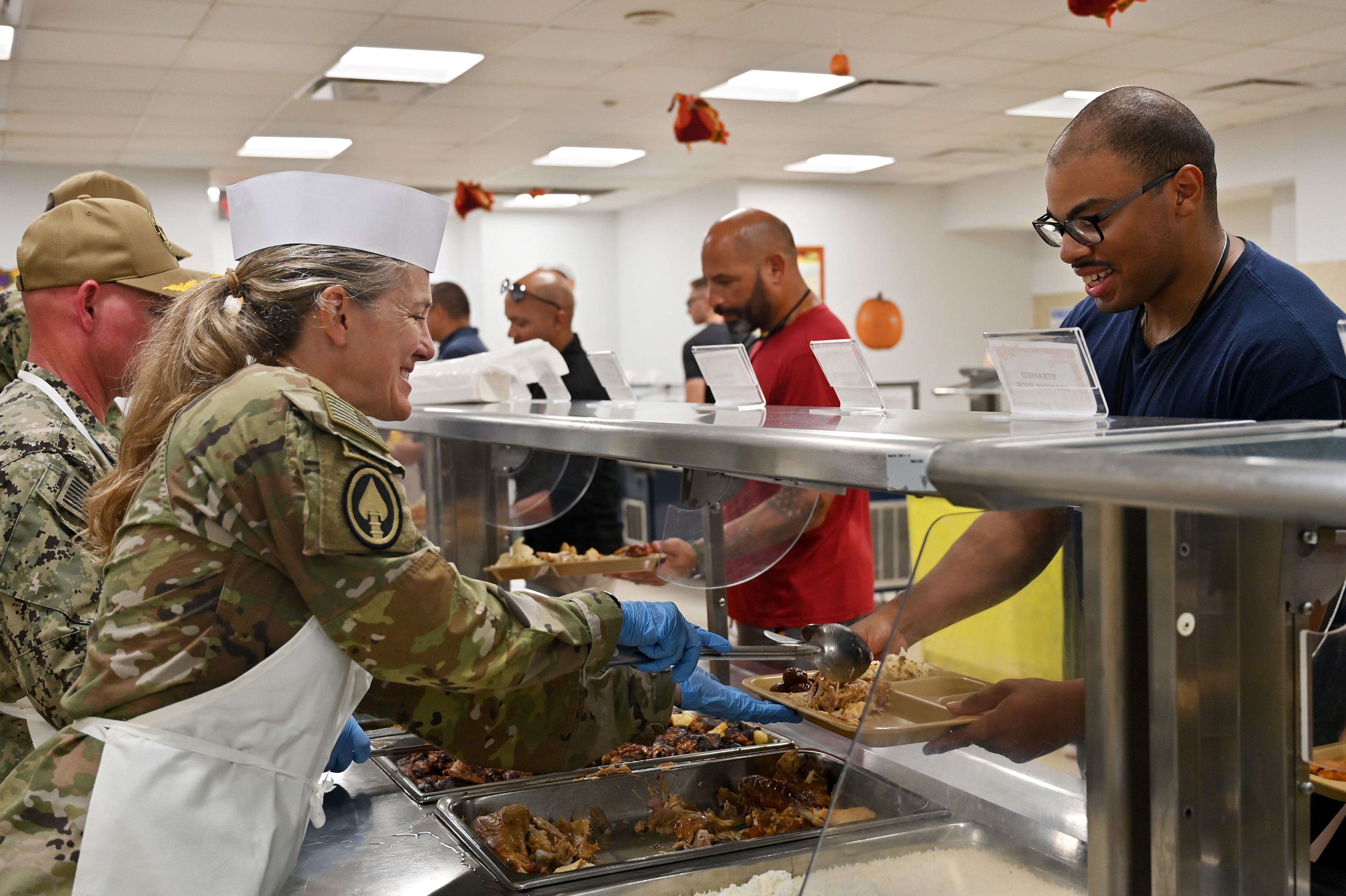 U.S. Army Maj. Gen. Jami Shawley, Combined Joint Task Force-Horn of Africa commanding general, serves a Thanksgiving meal to service members deployed to Camp Lemonnier, Djibouti, Nov. 23, 2023. U.S. Africa Command senior leaders visited service members deployed to Camp Lemonnier during the holidays. (Department of Defense photo by U.S. Air Force Master Sgt. Jerilyn Quintanilla)