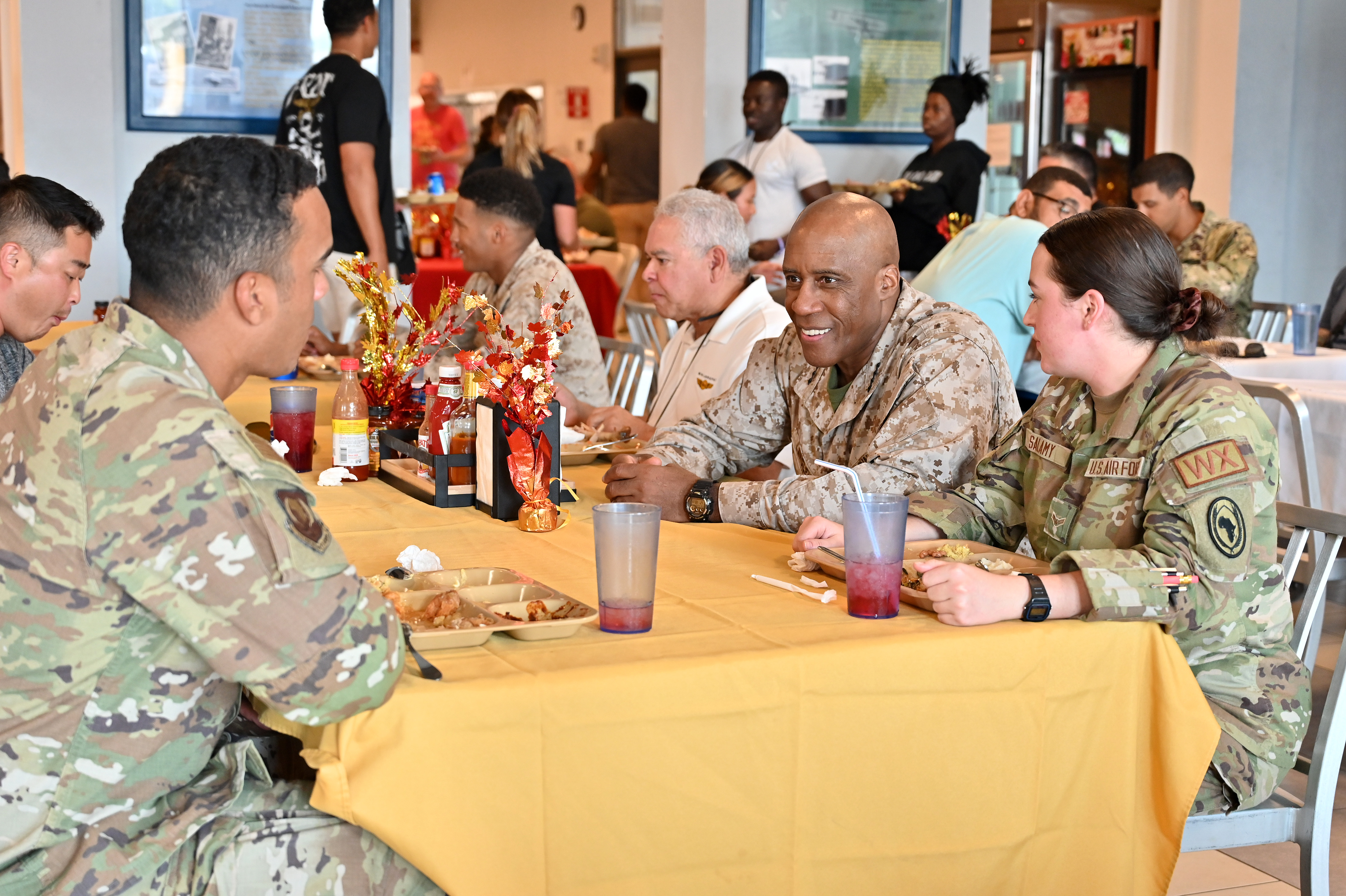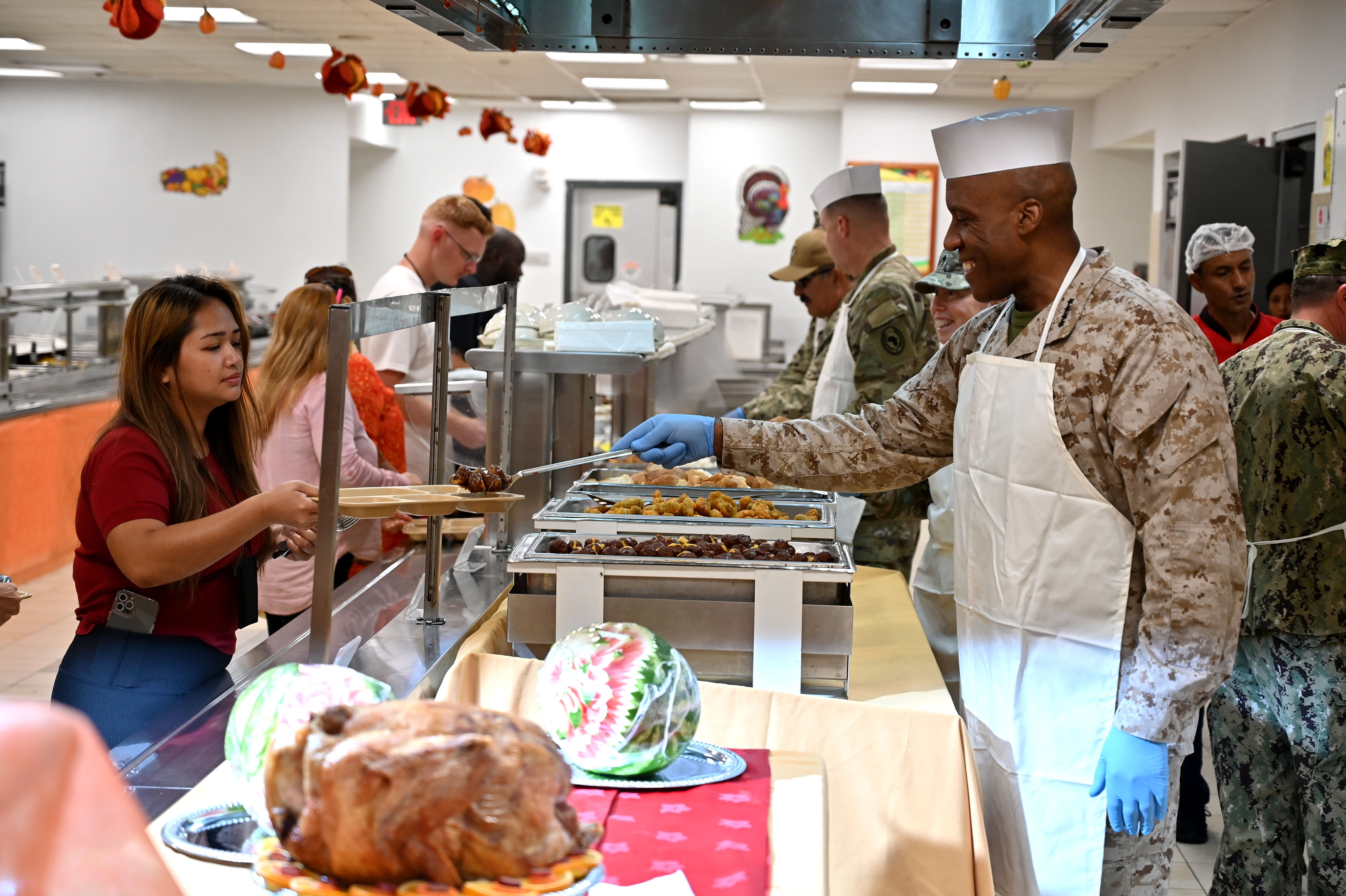 U.S. Marine Corps Gen. Michael Langley, commander of U.S. Africa Command, serves a Thanksgiving meal to service members deployed to Camp Lemonnier, Djibouti, Nov. 23, 2023. While visiting Camp Lemonnier, Langley presented awards to service members, attended a Turkey Bowl flag football game, and met with troops who are spending a holiday away from home. (Department of Defense photo by U.S. Air Force Master Sgt. Jerilyn Quintanilla)