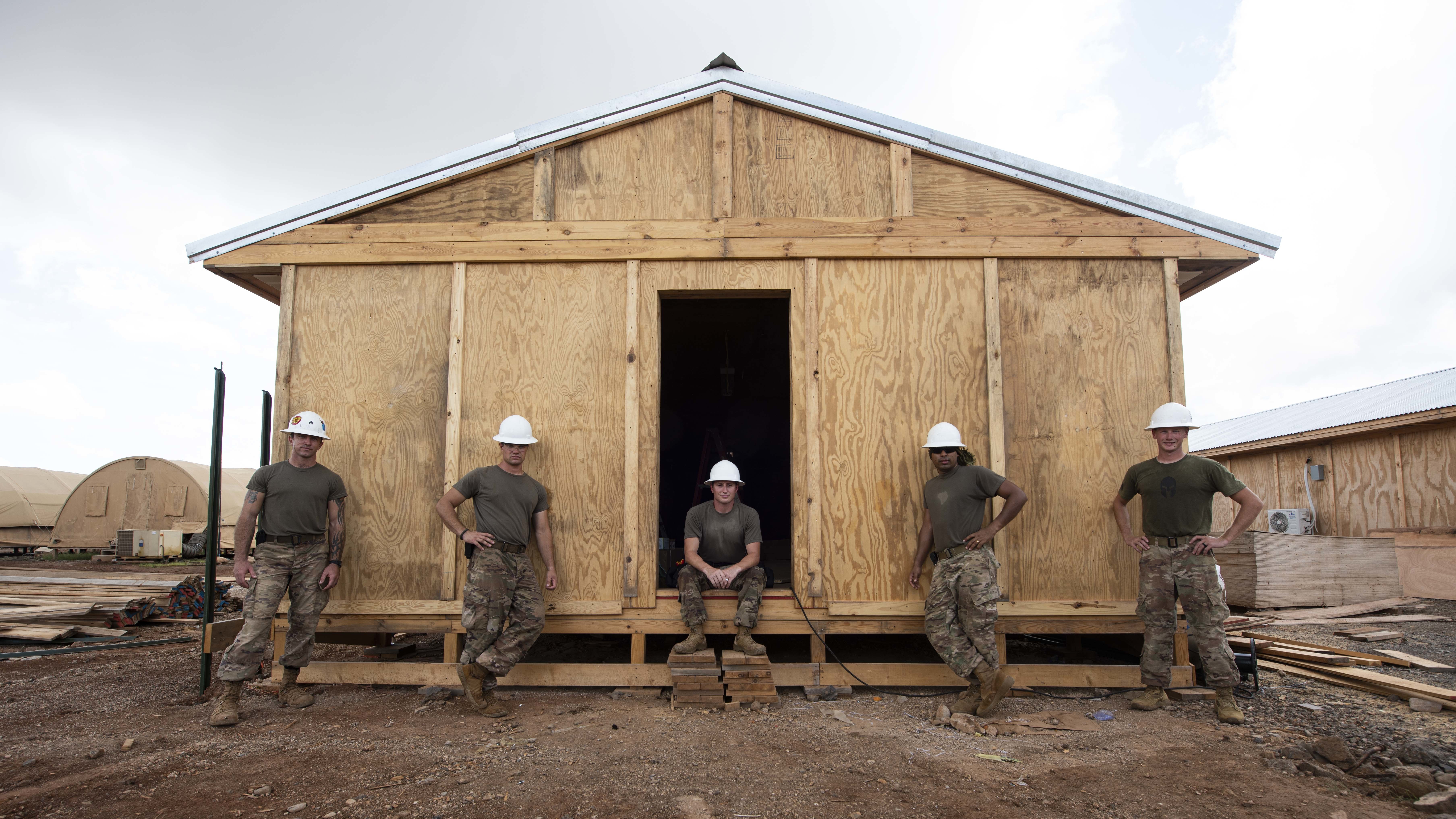 U.S. Army vertical construction engineers, 492nd Engineer Vertical Construction Company (EVCC), Combined Joint Task Force-Horn of Africa, take a break during the construction of a new building within the Djibouti Base Cluster, Djibouti, May 8, 2020. The 492nd EVCC performs construction projects throughout East Africa in support of CJTF-HOA. (U.S. Air Force photo by Senior Airman Gage Daniel)