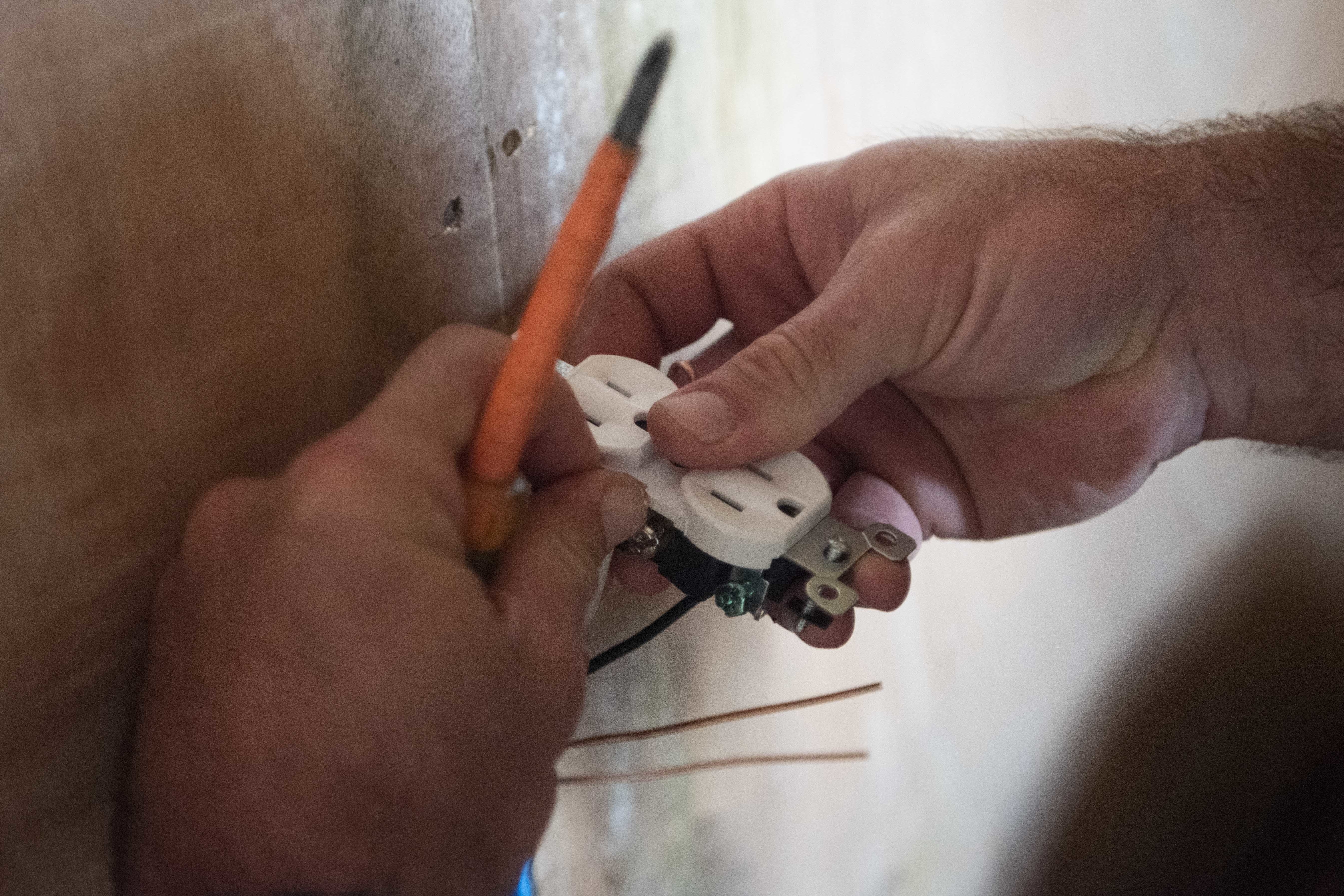 U.S. Army Sgt. Chris Benedict, vertical construction engineer, 492nd Engineer Vertical Construction Company (EVCC), Combined Joint Task Force-Horn of Africa, installs an electrical outlet during the construction of a new building within the Djibouti Base Cluster, Djibouti, May 8, 2020. The 492nd EVCC performs construction projects throughout East Africa in support of CJTF-HOA. (U.S. Air Force photo by Senior Airman Gage Daniel)