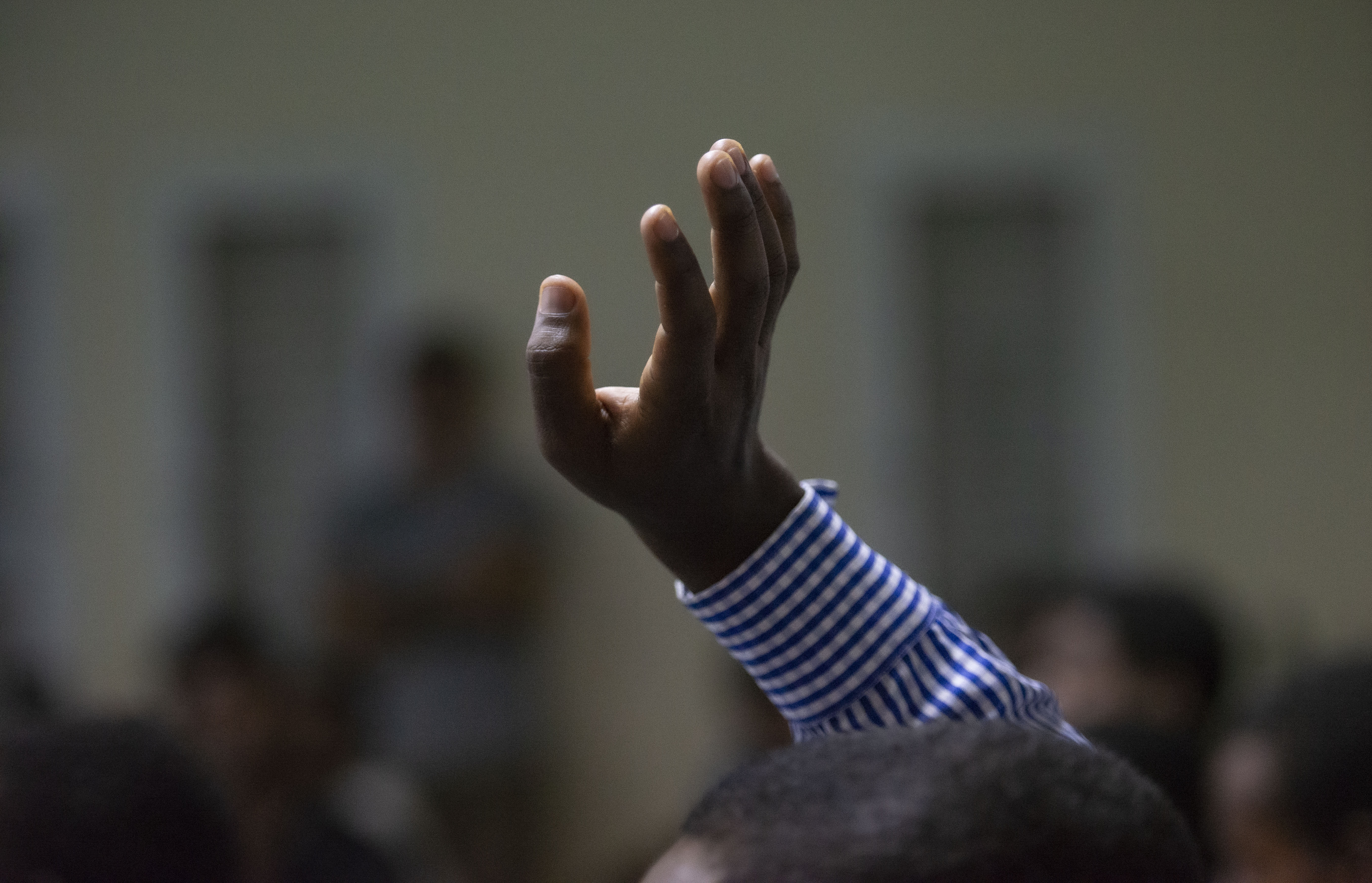 A Djiboutian student raises his hand during a weekly English discussion group (EDG) in Balbala, Djibouti, Aug. 30, 2019. The EDG, led by members from the 411th Civil Affairs Battalion, Combined Joint Task Force-Horn of Africa, serves as a “language laboratory” in which students develop practical linguistic and rhetorical skills through relationship building and information exchange. (U.S. Air Force photo by Senior Airman Gabrielle Spalding)