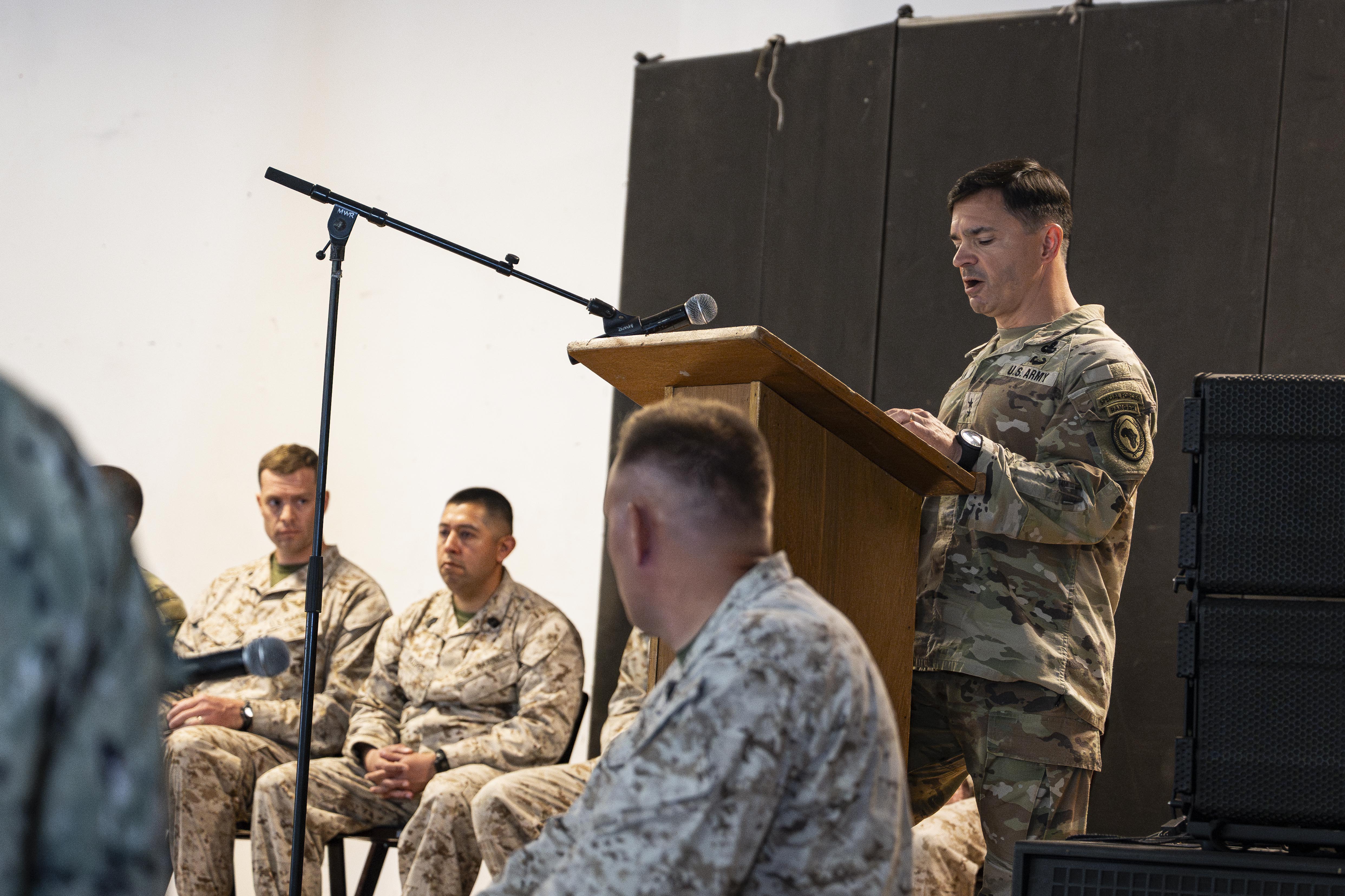 U.S. Army Maj. Gen. Brian Cashman, Combined Joint Task Force - Horn of Africa commanding general, gives opening remarks during a Transfer of Authority ceremony for Marine Medium Tiltrotor Squadron 266 and 161 at Camp Lemonnier, Djibouti, Apr. 1, 2025. The ceremony is a military tradition representing a formal transfer of authority and responsibility for a mission from one unit to the next. (U.S. Air Force photo by Airman 1st Class Joseph Bartoszek)