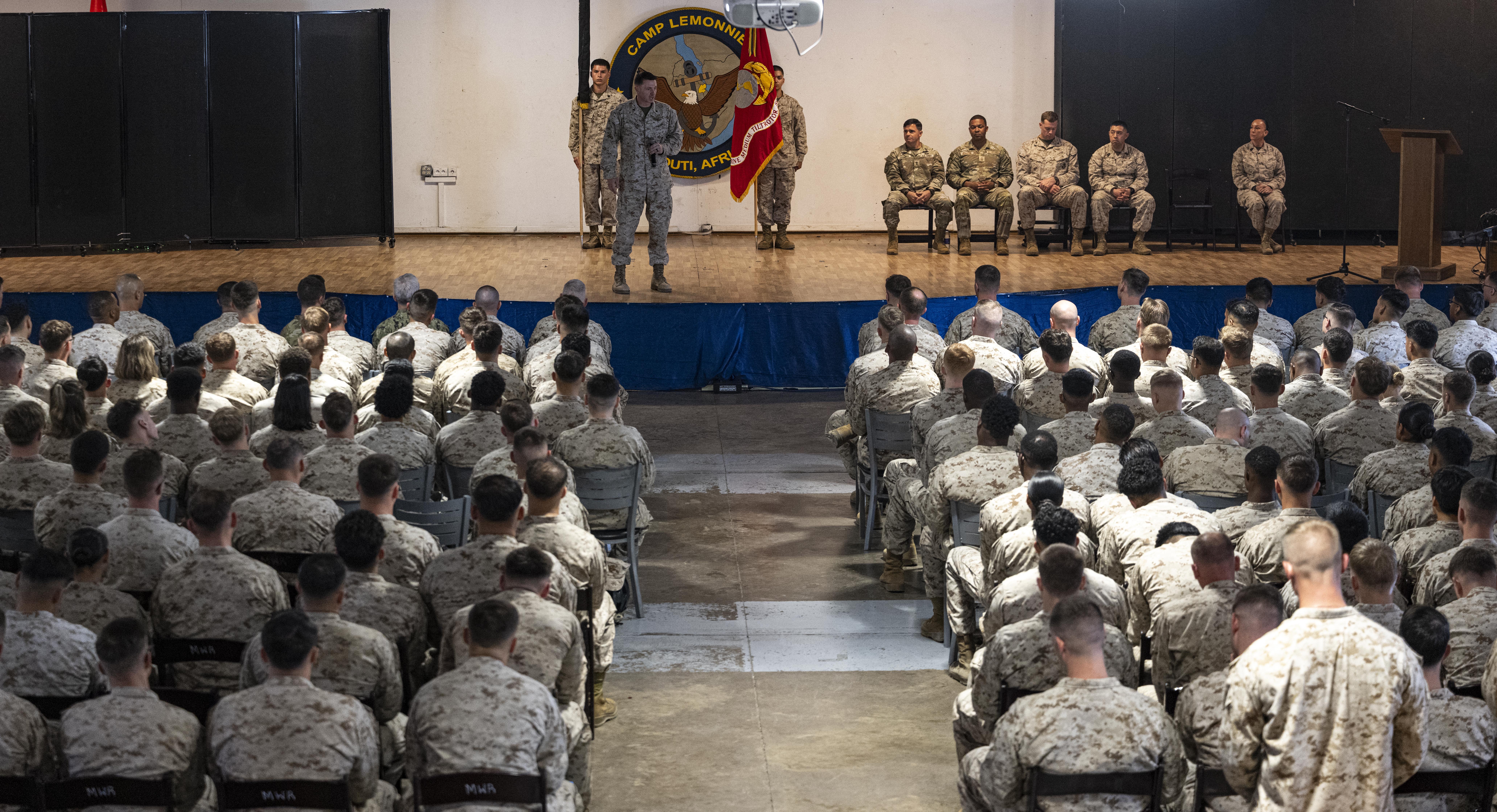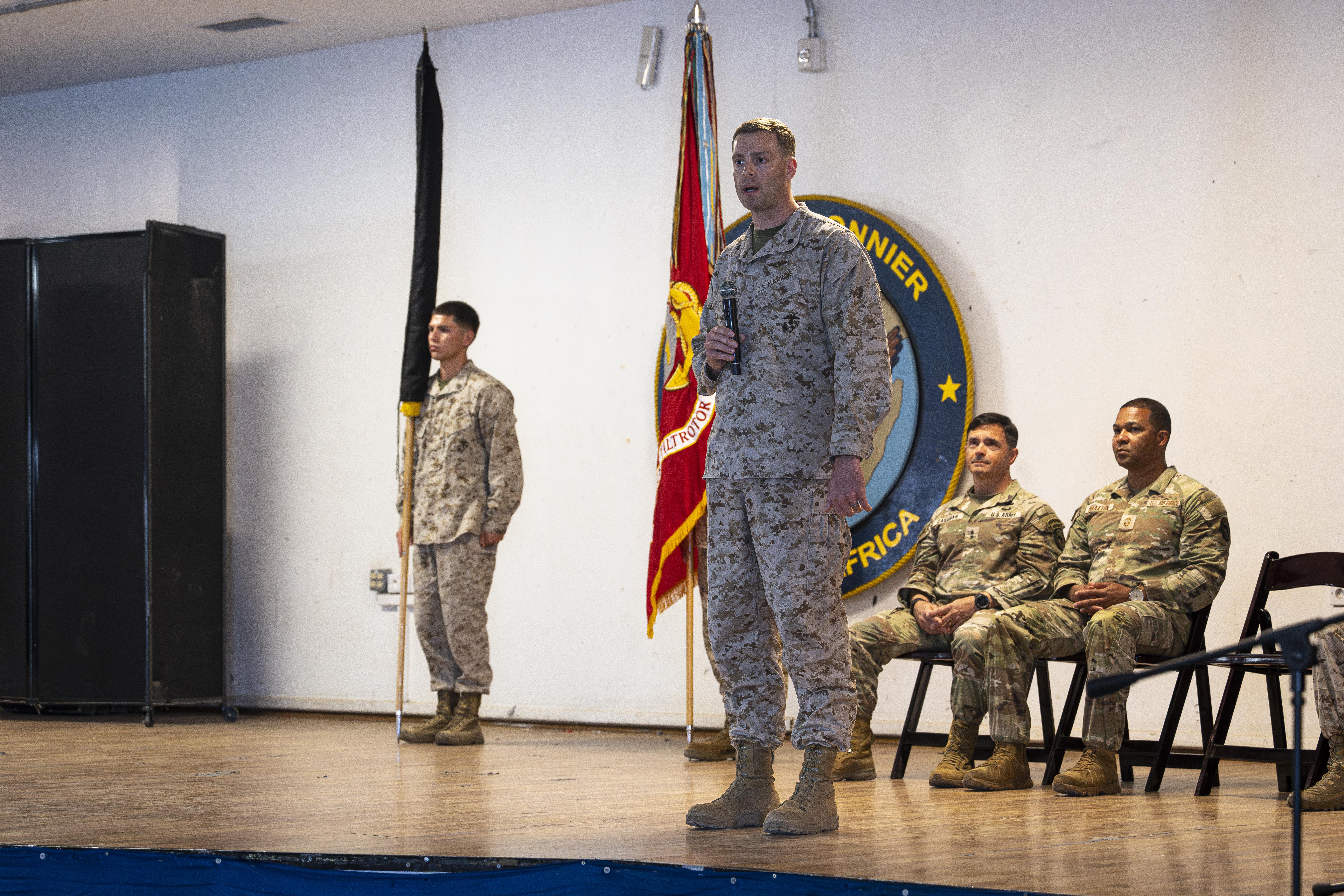 U.S. Marine Corps Lt. Col Jeff Pullinger, Marine Medium Tiltrotor Squadron 266 commander, gives outgoing remarks during a Transfer of Authority for Marine Medium Tiltrotor Squadron 266 and 161 at Camp Lemonnier, Djibouti, Apr. 1, 2025. VMM-266 conducted six multinational training events alongside local partner nation forces, strengthening partnerships vital to regional security. (U.S. Air Force photo by Airman 1st Class Joseph Bartoszek)